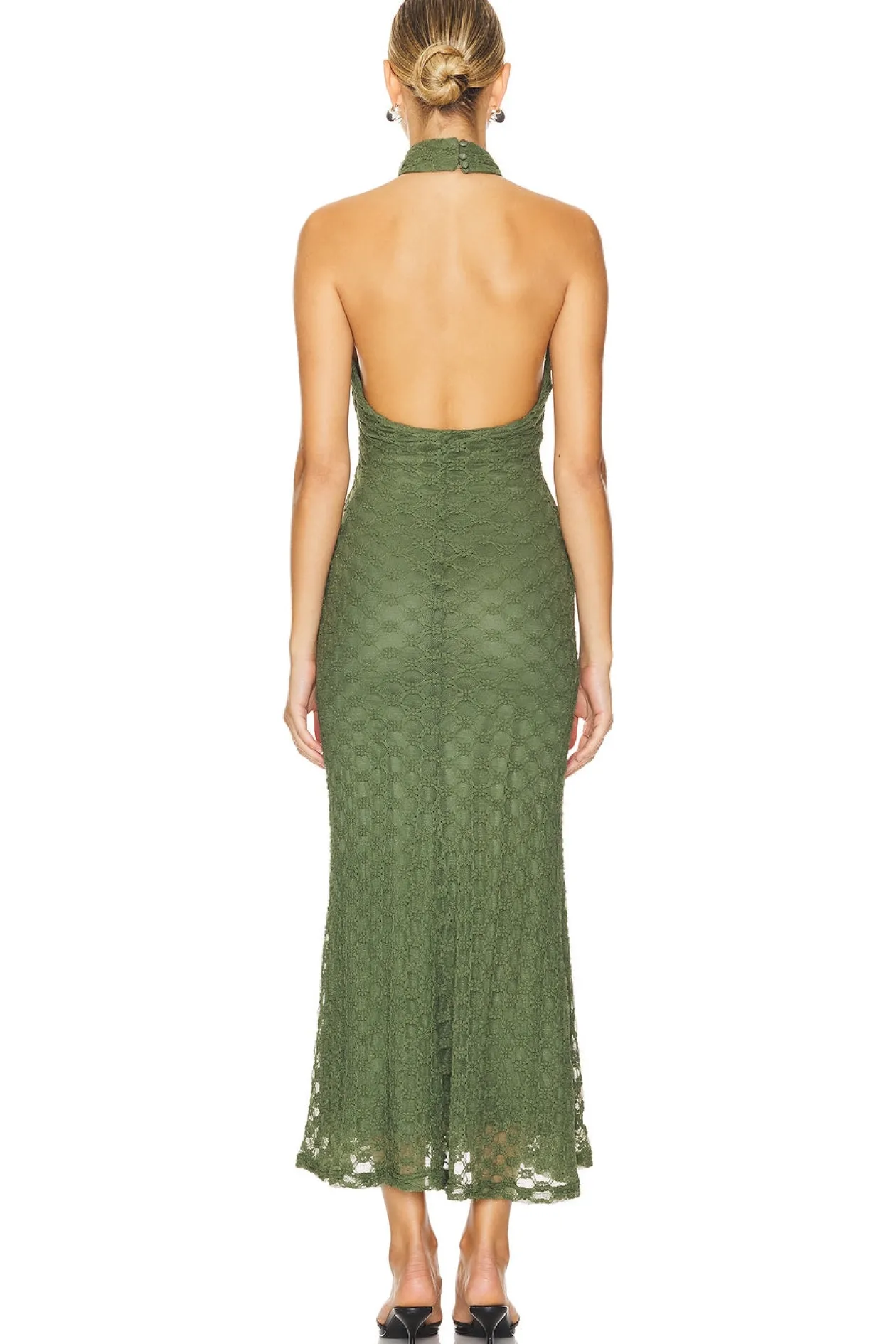 Occasion-worthy confidence. The Ola Lace Midi Dress is made from a high-quality, stretch lace fabrication. It features a sophisticated halter-neck design with an open back, fitted bodice and softly flared hem.