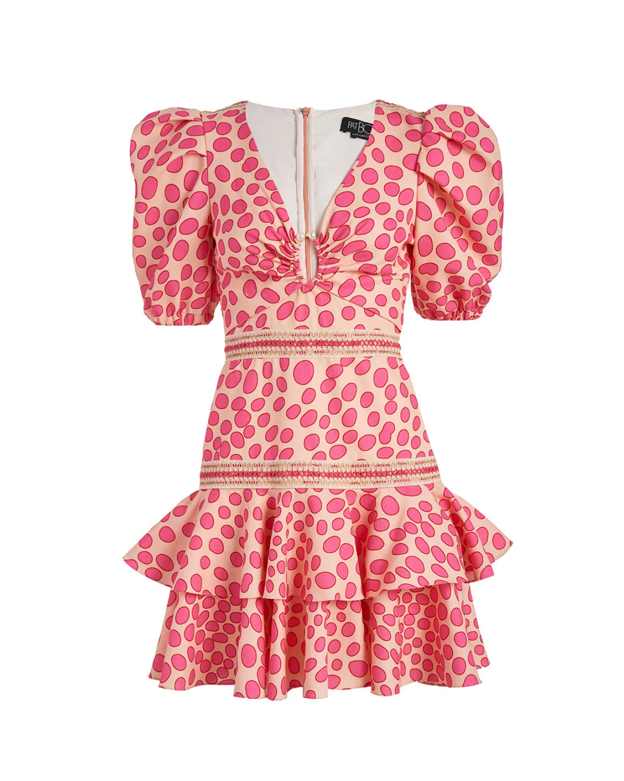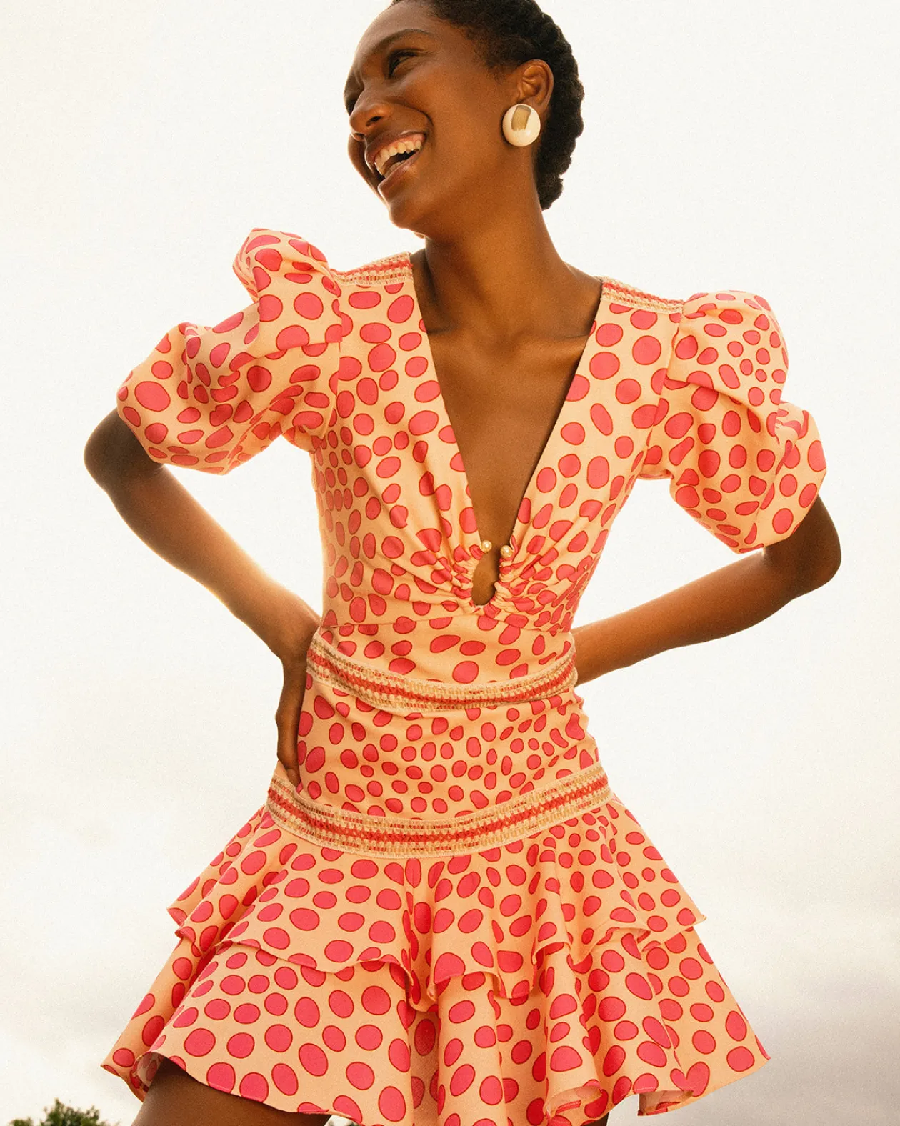 Fit-to-flare mini dress in a textured linen-like fabric in our original Bossa print. Short puff sleeves with elastic at cuff. V-neckline features brass hardware with faux pearl bead. Concealed back zipper. Fully lined. Runs true to size.