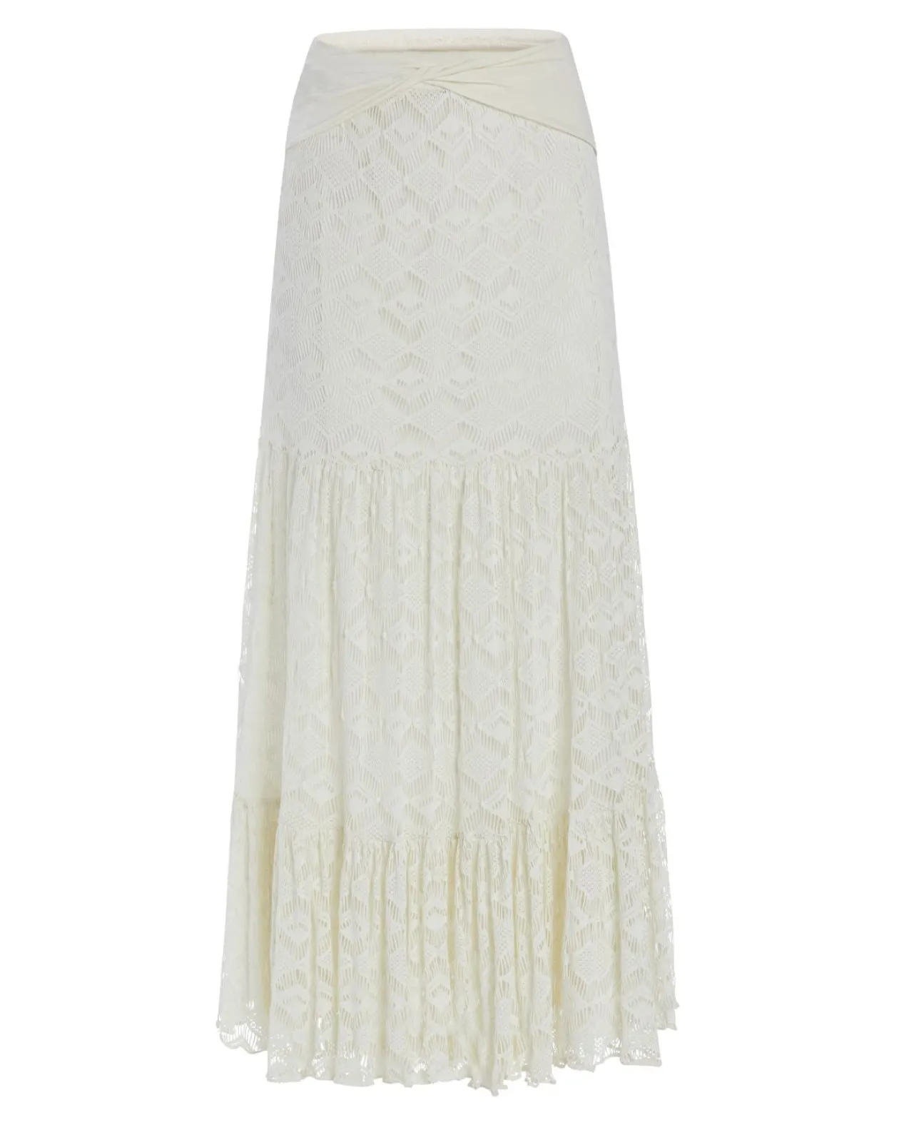 Flowy maxi beach skirt in a crochet fabric. Skirt is high waisted. Runs true to size. Model is wearing a size small.