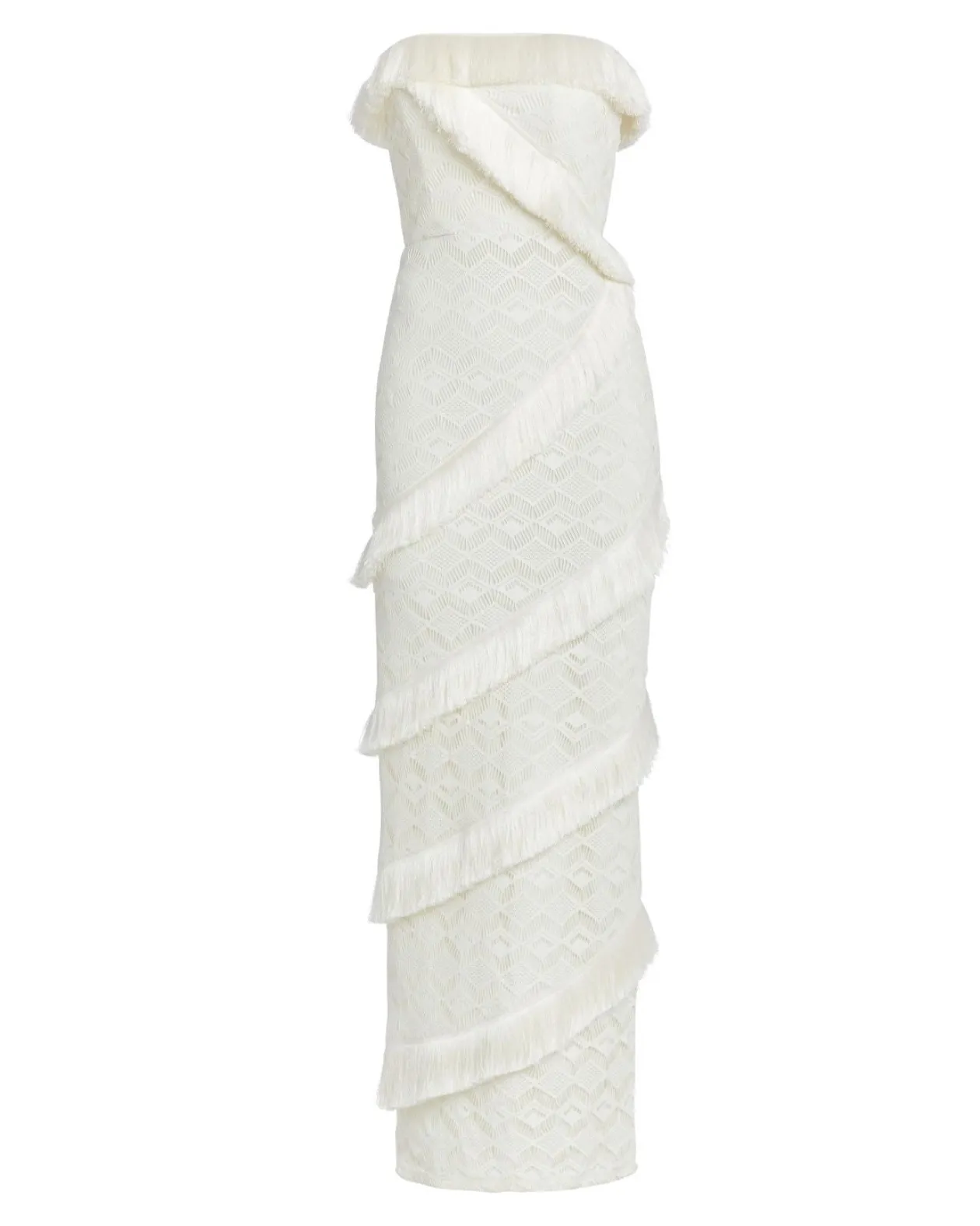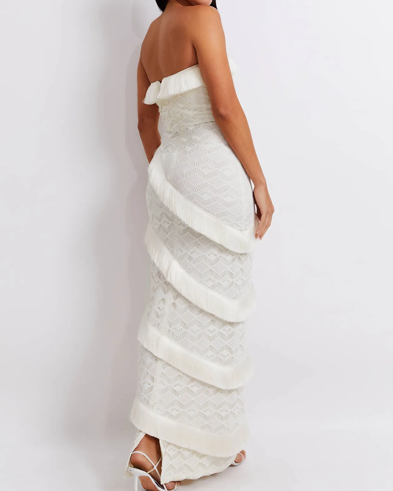 This strapless mini dress is made from crochet fabric and features fringe detail. Runs true to size. Model wears size 4.