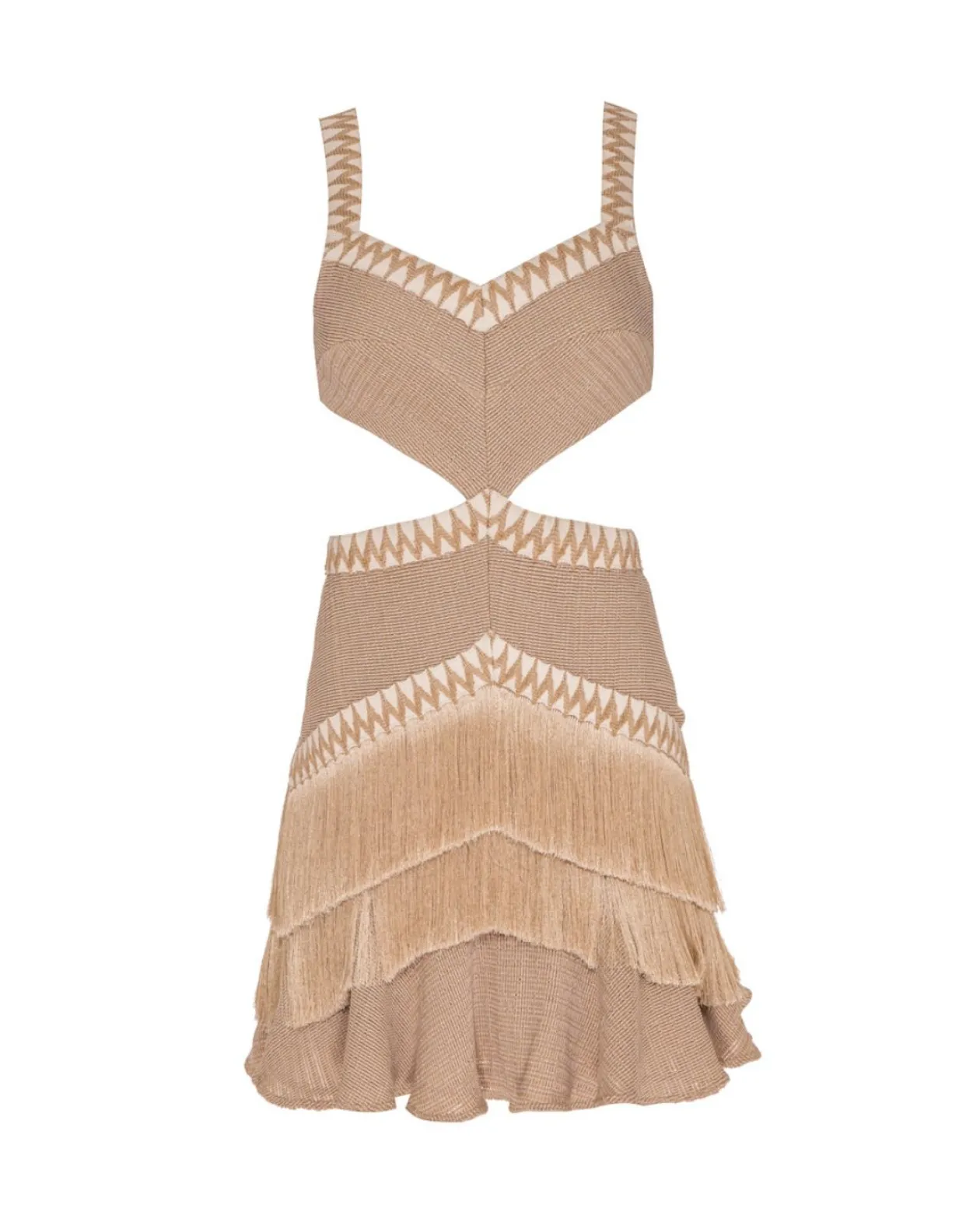 Mini dress features a bodice made from crocheted metallic trims that are hand-sewn together. Skirt features layers metallic fringe. Strategically-placed ribcage cut-outs and open back detail. Fully lined. Runs true to size. Model is wearing a size 4.