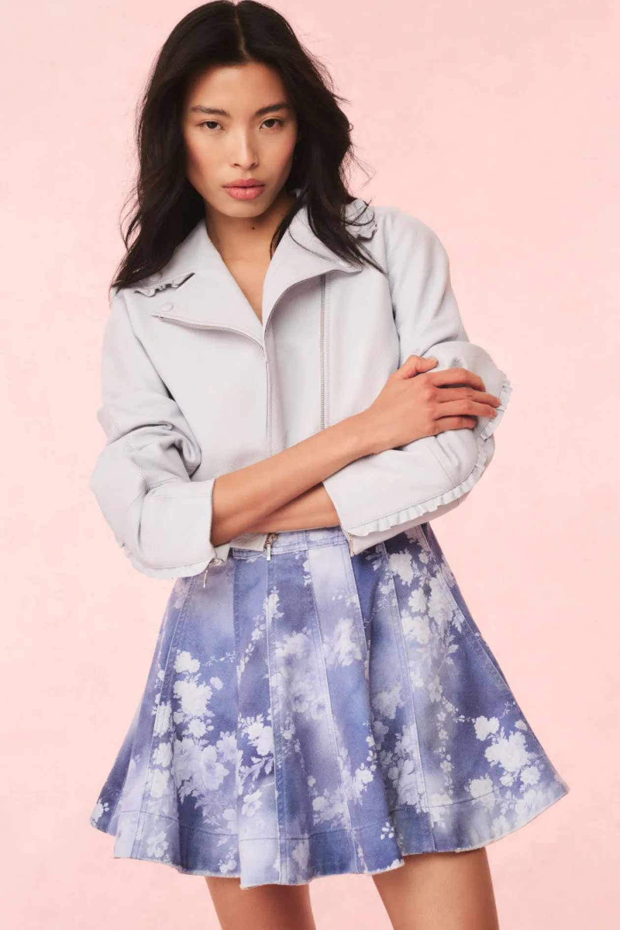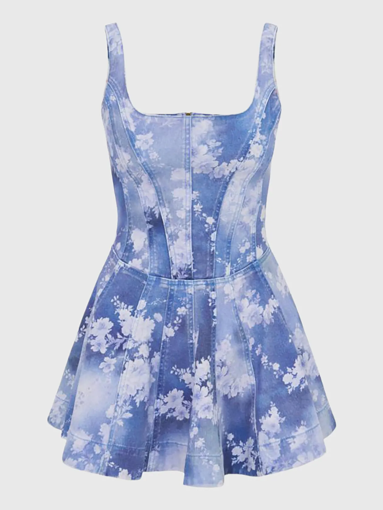 Introducing the Piero Dress. This denim mini dress arrives with a washed, hand-dyed look featuring a floral print all over. The bustier dress is flirty and playful with flattering princess seams at the body, a scoop neckline, and an A-Line mini skirt with pleated details. This piece is finished with a center back zipper.