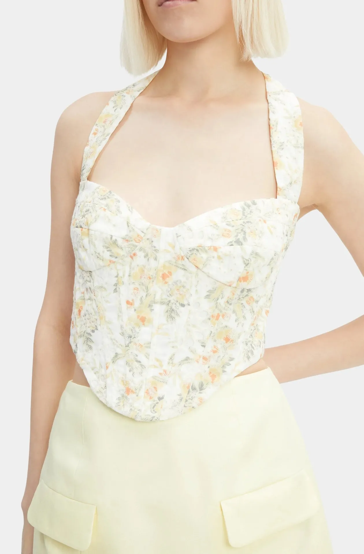 Introducing the Pollie Halter Corset Top, a must-have addition to your spring wardrobe. This cute yellow floral crop top effortlessly combines style and versatility, making it perfect for any occasion. Whether you’re dressing up for a night out or keeping it casual for a day in the sun, this floral halter top is your go-to choice. Embrace the essence of spring with its vibrant floral pattern and flattering corset design. Elevate your fashion game with the Pollie Halter Corset Top and make a statement wherever you go. Ideal for those who love to mix and match, this top is a staple for any fashion-forward woman.