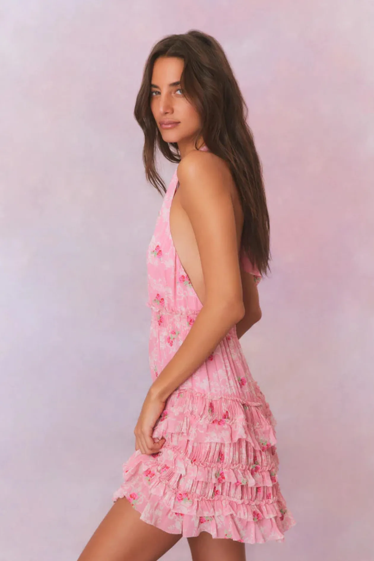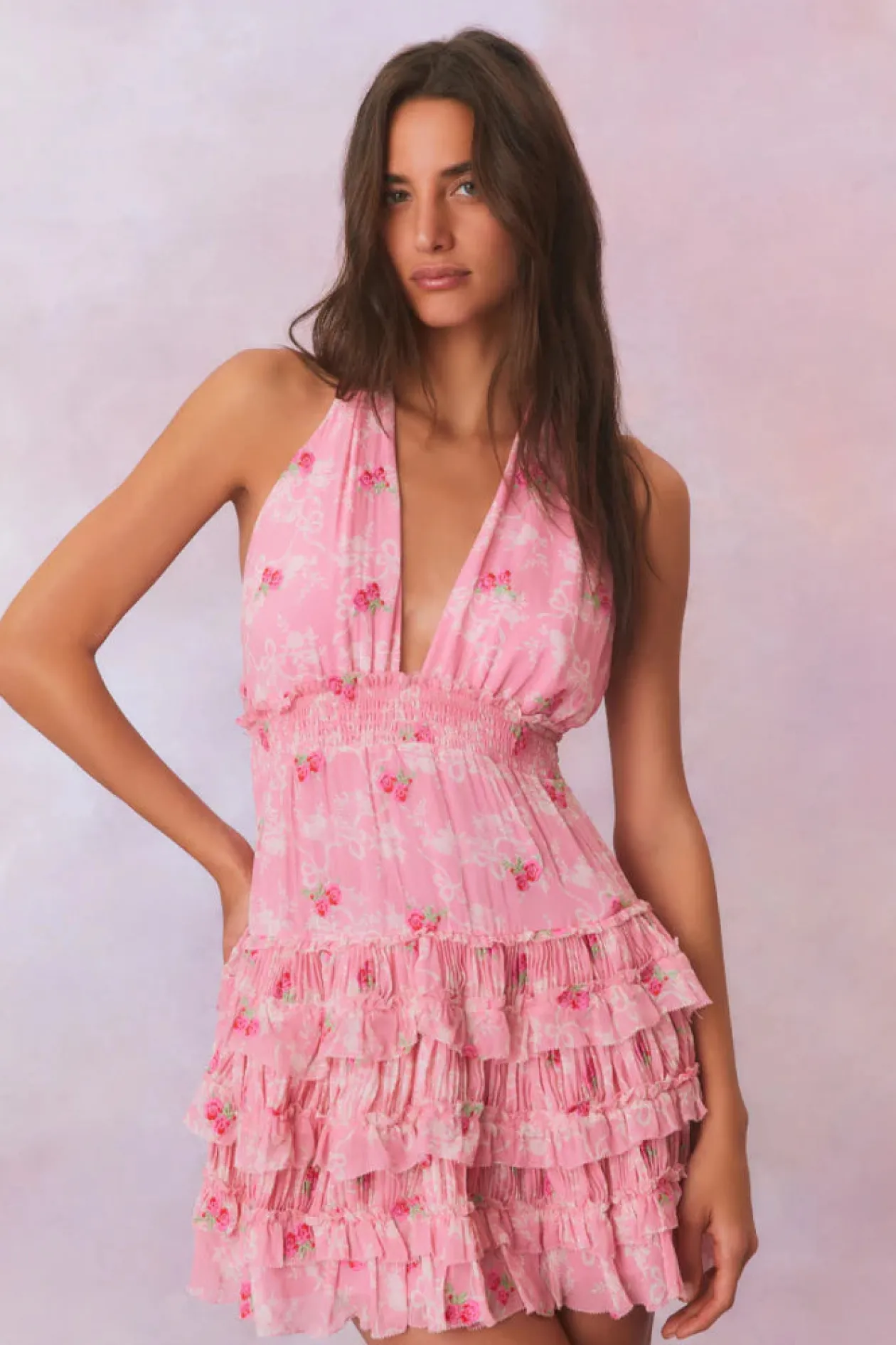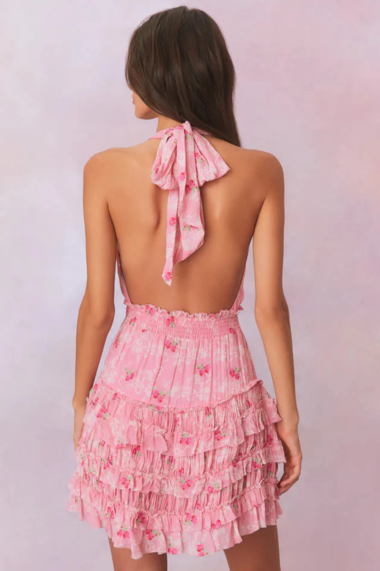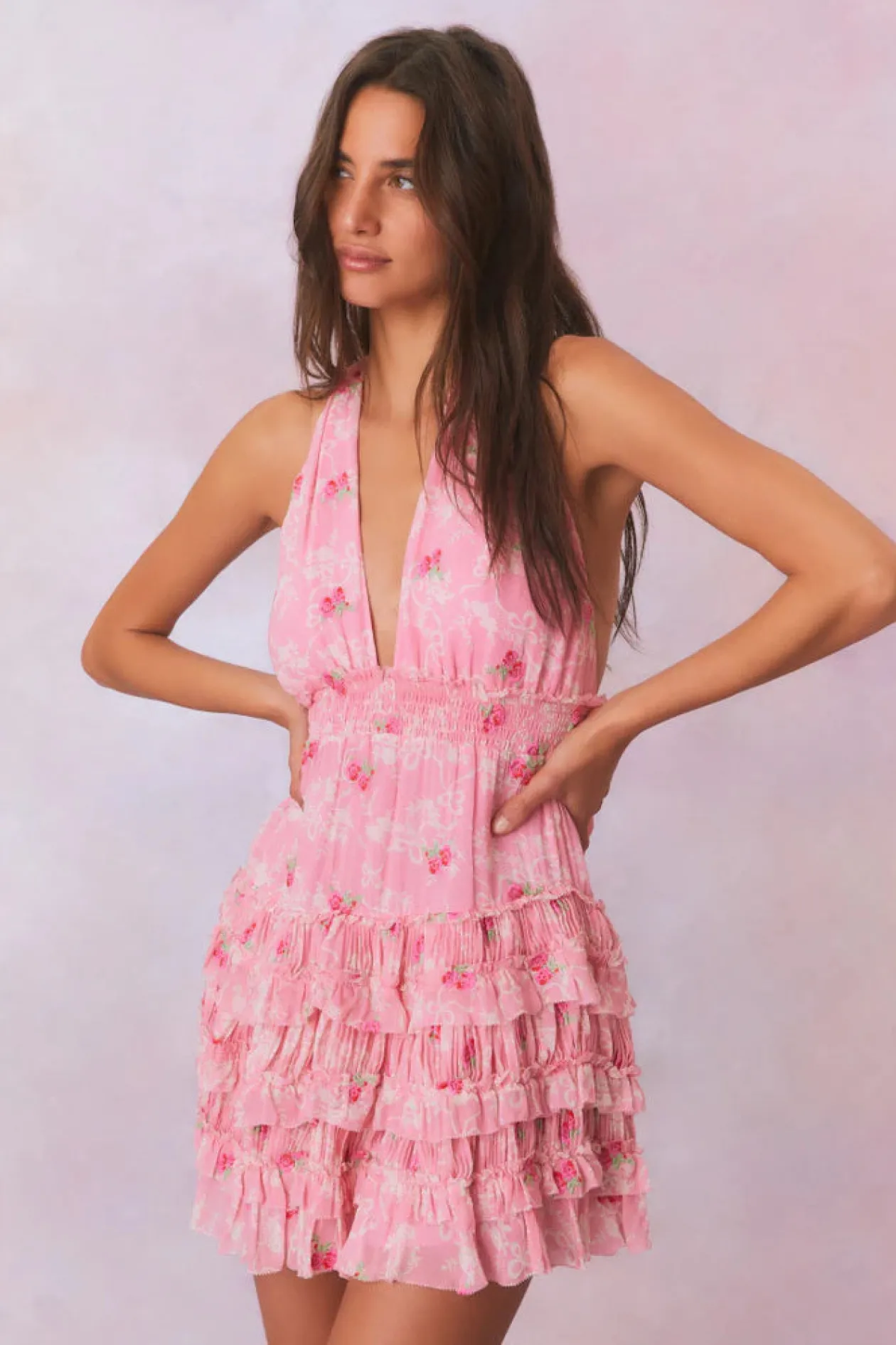 Introducing the Quintelle Dress. Our must-have mini of the season returns with a playful floral print on a chiffon fabric. A revamped version of our best-selling Deanna Dress, the Quintelle is a Victorian-inspired mini with a bow print and floral print all over. The dress has an elastic waistband making for easy wear, a smocked waist that releases into a flirty skirt with textured micro pleats and tiny ruffles.