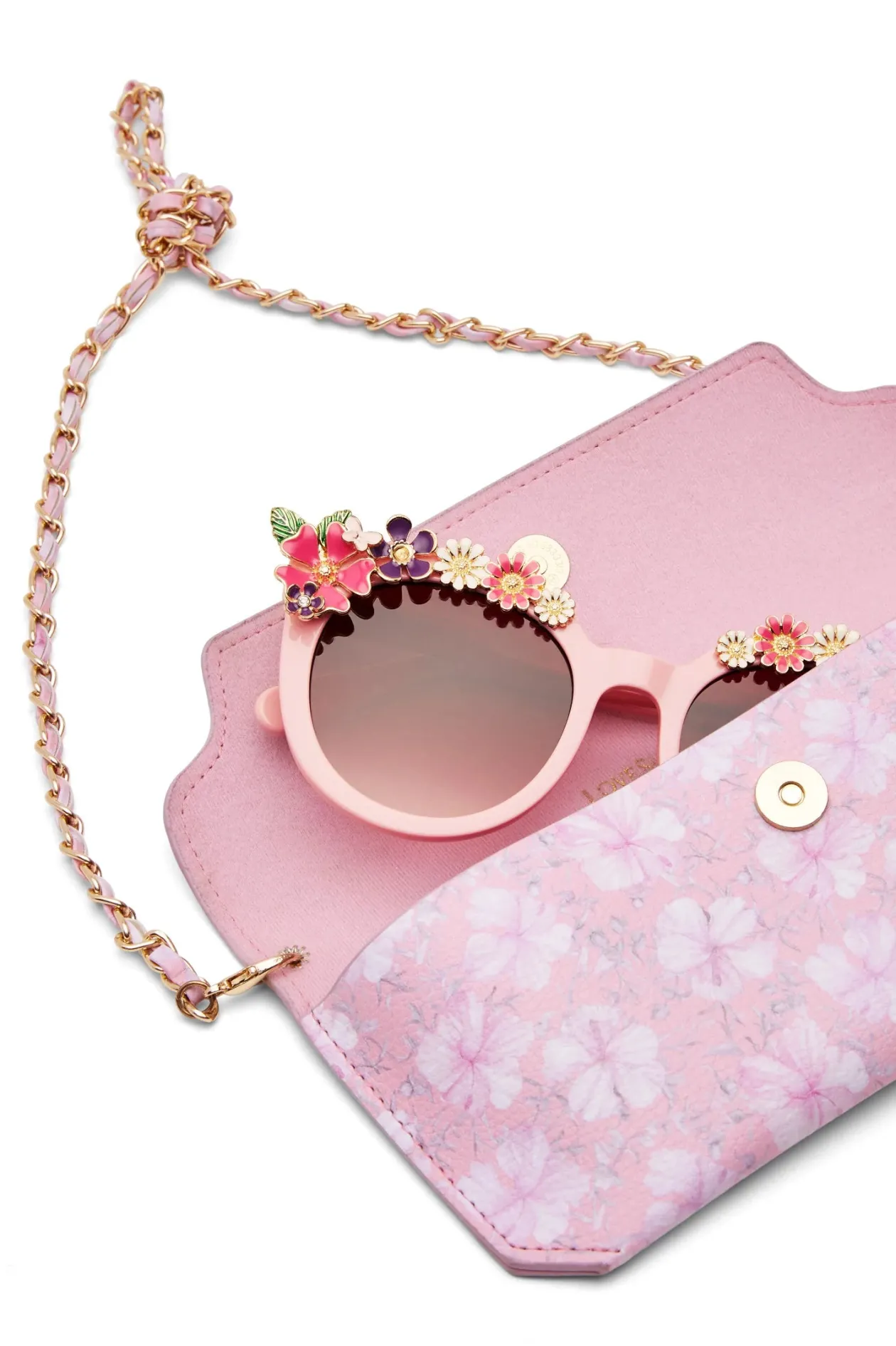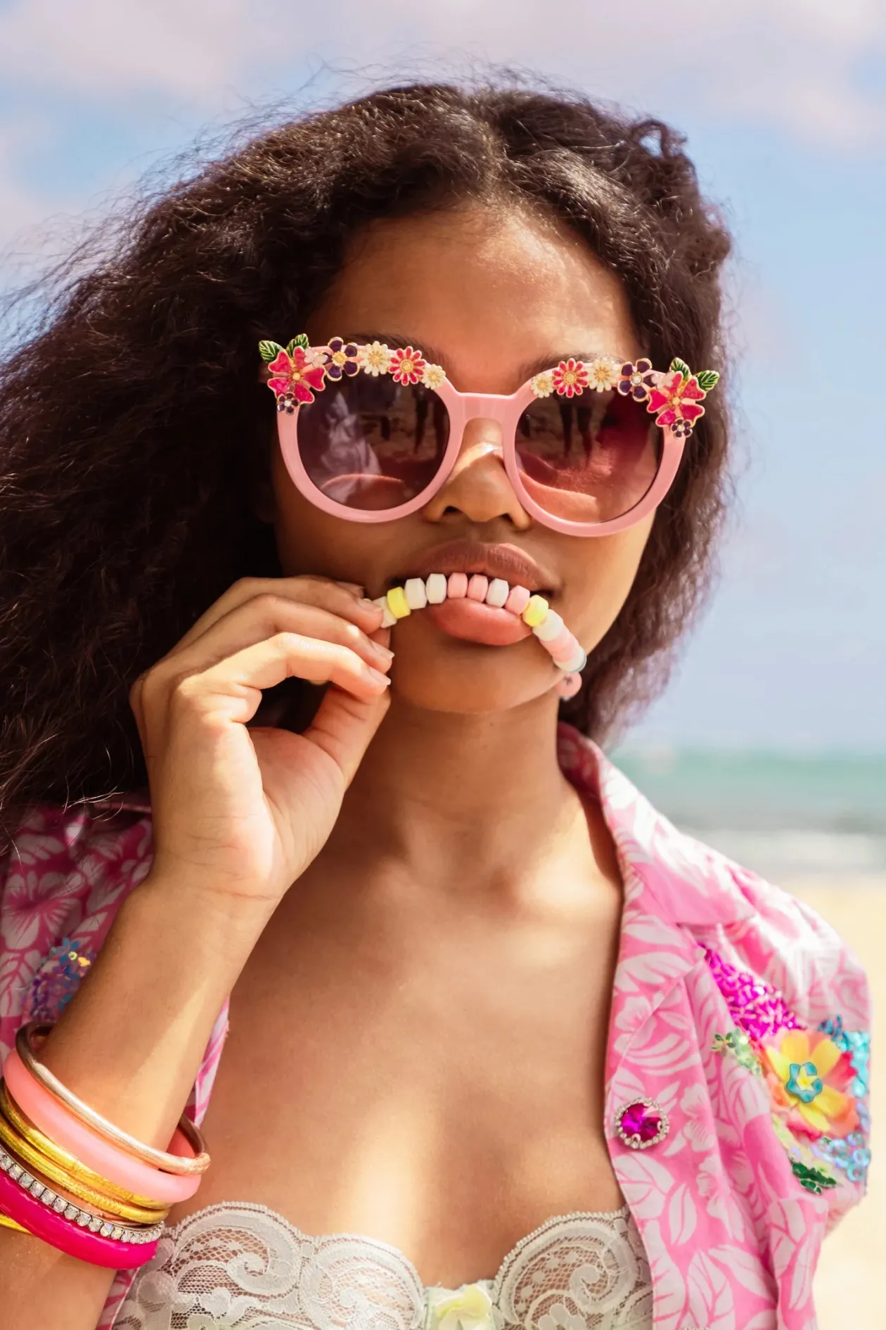 A floral dream come true, our Ravi shades stun with round, pink frames adorned in an array of flowers on the top of the lenses for the sweetest touch. Shown here in Peony Pink.