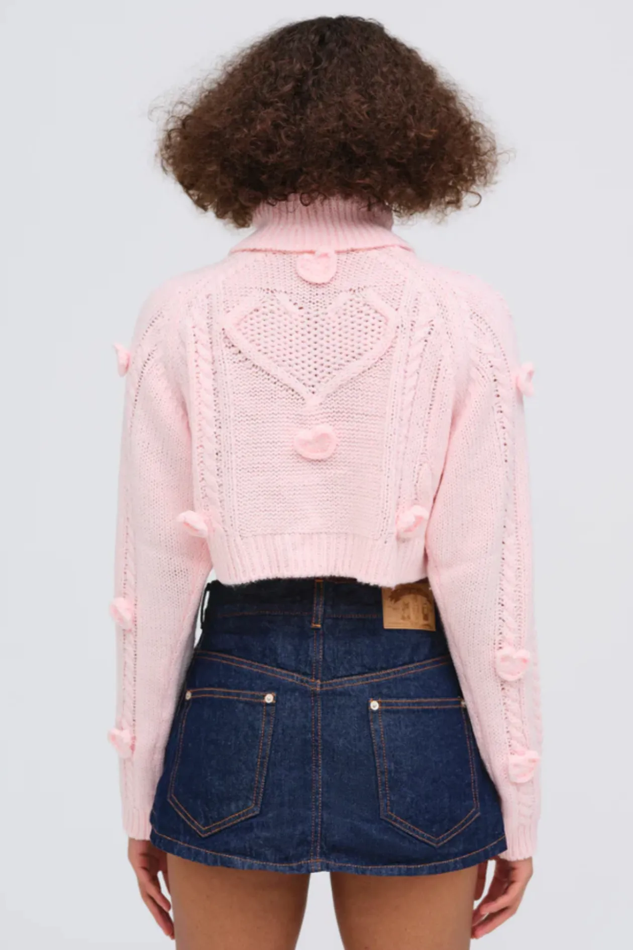 Designed to become a romantic essential in your everyday wardrobe—the Rebecca heart sweater exudes femininity. Crafted in a chunky cable knit, this cropped top also spotlights decorative knit hearts attached throughout and a turtleneck collar for the cozy-factor.