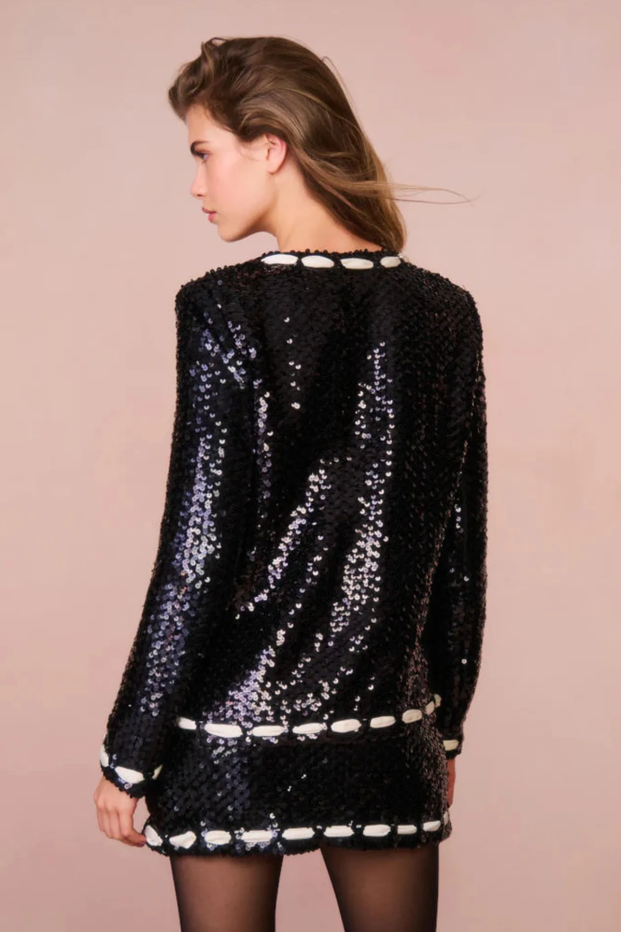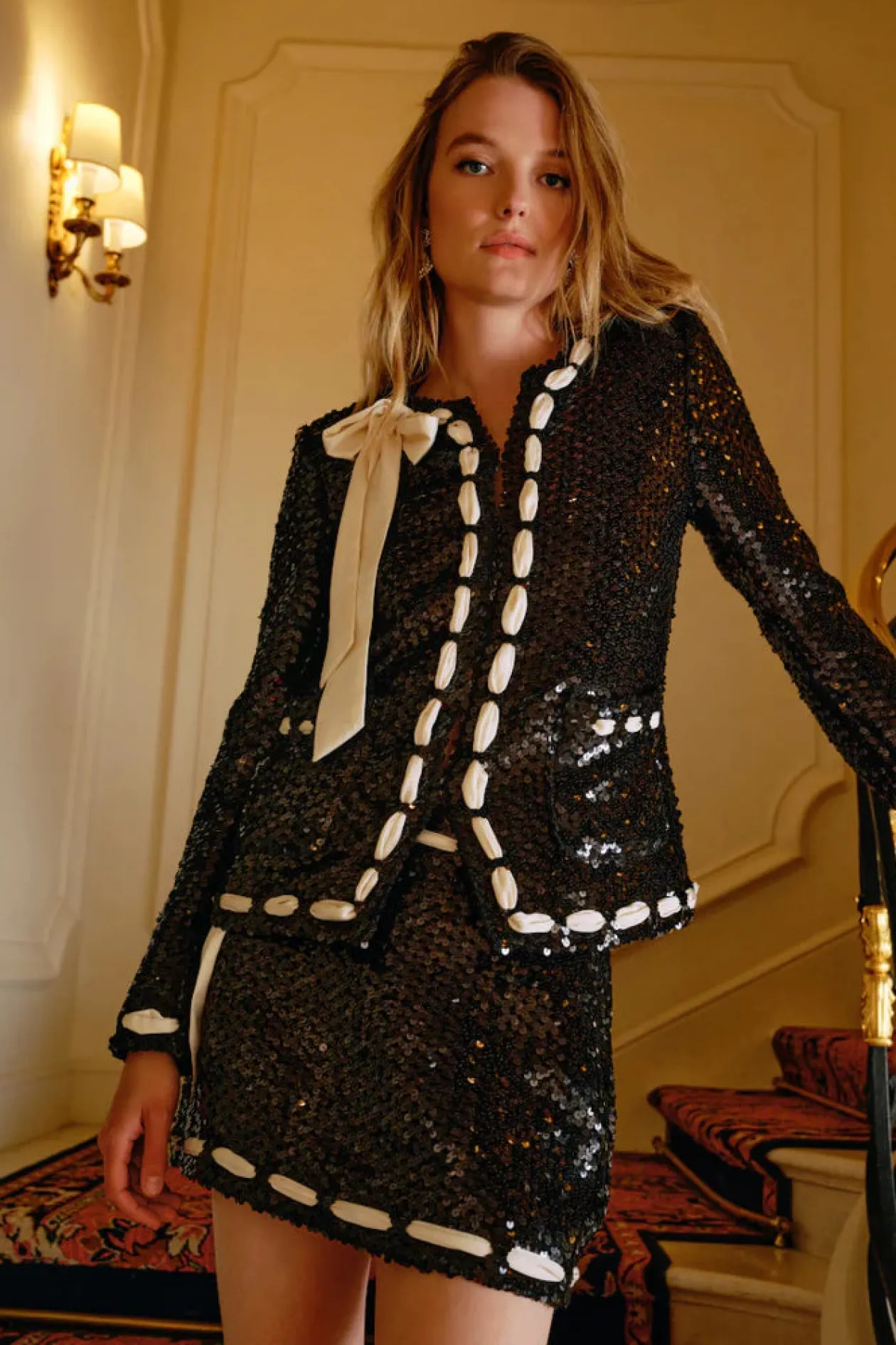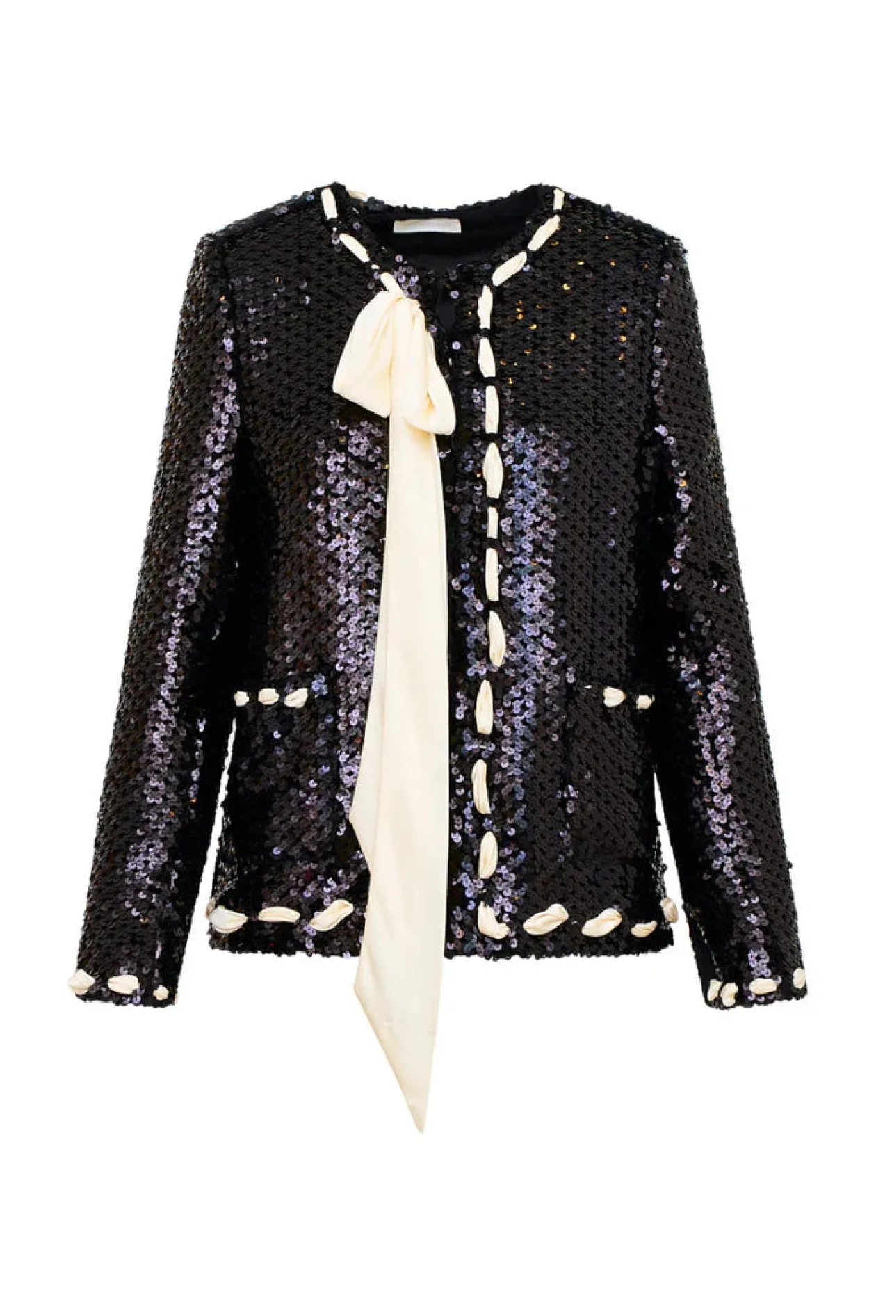 Look chic in the Rosina Jacket. This elevated piece debuts with shimmering black sequins all over and contrasting cream charmeuse sashes woven throughout that self tie into a bow around the jacket. With an oversized fit, the jacket features a straight yet generous silhouette, long sleeves, and pockets at the hips. This piece comes fully lined. Pair it with the Lovina Sequined Mini Skirt for a full set.