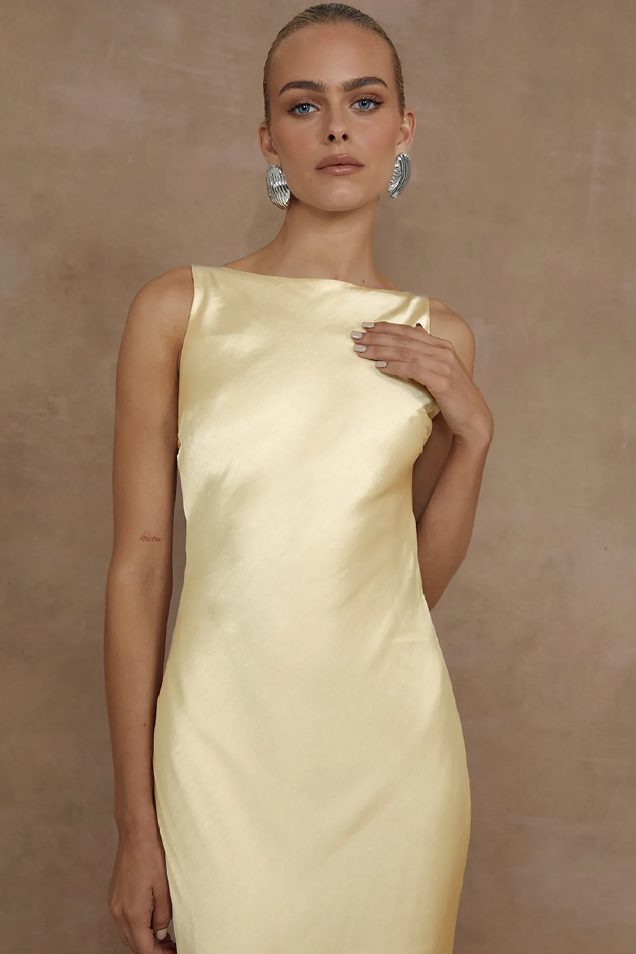 Featuring an elegant boat neckline and an open back with a jewel detail, our Samsara Maxi Dress is perfect for a wedding or formal event.