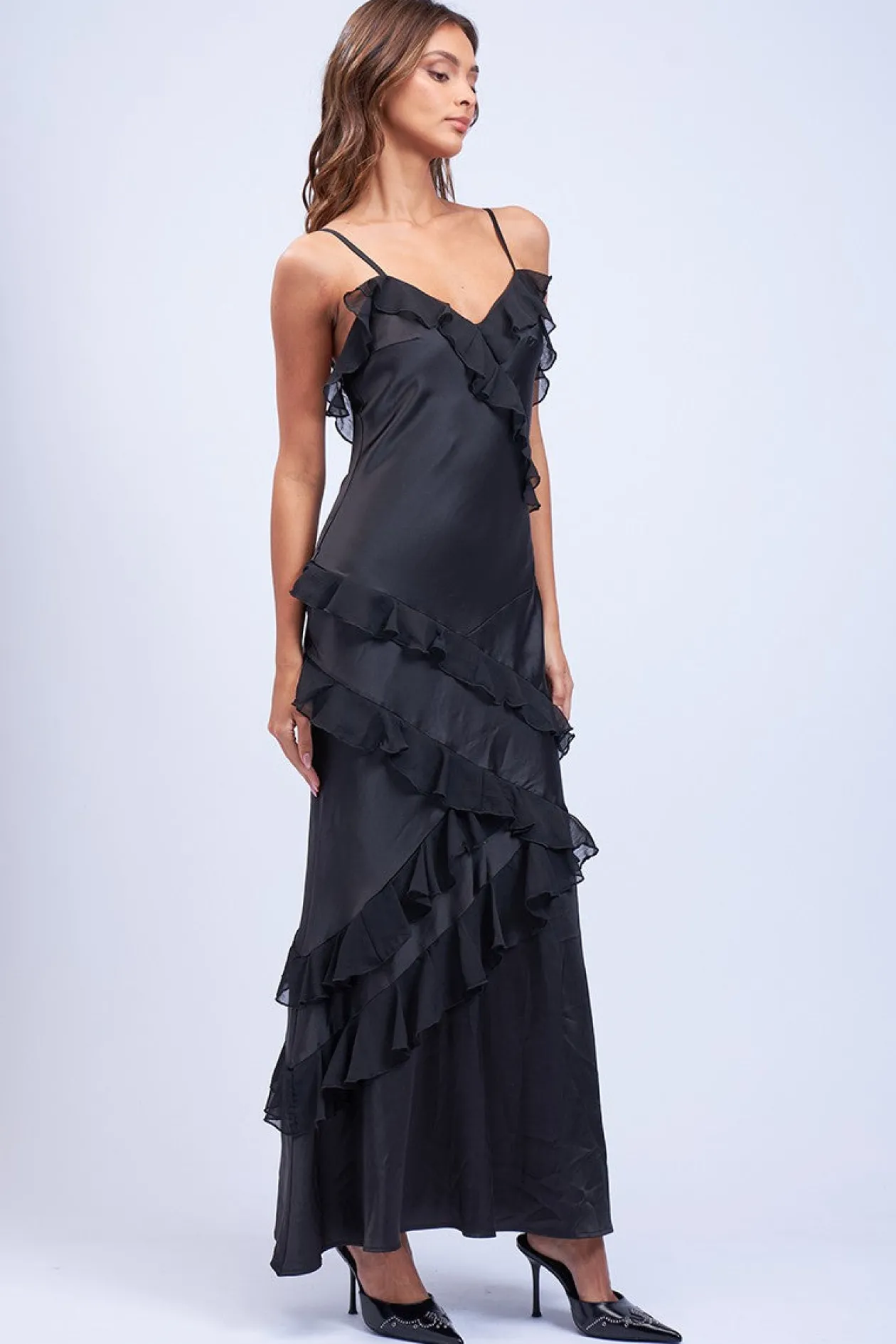 Effortlessly elegant, this Satin Ruffle Maxi Dress features a stunning satin material and sleeveless design. The ruffle trim adds a touch of femininity, while the maxi length offers a sophisticated silhouette perfect for any formal event.