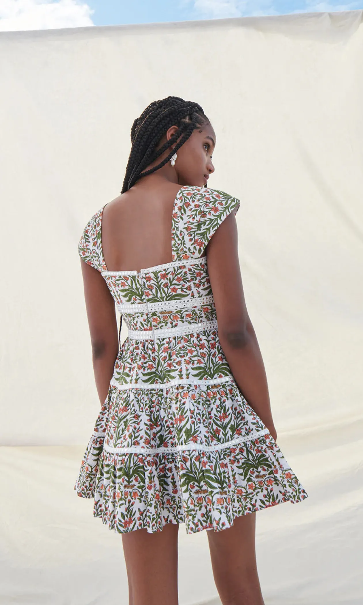 Spring for it! Our new Campbell mini dress is ready to liven up your spring wardrobe. The flirty mini is cut from a poppy floral fabric, that’s block printed by hand. The mini dress has a straight neckline, mirror trim details, and a tiered silhouette. Pair the mini dress with slide on sandals and a woven bag for an easy spring look.
