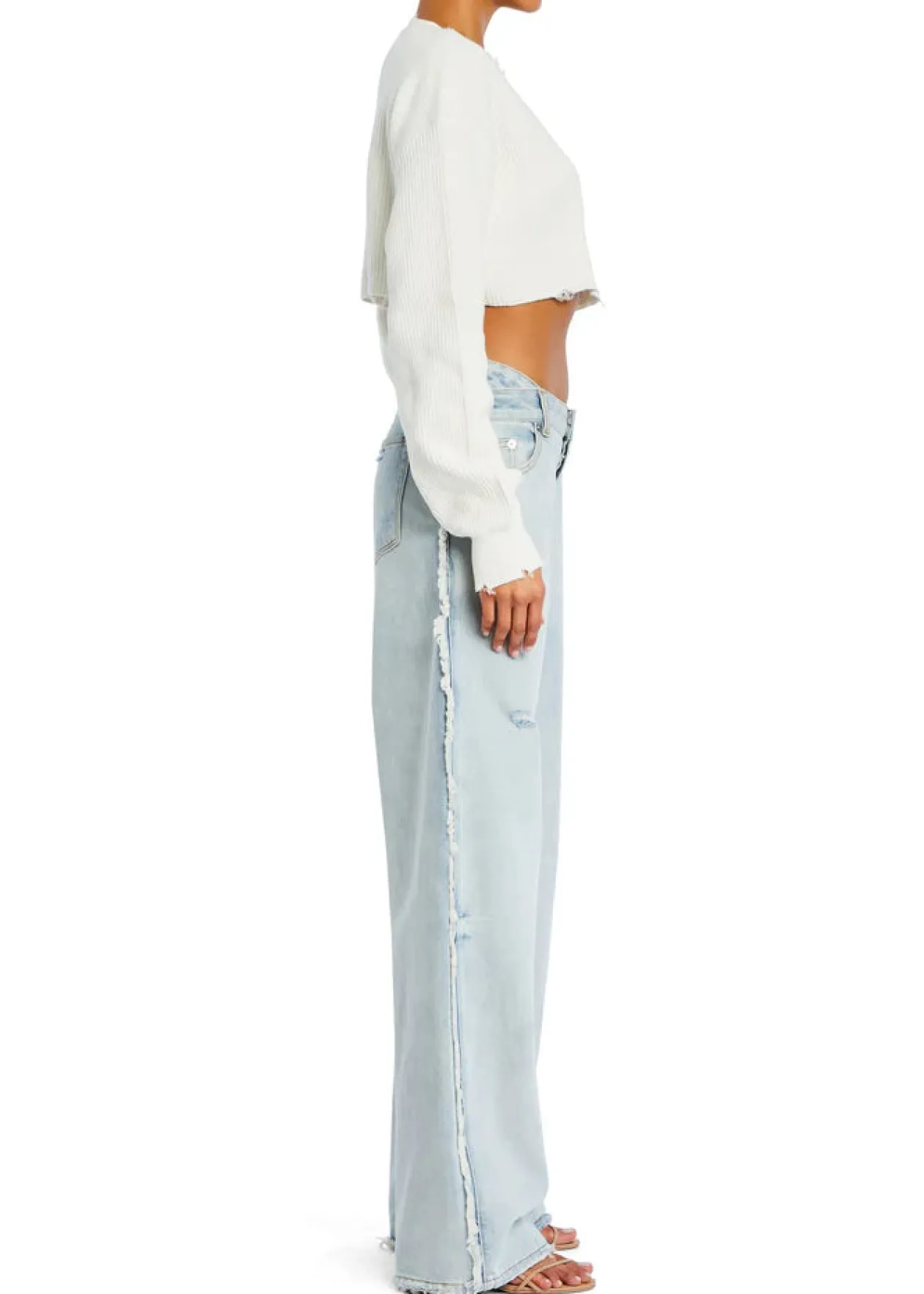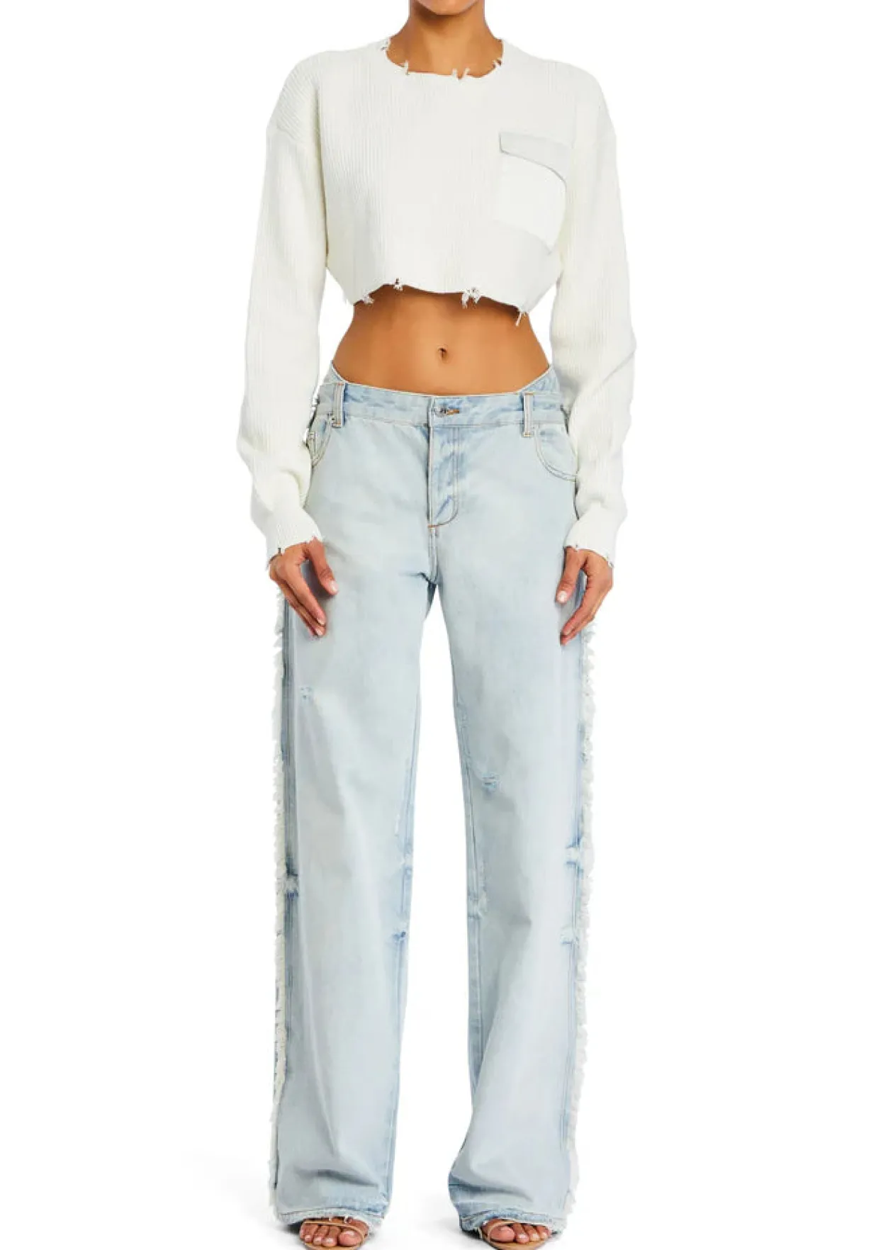 - Midweight knit fabric with intentionally distressed detail throughout