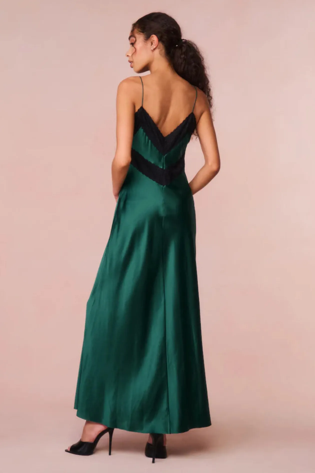 Slip into romance with the Serita Dress. Designed from a silk charmeuse fabric, this sexy bias cut slip dress features gorgeous contrasting lace at the neckline and the waist and delicate spaghetti straps. The lace is backed with a bit of chiffon for a flirty finish and easy coverage.
