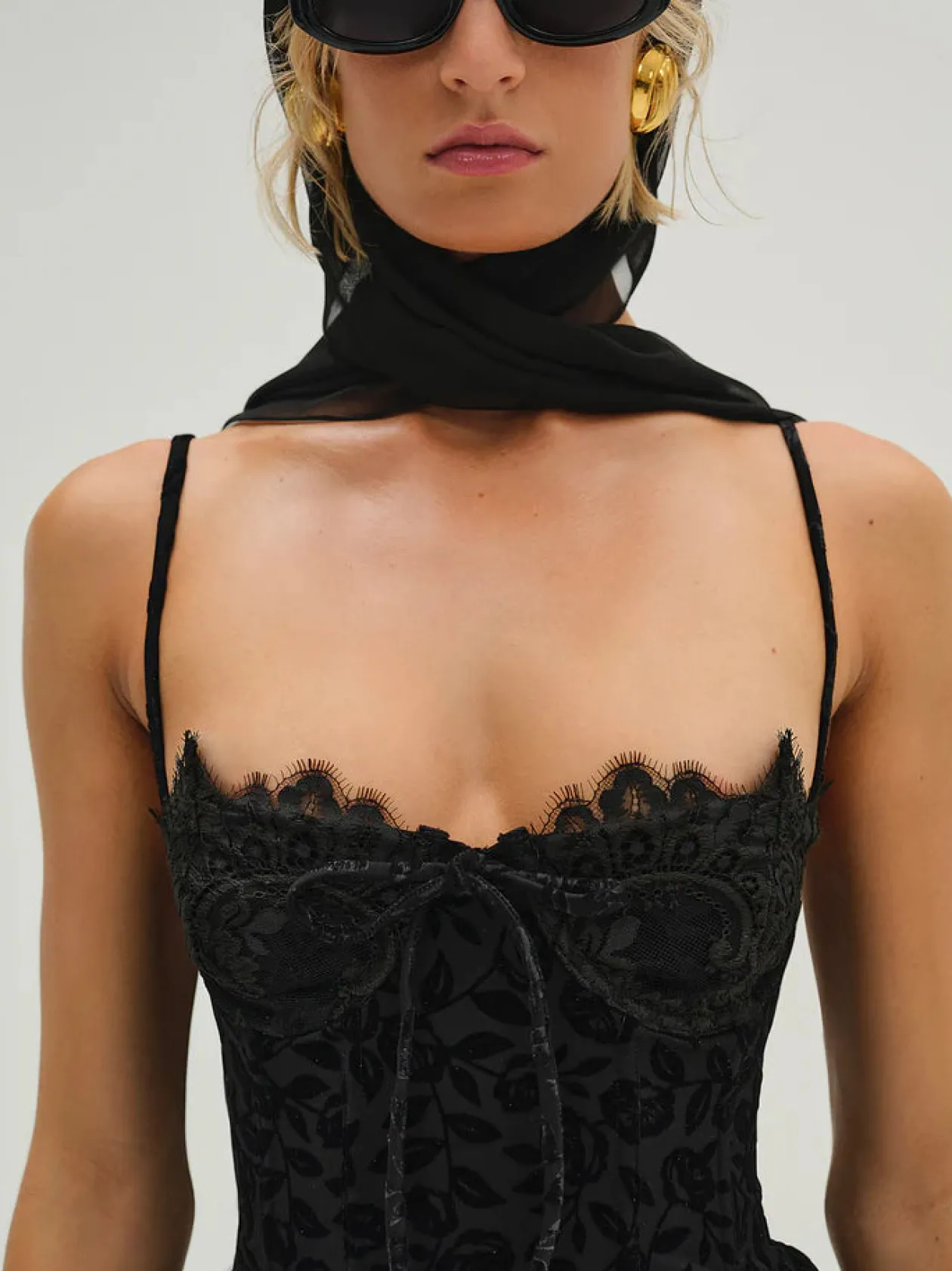 Shae Mini Dress features floral velvet and lace trims with underwire cups, a fitted bodice, and a flared skirt. The perfect dress for the holiday season, a night out or any party.