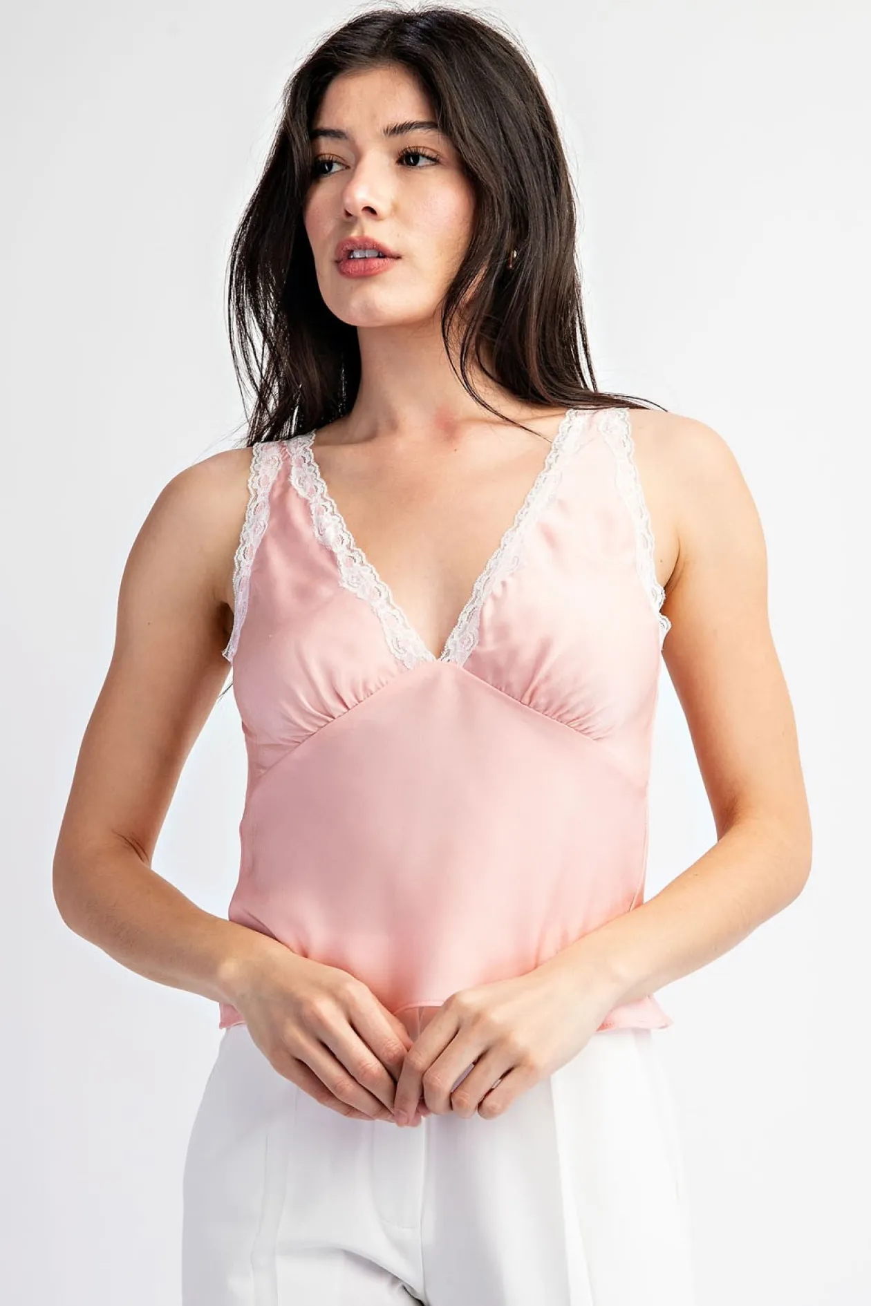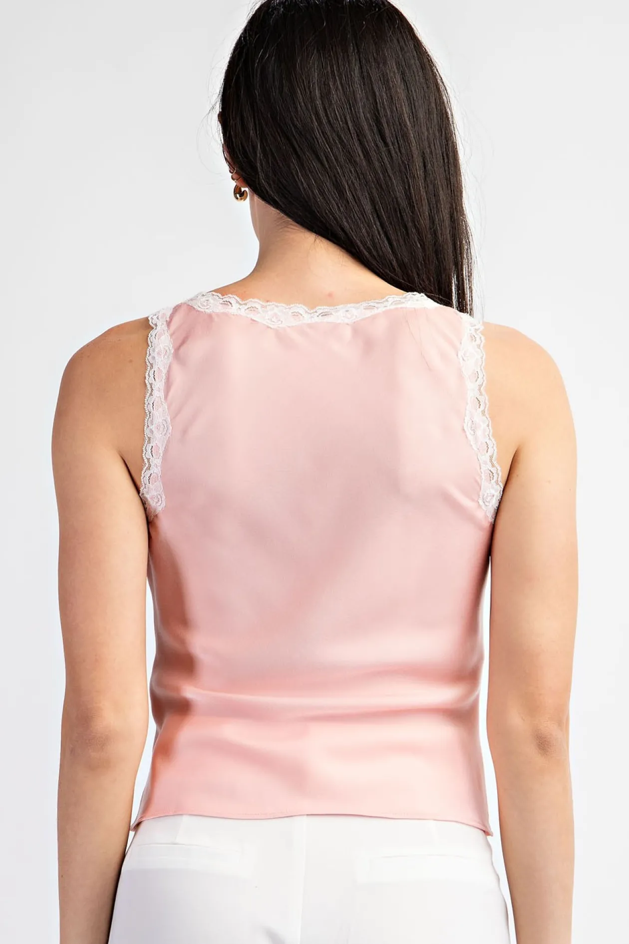 Sleeveless satin top with lace detailing along the neck and tank straps.