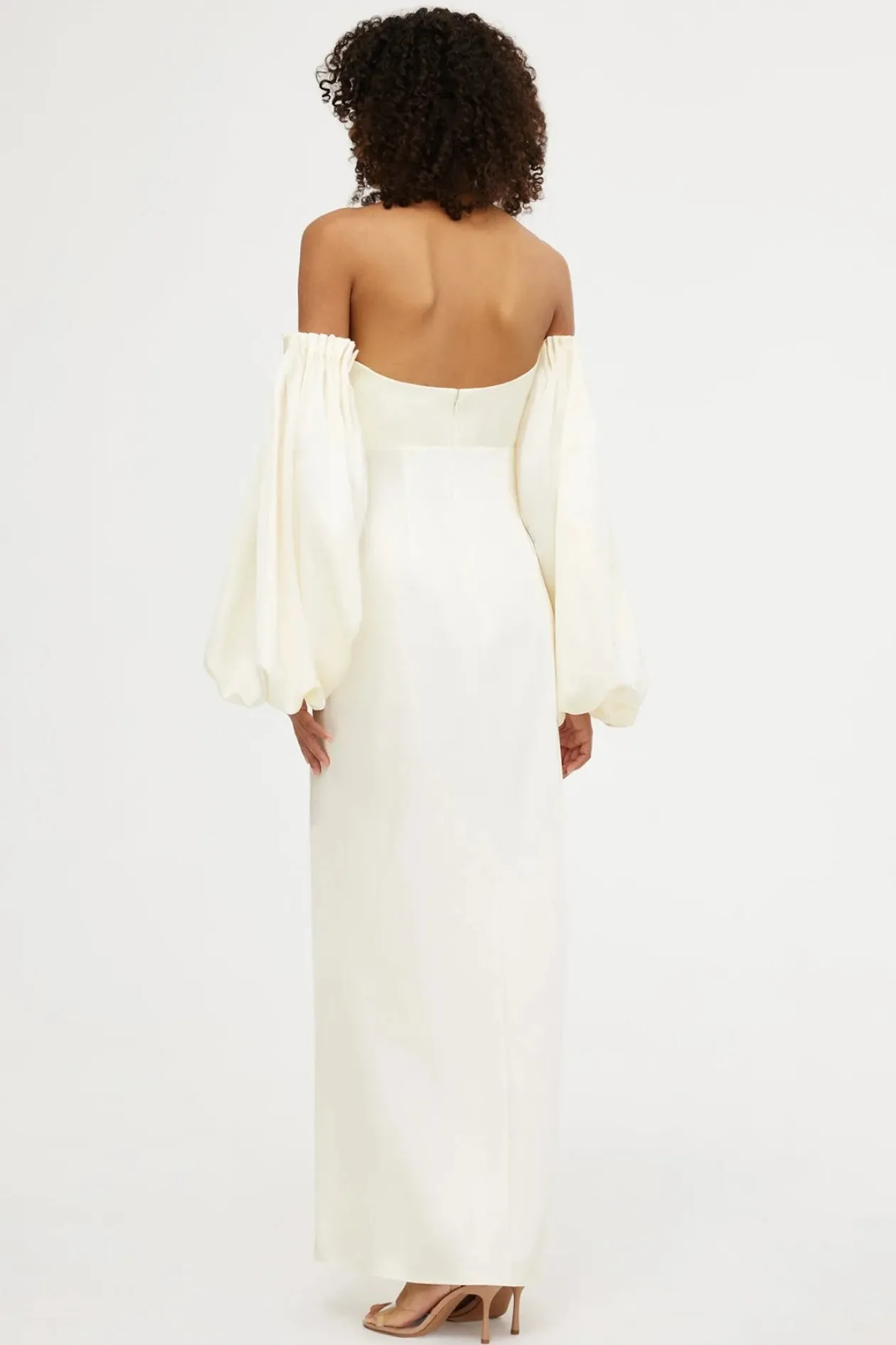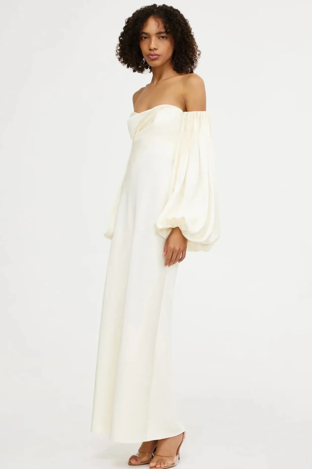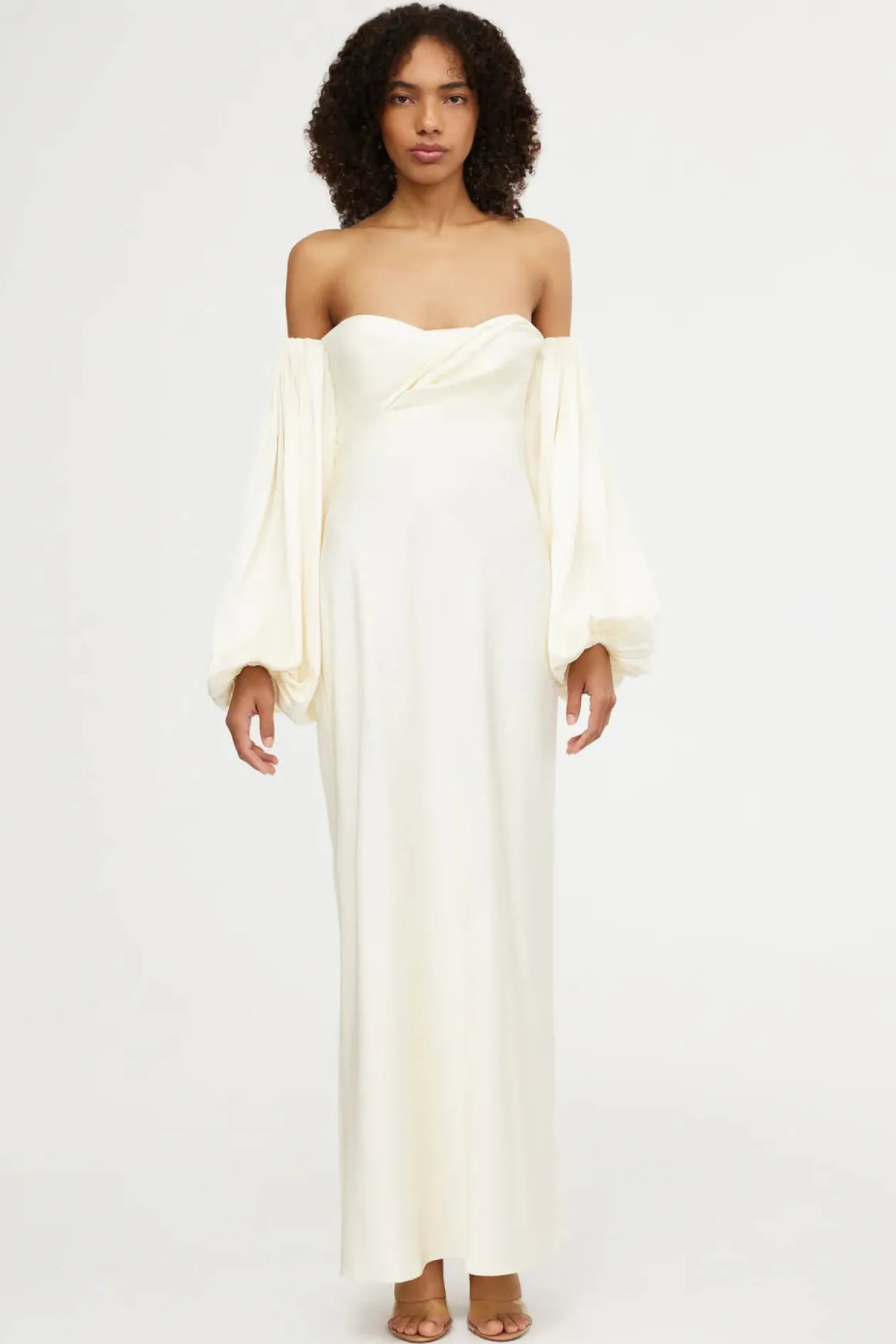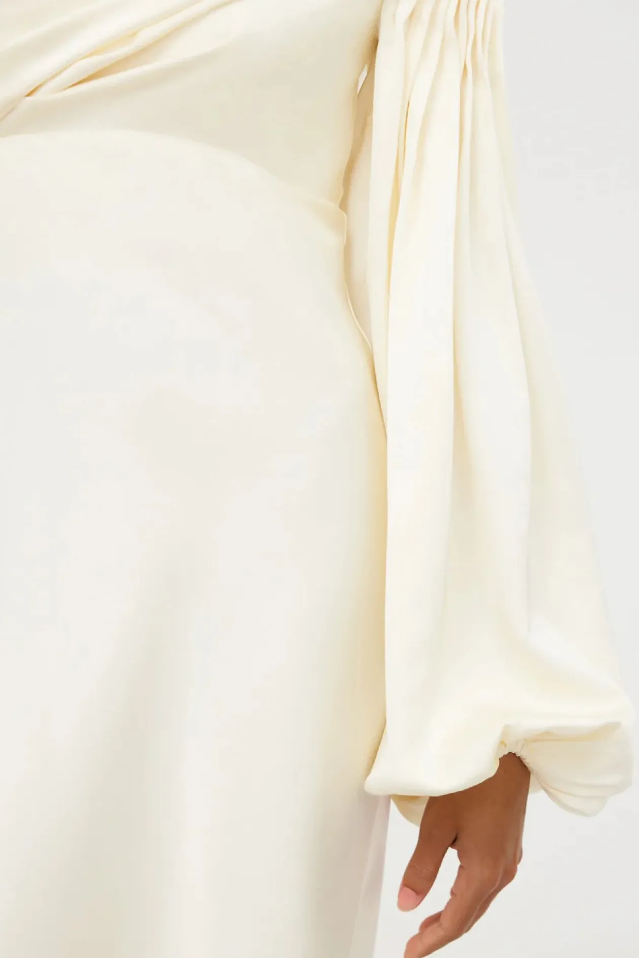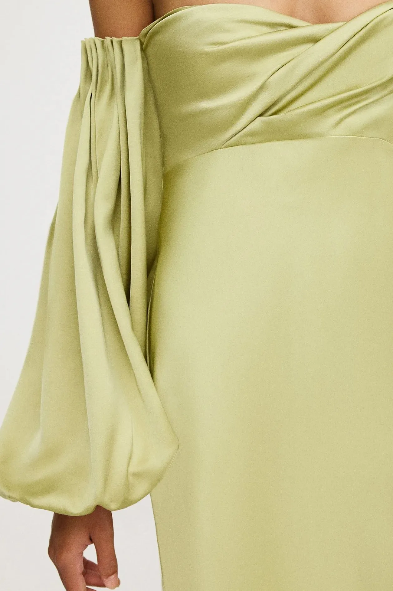 An elegant silhouette for your events this season ~ the Danika Off Shoulder Dress in Matcha and Cream is crafted from our luxe satin fabrication. Complimented with a twisted front bodice design, off shoulder sleeves with pleated detail and scooped backline. A great option for bridesmaids