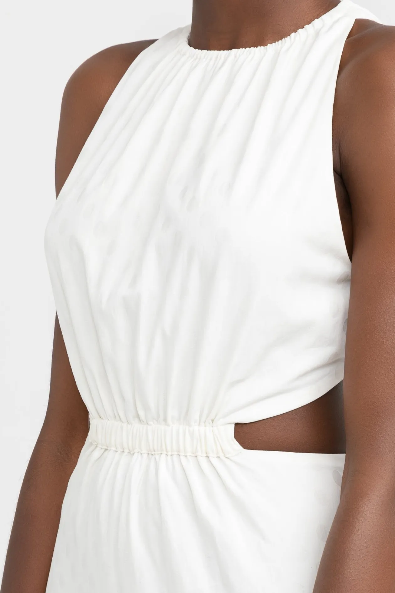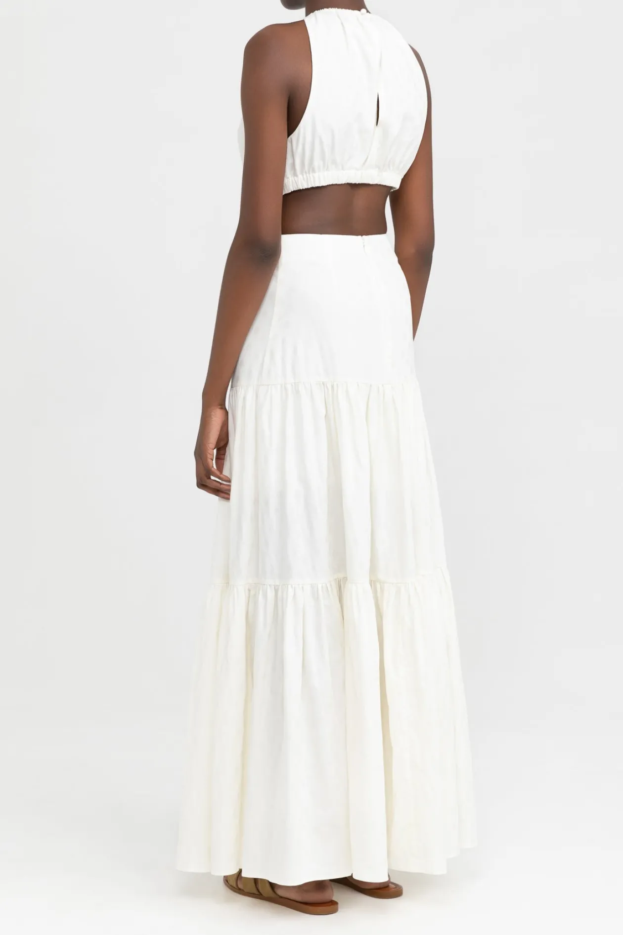 The Poppy Dress in Ivory is cut to be fitted at the bodice and flow toward the hem. This easy wear style features a high neckline, cut out detail at the waist and cut out design at mid back. The perfect piece for warmer days in the sun.