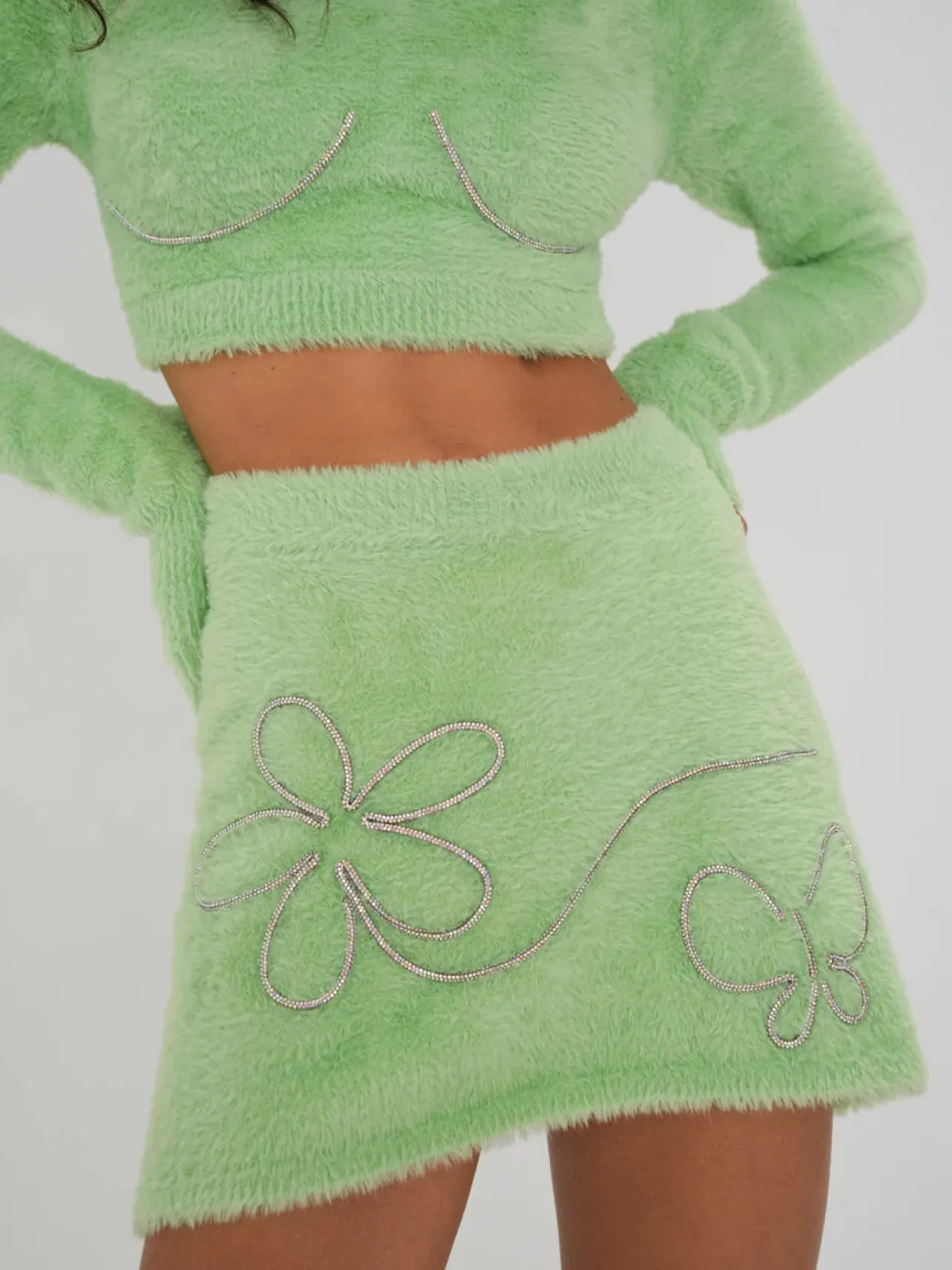 - Hand-stitched rhinestone motif details