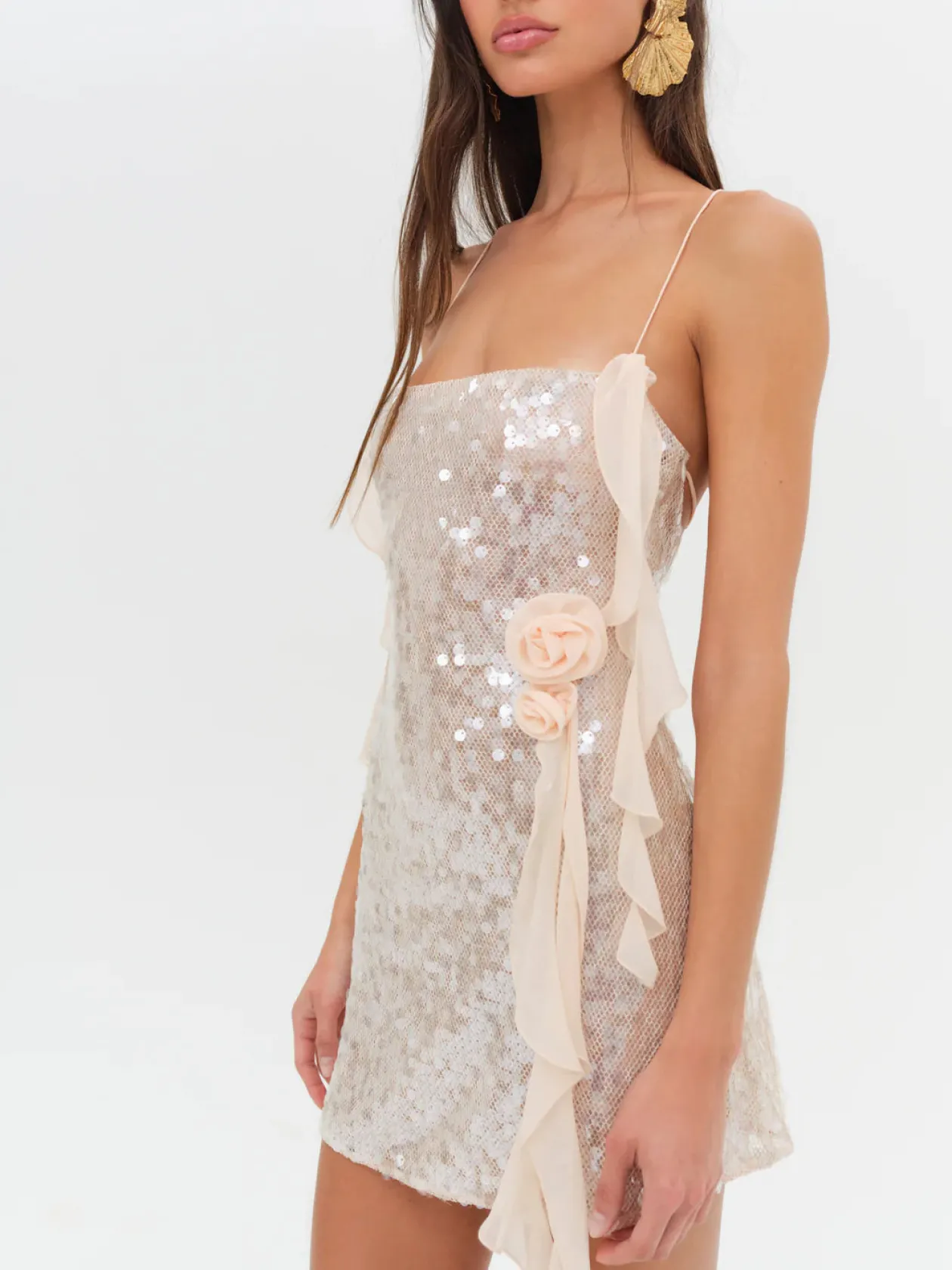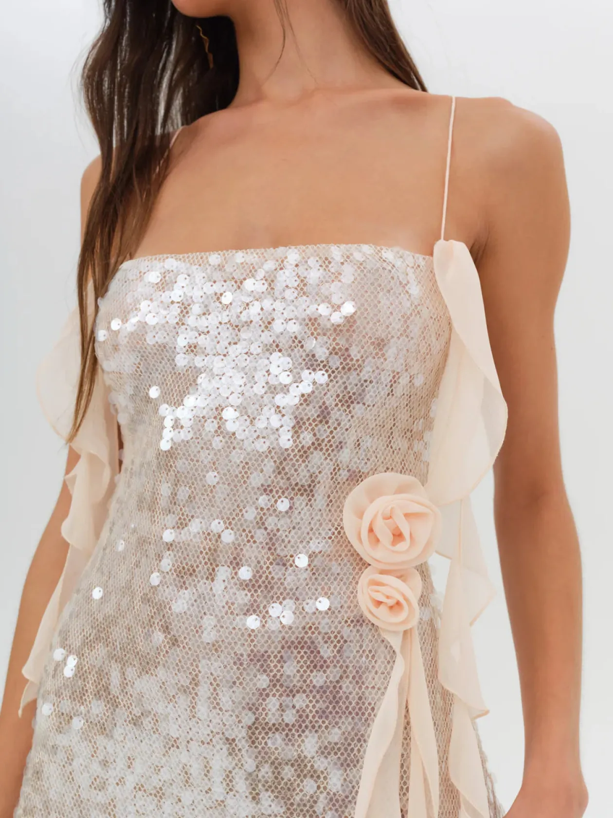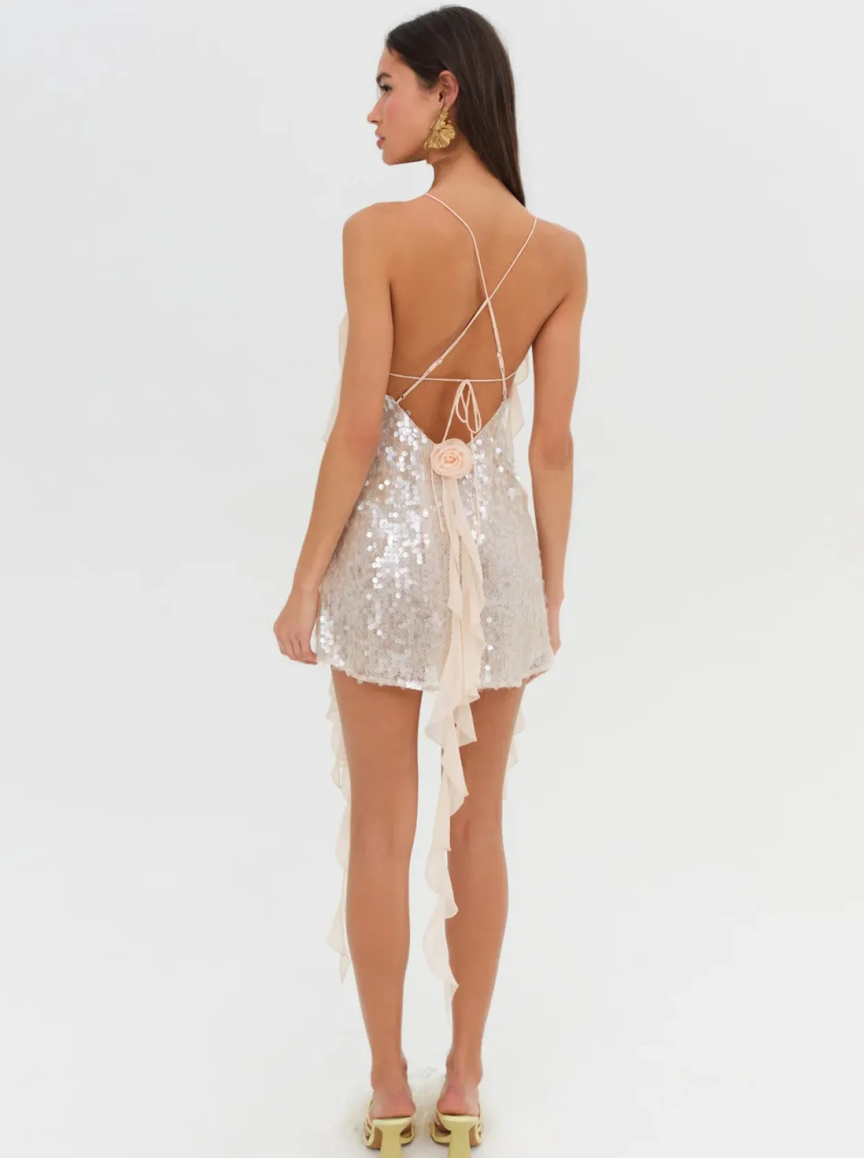 Back in stock! Designed for the modern mermaid, the Sydney nude sequin mini dress captivates with its all over pearlescent sequins that echo the ocean’s treasures. Featuring a low open back and flared skirt, this sparkly dress is completed with fixed rosettes and cascading chiffon ruffles that capture the rhythm and ripples of soft summer waves.
