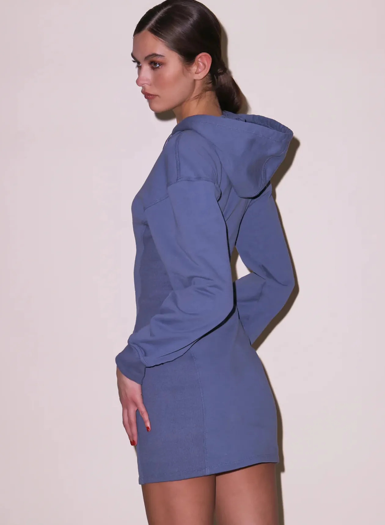 Our French cotton terry Hoodie Corset Dress, featuring ribbed side panels and front boning detail. Luxe satin drawstrings, mini length.