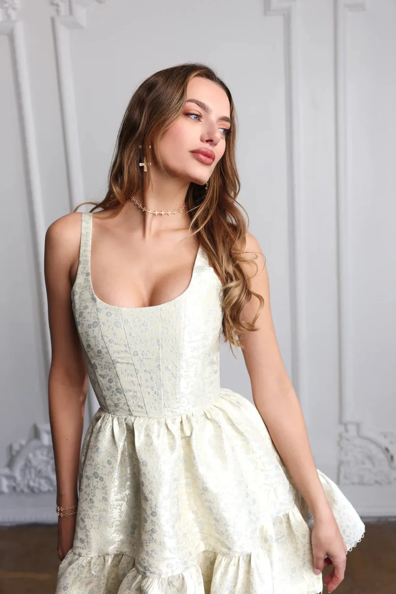 Meet Betina! She’s the sweetest corset mini dress with gathered tiers. She’s made from our stunning Light Blue Duchess brocade, which flaunts light blue florals and metallic accents. She features a cute bow detail at the back, adjustable straps, and she has pockets! She’s flirty, flouncy, and ready for any party!