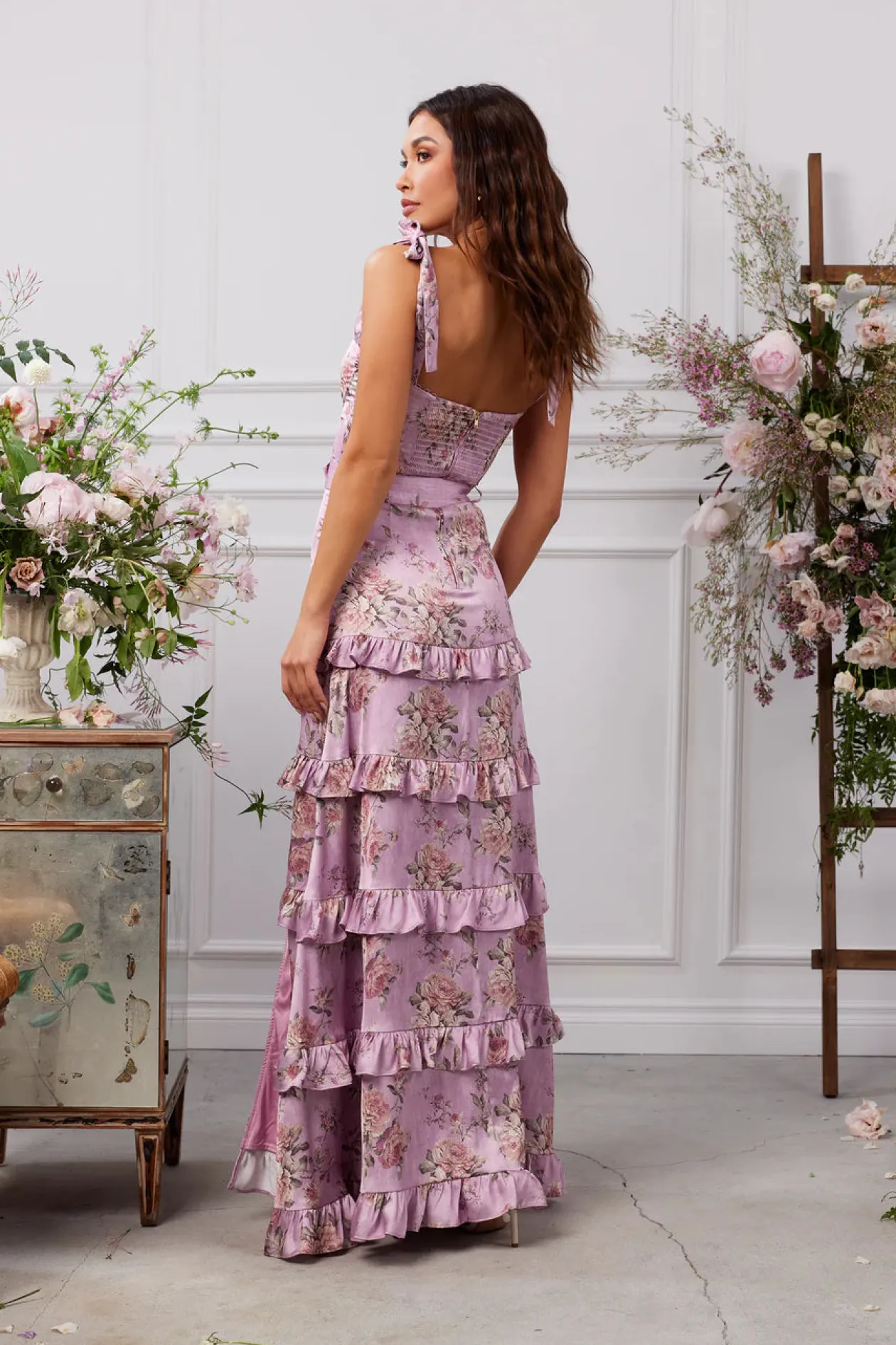 Meet Lisianthus! She’s a corseted ruffle tiered gown with the most darling tie straps and matching belt that is removable. She is made from our Lilac Tapestry Rose printed semi-satin, which features rosy pink florals on a light purple background, and flaunts a high side front slit. She’s elegant, sexy, and perfect for any occasion!