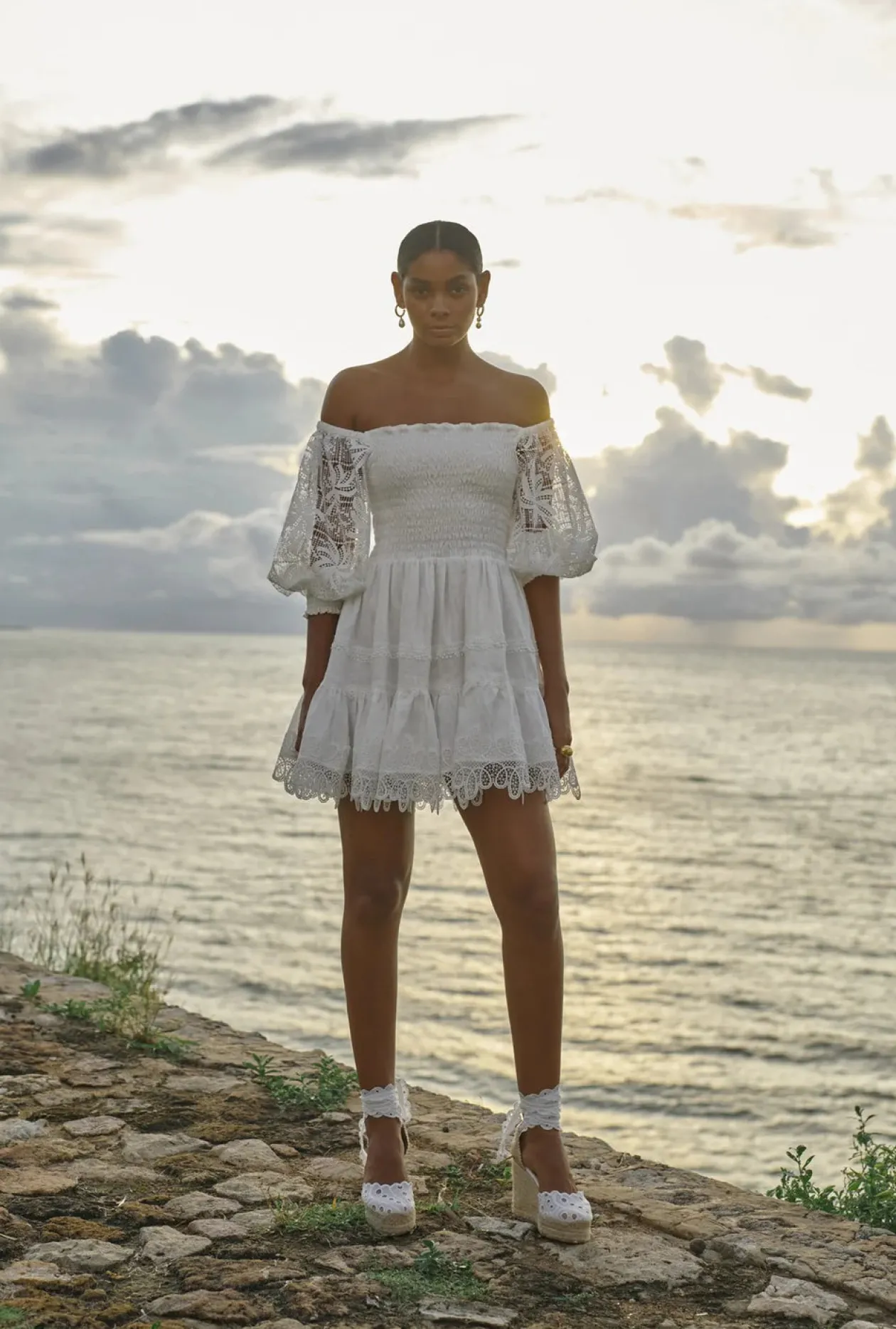 Made from a linen-lace blend, the Ancora dress has a shirred bodice that falls into a linen mini skirt adorned with lace panels and trim. Its lace sleeves can be worn on top or off shoulders. Style yours with strappy or chunky sandals.