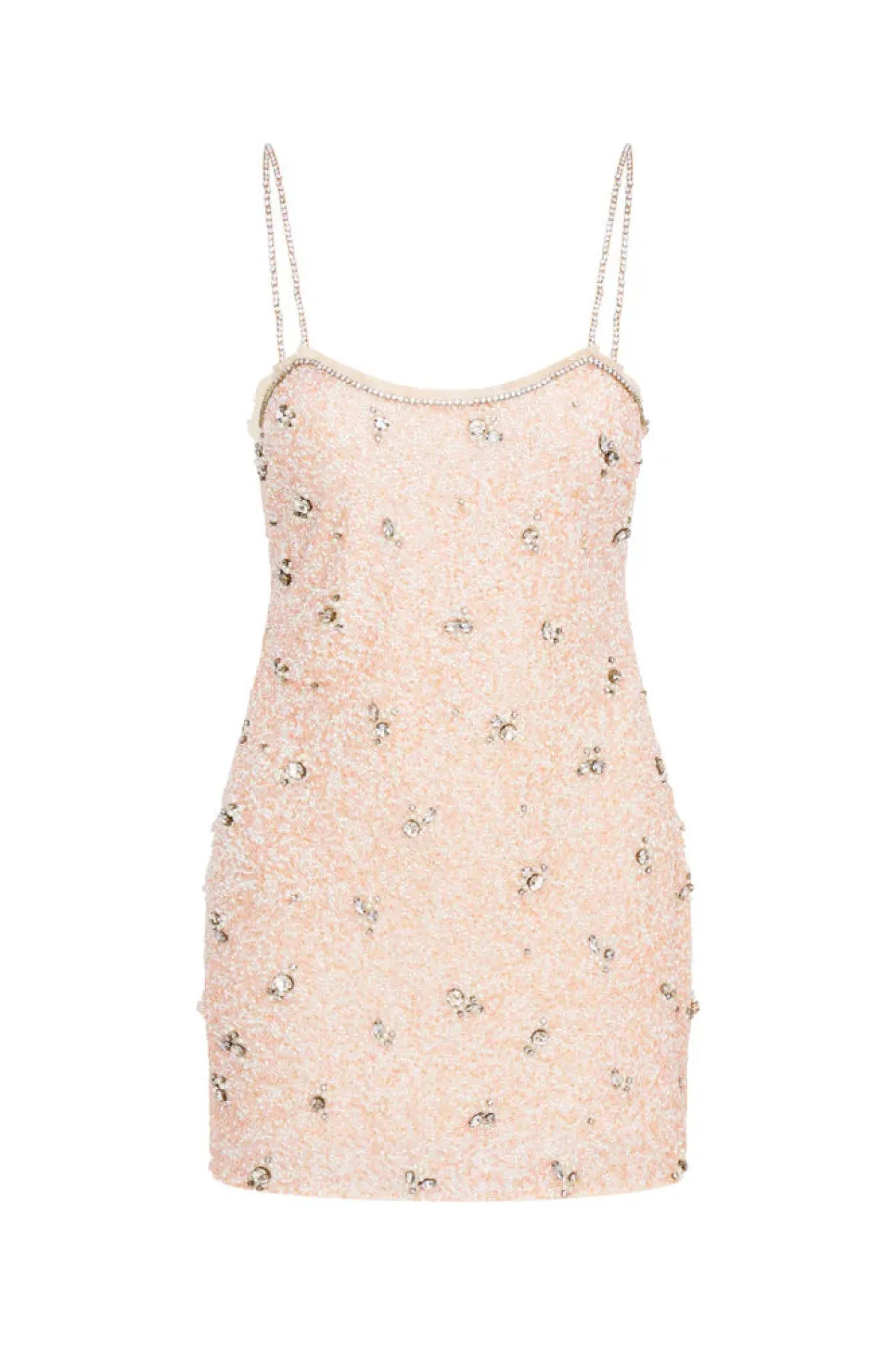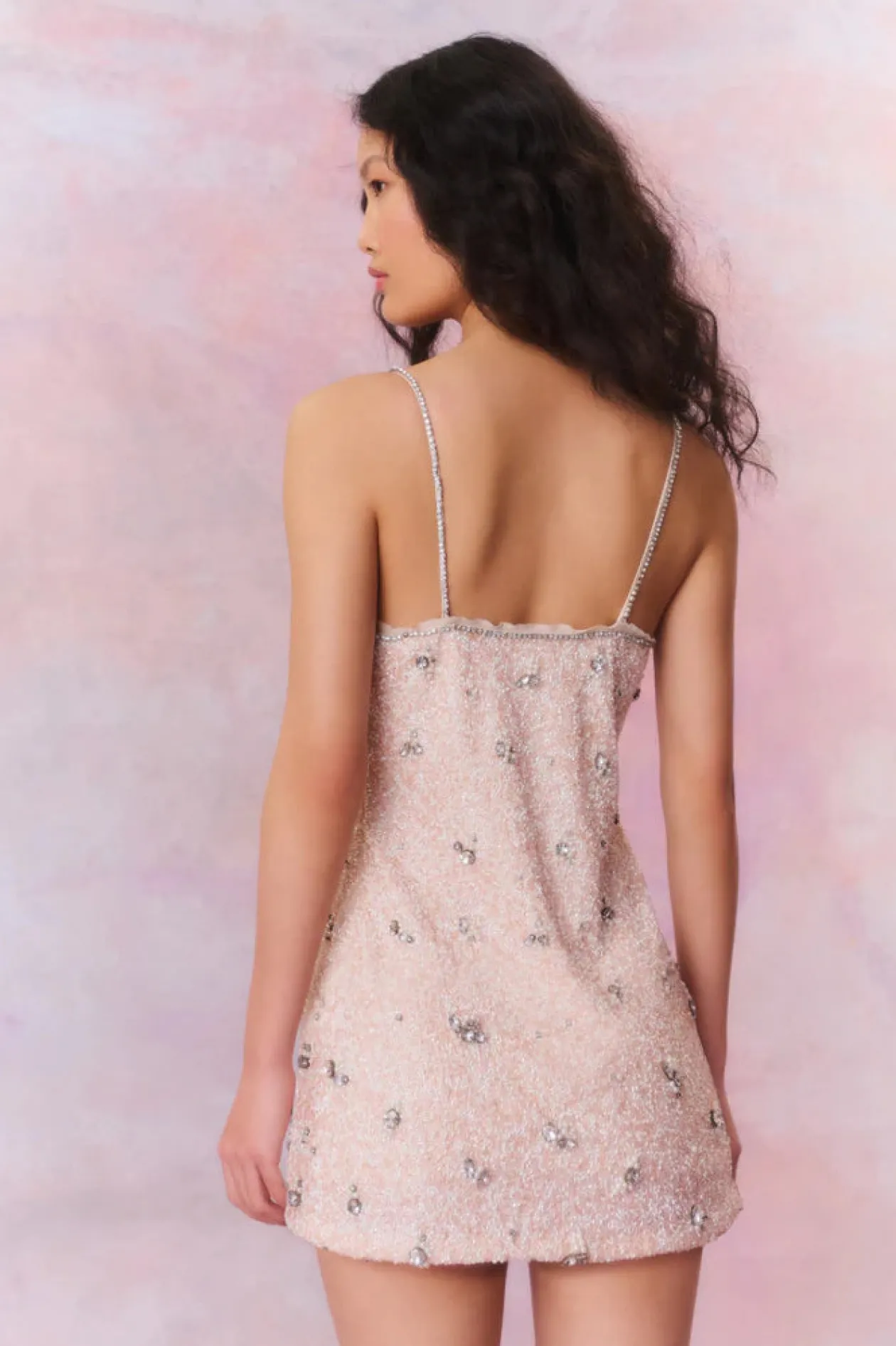 Shimmer chic in the Windson Dress. This stunning party dress is all in the details with a hand-beaded fabric embossed with tiny, intricate seed beads that make up larger compilations of rhinestone-studded flowers. The mini features rhinestone spaghetti straps and a rhinestone-lined neckline. The dress has a slim, figure-hugging silhouette.