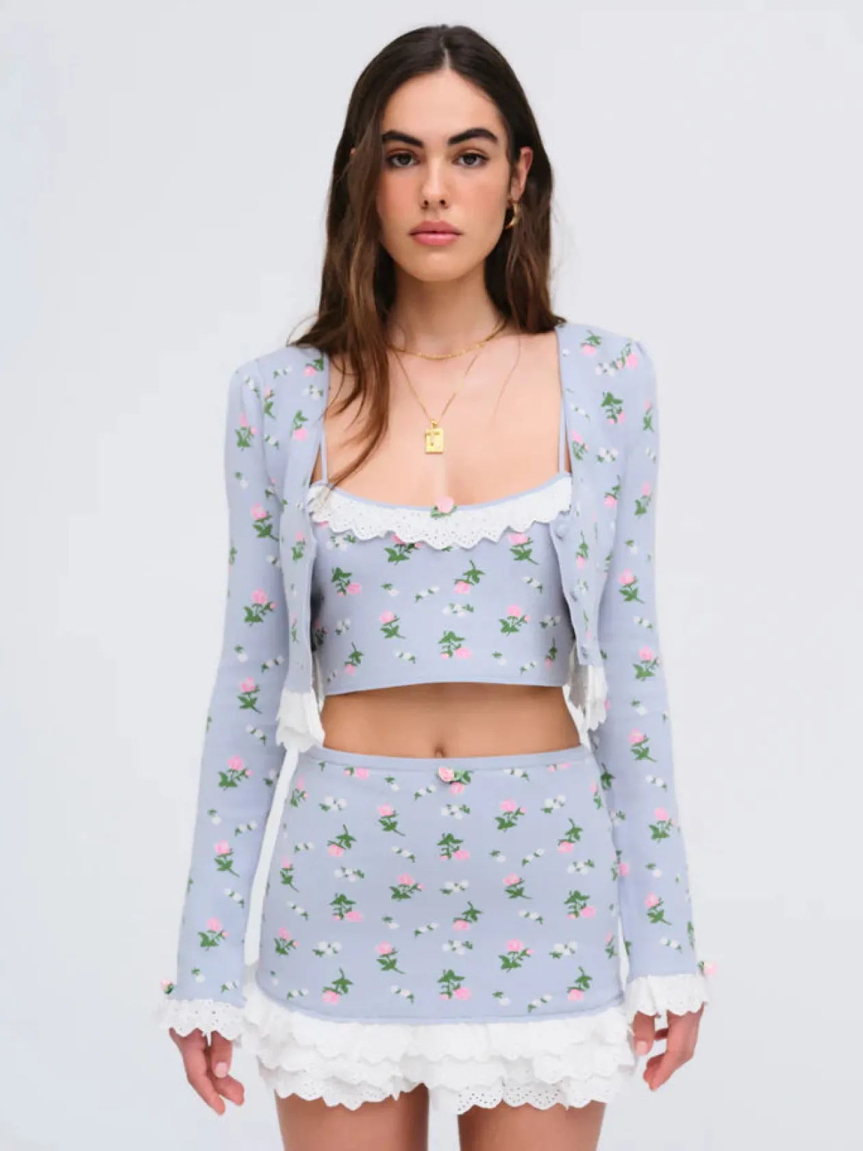 Featuring a charming “Rosey Posey” design, the Amalia blue knit crop top is designed for the modern dreamer. This knitted crop top is decorated with decorative rosettes at the straps and contrast eyelet trims ruffled along the front and back necklines. Style it with the Amalia Knit Cardigan for a matching twinset.
