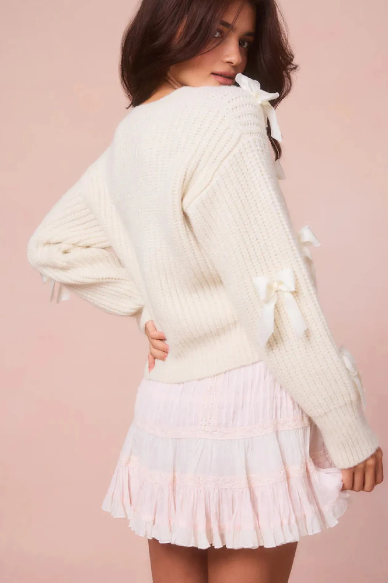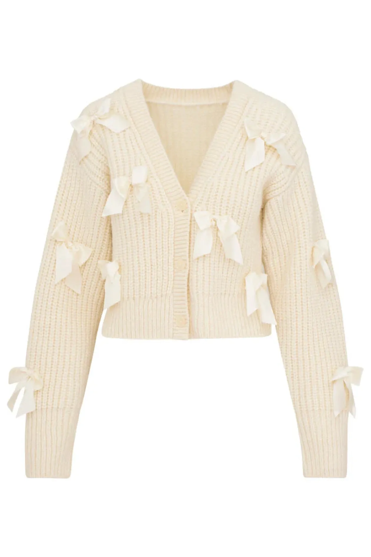 Better with a bow in the Ashtan Cardigan. Knit in Peru, this pretty sweater is designed from a warm alpaca blend for a cozy look and feel. The must-have cardigan features charmeuse bows thoughtfully placed all over for the LoveShackFancy touch.