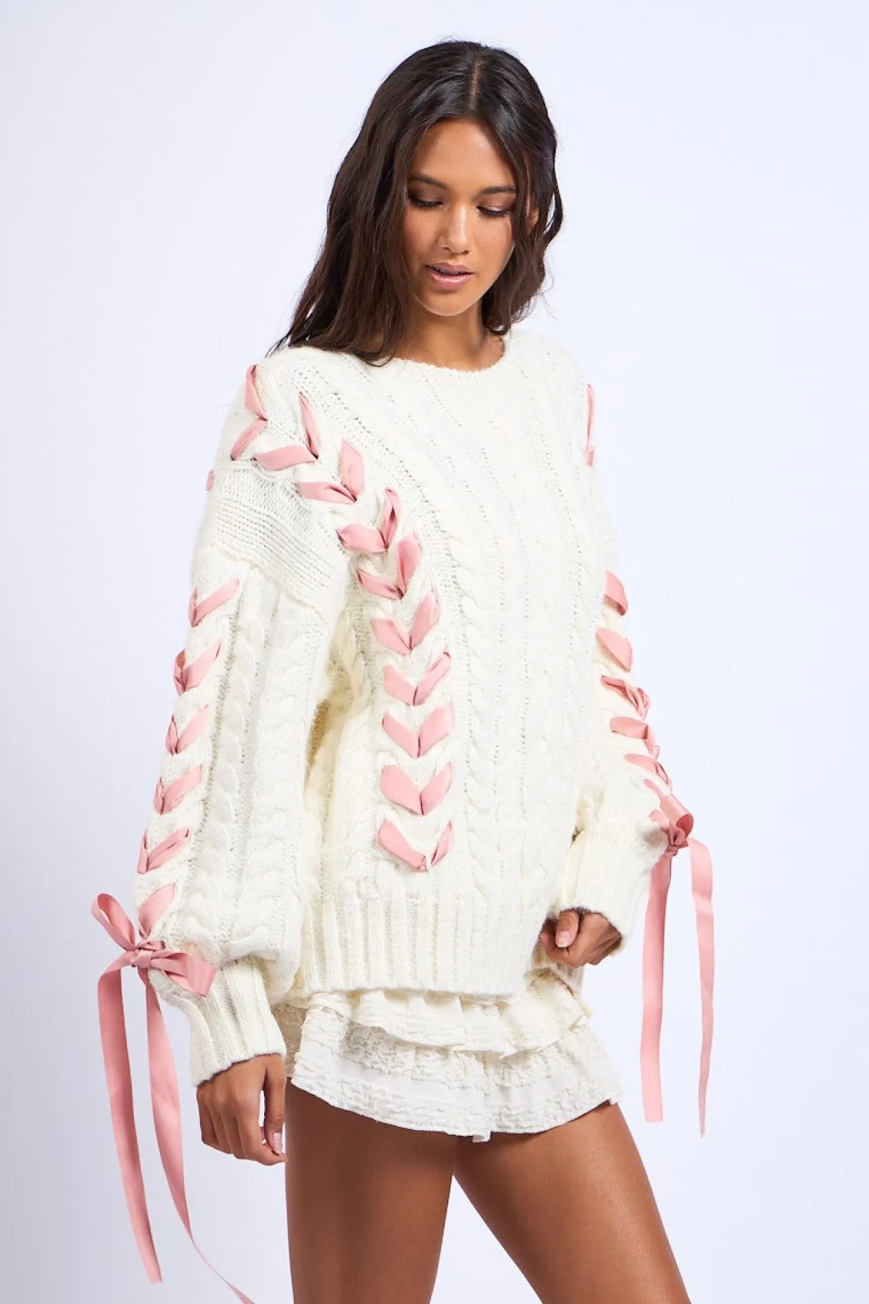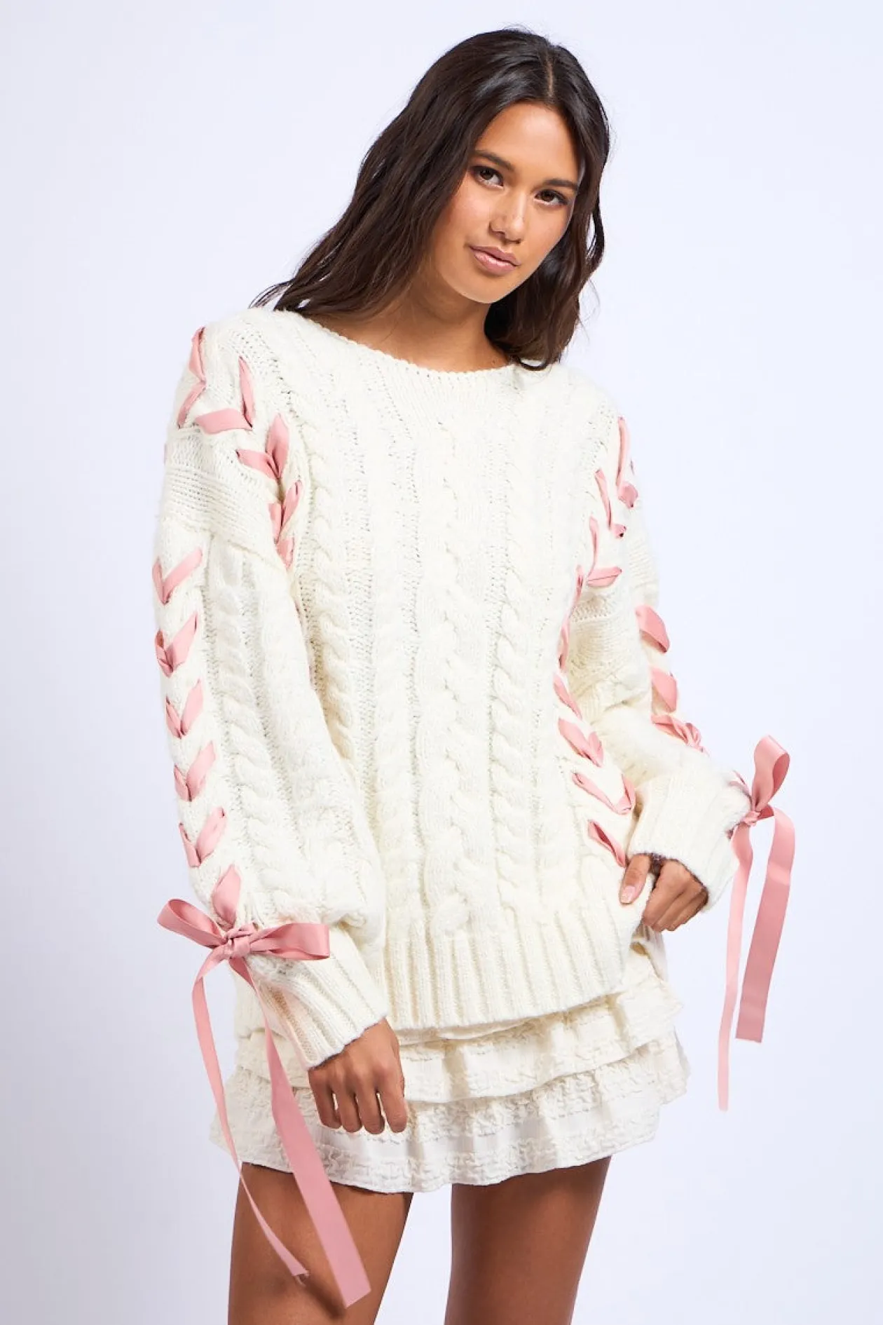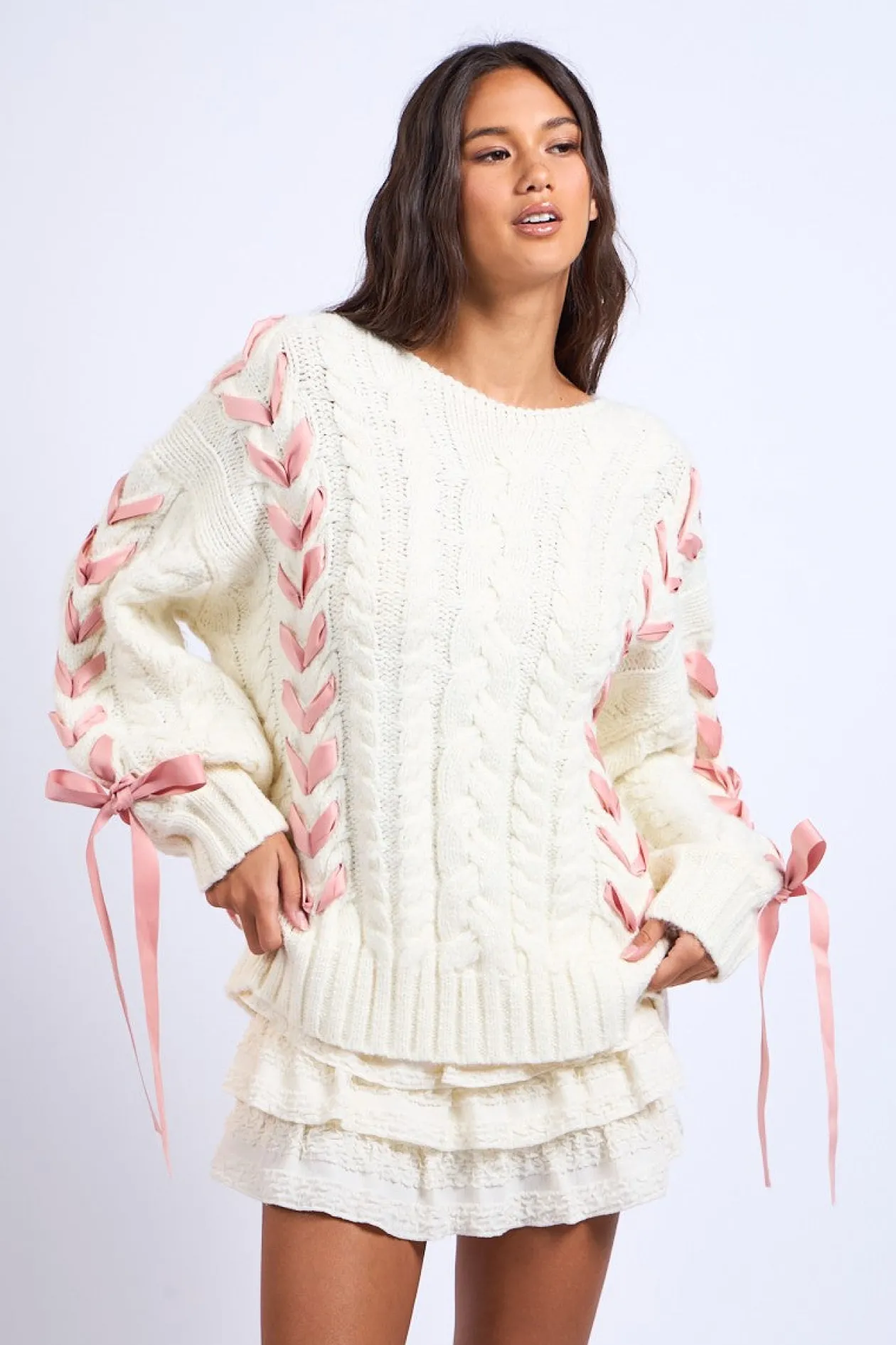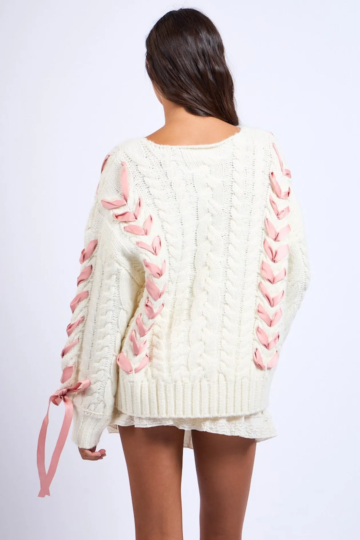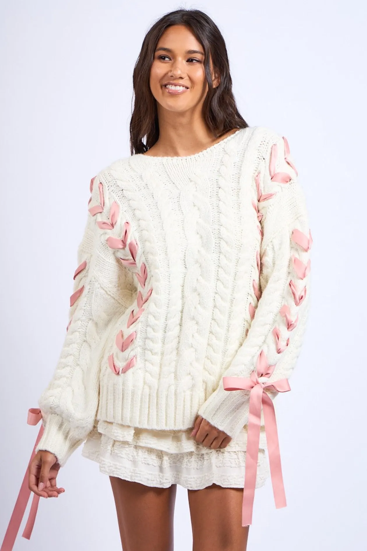 Elevate your winter wardrobe with the Ashton Ribbon Sweater The heavy weight knit material provides ultimate comfort, while the satin pink ribbon detailing adds a touch of femininity. Perfect for layering or wearing on its own, this sweater will keep you warm and stylish.