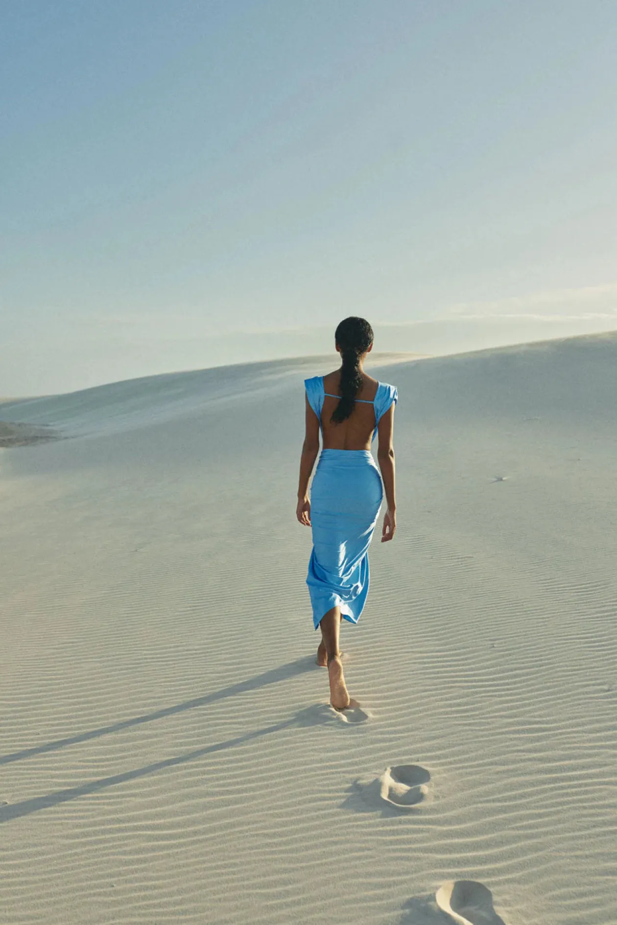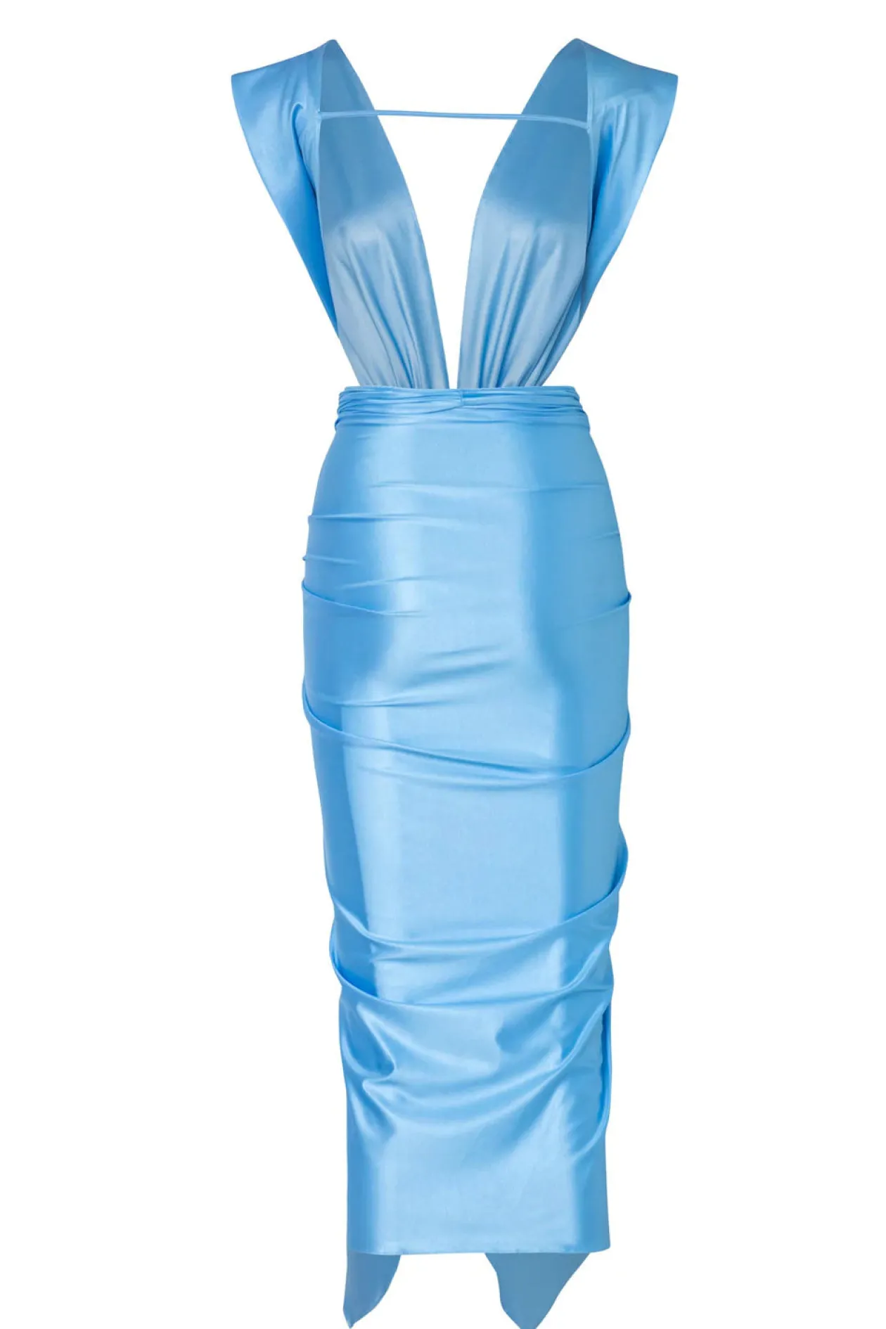 Cut from luxe satin jersey in a dreamy blue, Baobab’s skin-baring dress features a bust-framing V-neck and turns to reveal an open back. Pull-over style.