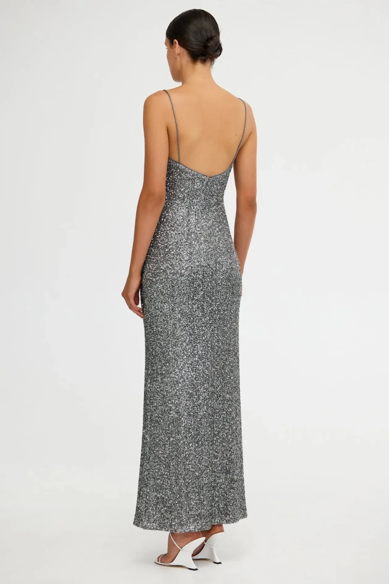 Ideal for a glamorous evening affair, the Beau Dress in Charcoal stuns with its soft sequinned knit fabric. This fully lined maxi dress features fixed-length straps and a captivating low V back, adding a touch of elegance that’s perfect for any sophisticated event.