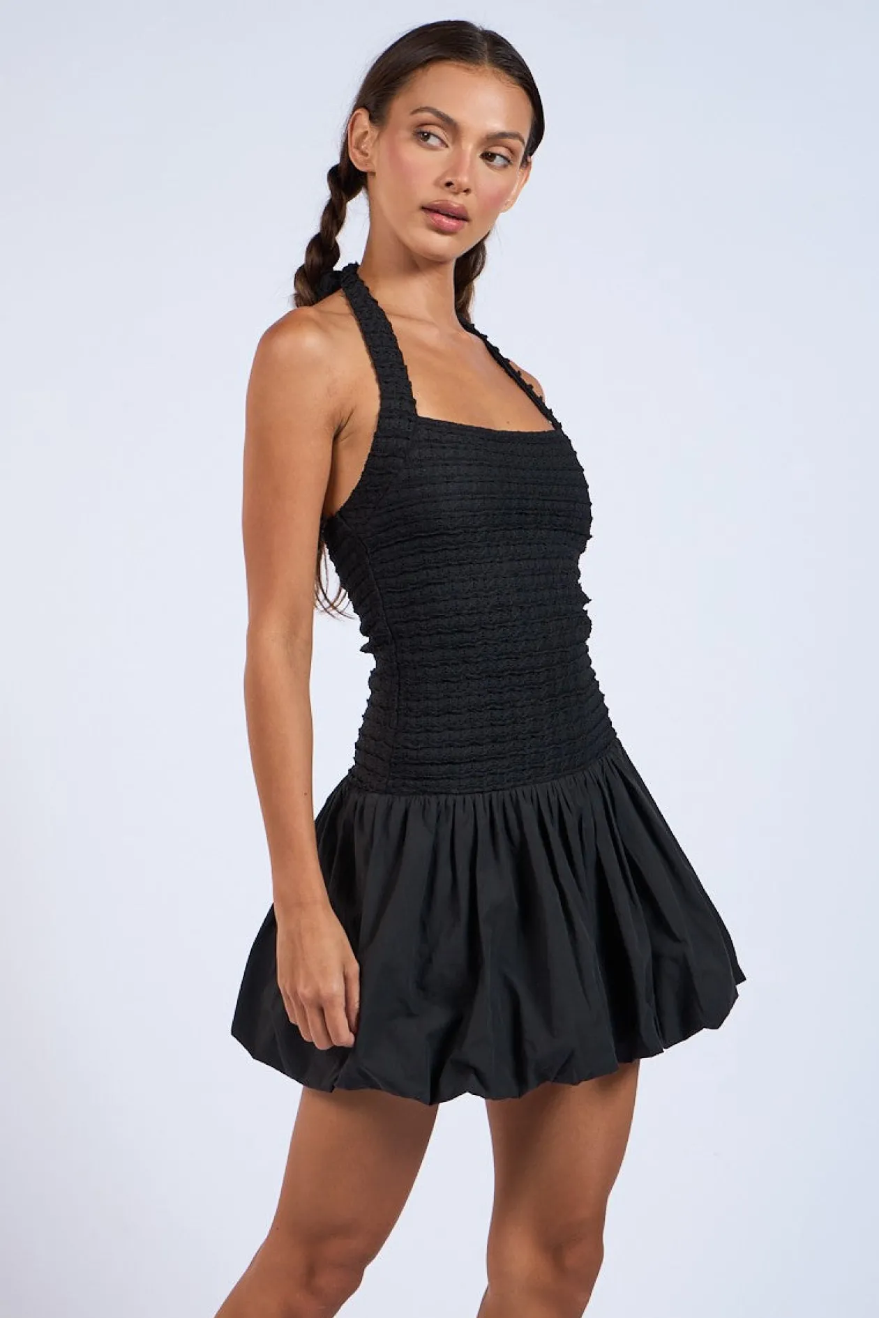 Black textured halter neck drop waist bubble hem mini dress.