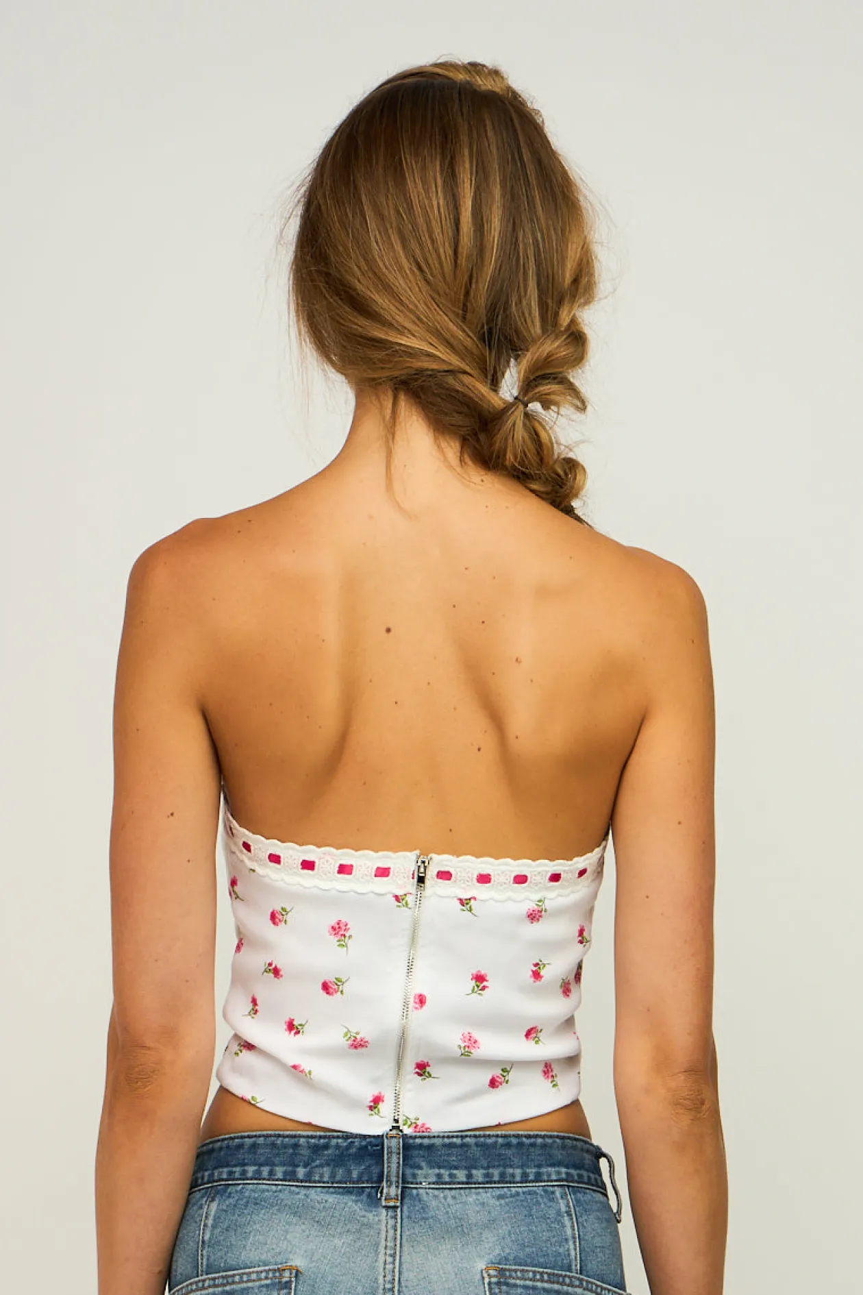 Sky to Moon Brunch Date Strapless Top is an easy style for warm weather. White floral fabric forms this cute tube top with ribbon trim detail. Features exposed back zipper/closure.