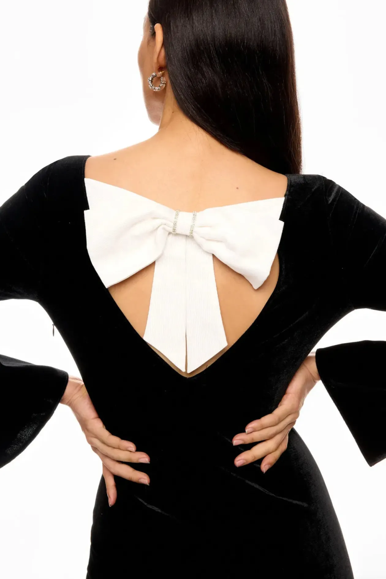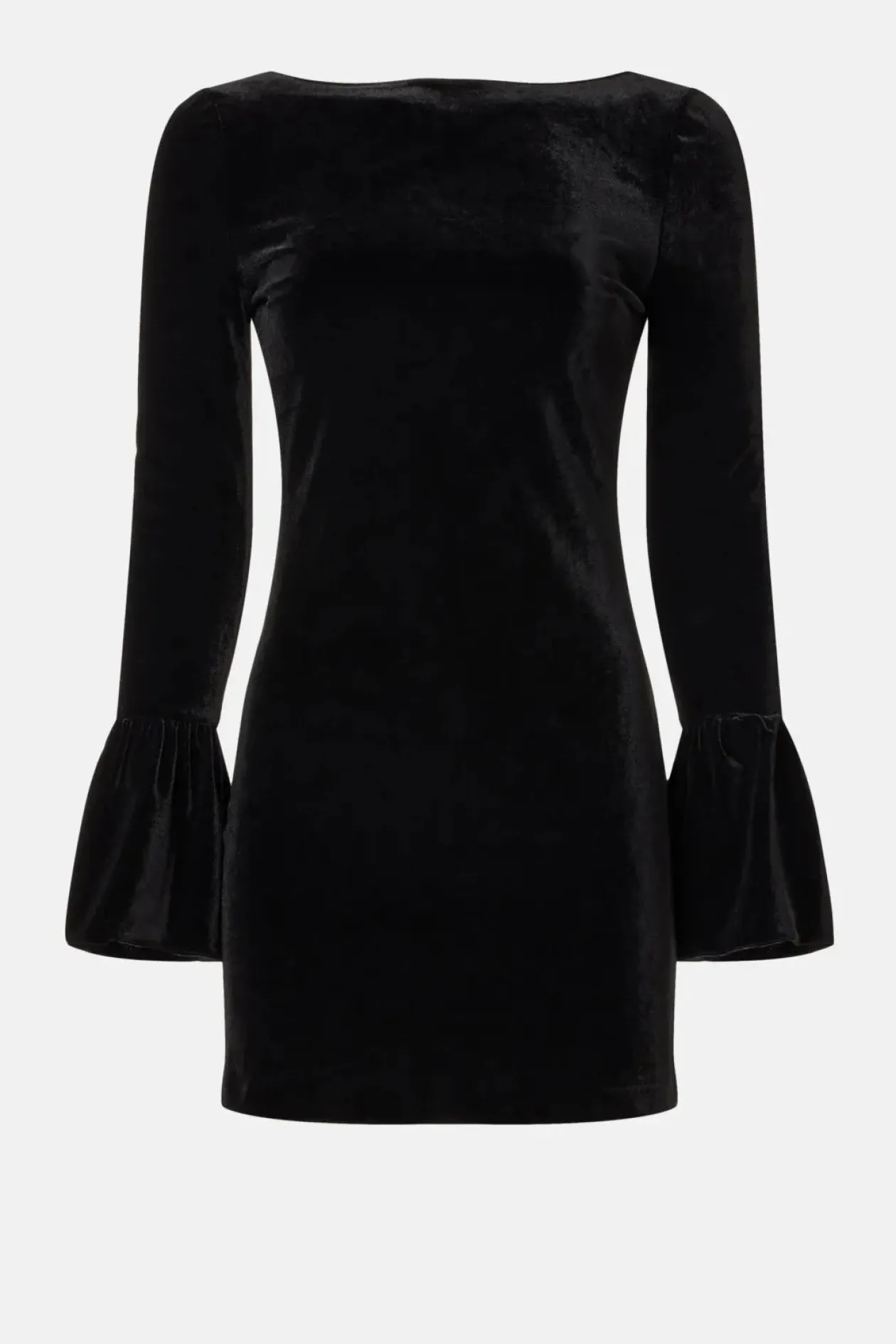 Black velvet (94% Polyester, 6% Spandex). Cocktail dress. Long sleeves with flared cuffs. Boat neck. Side zipper closure. 34.5″ from shoulder to hemline.
