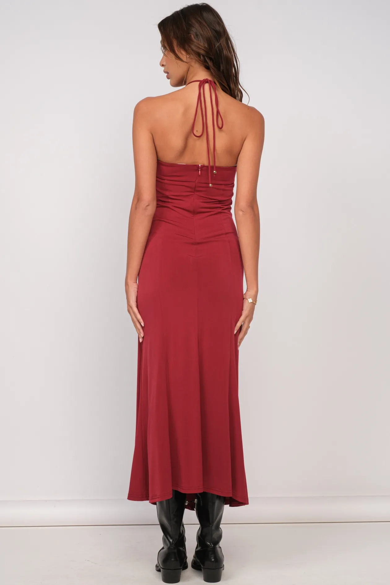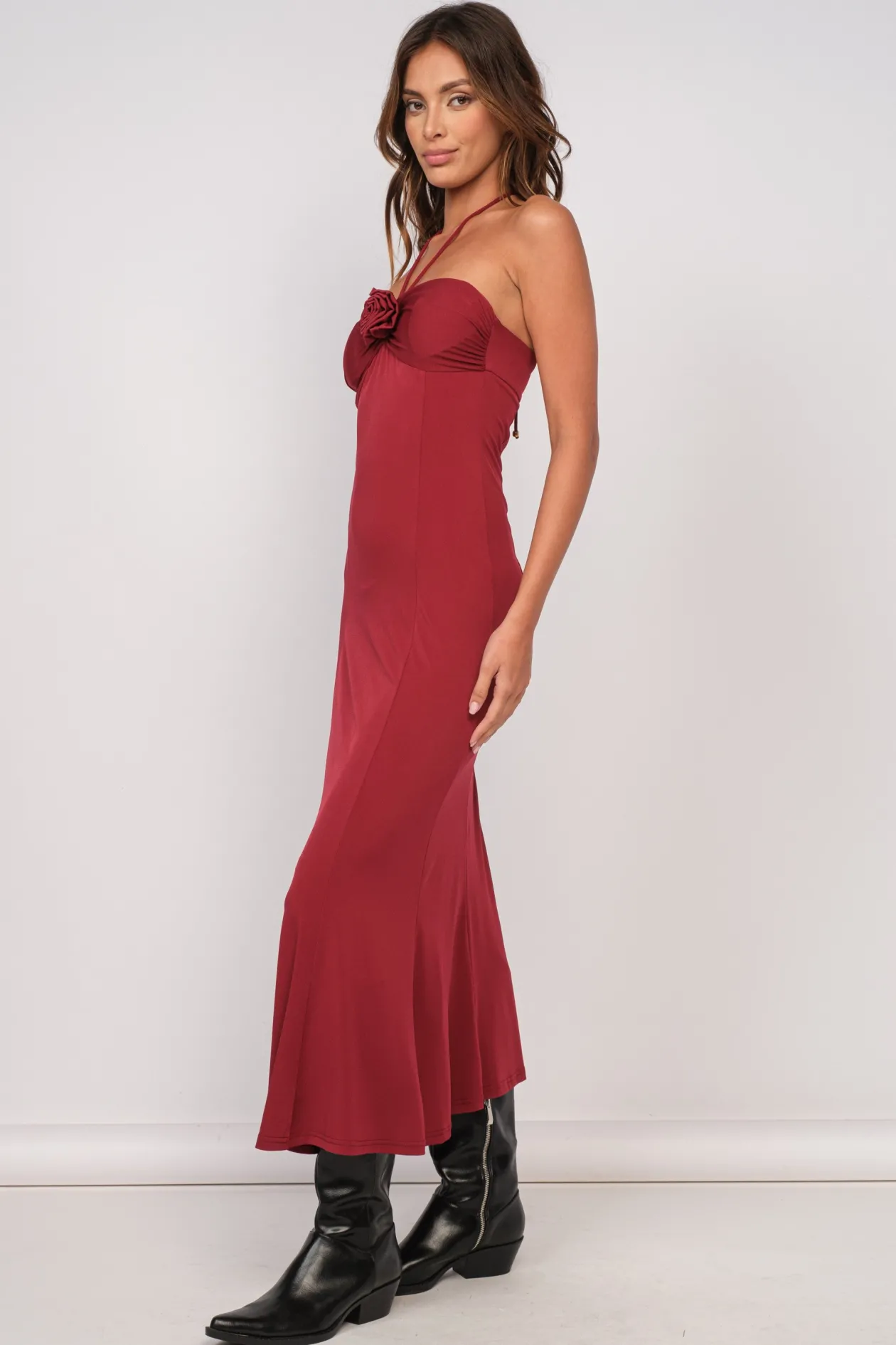 The Carolina Red Halter Midi Dress is a showstopper and perfect for the holiday season. Featuring a halter neck and rosette flower brooch at the bust.