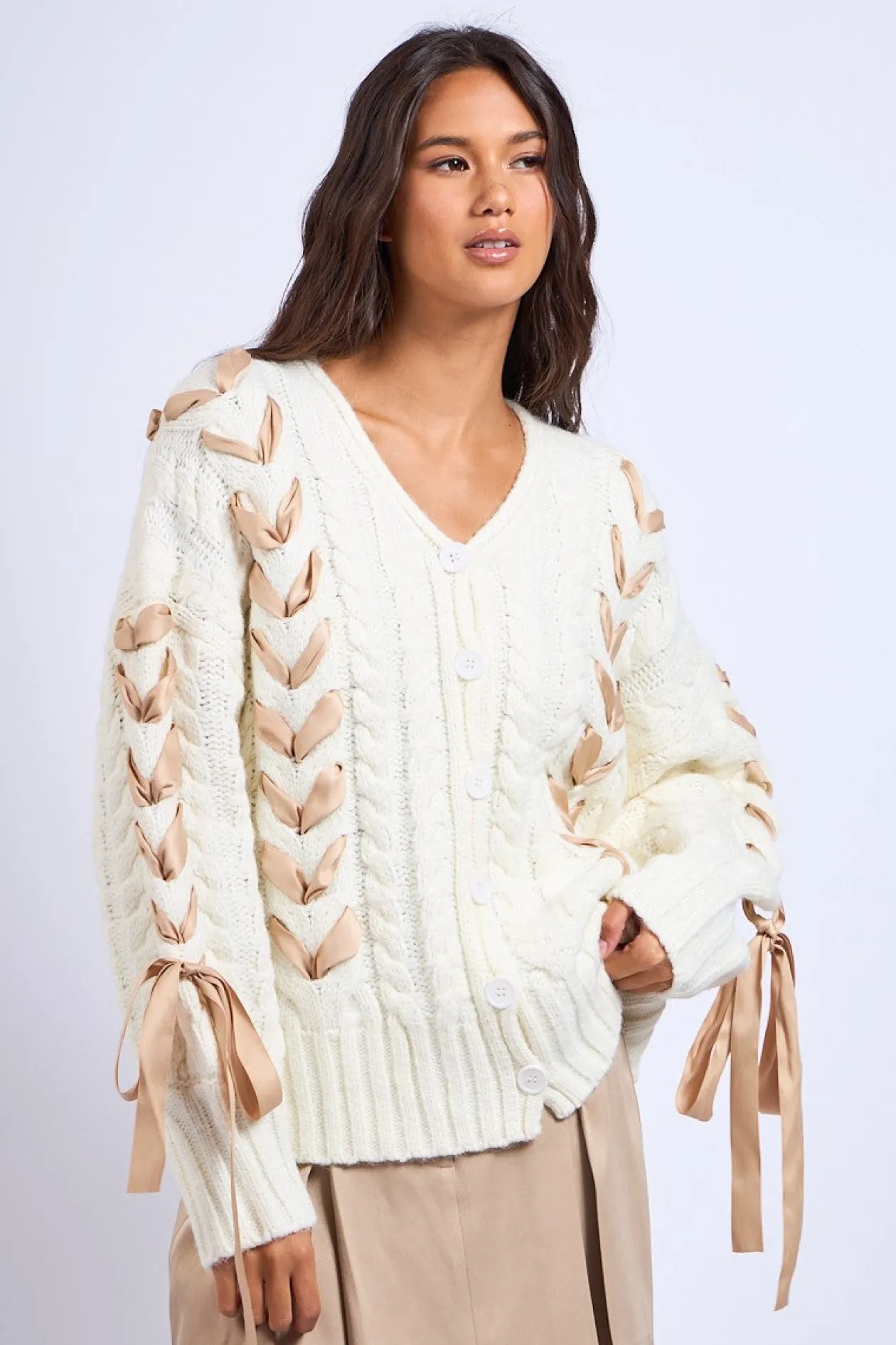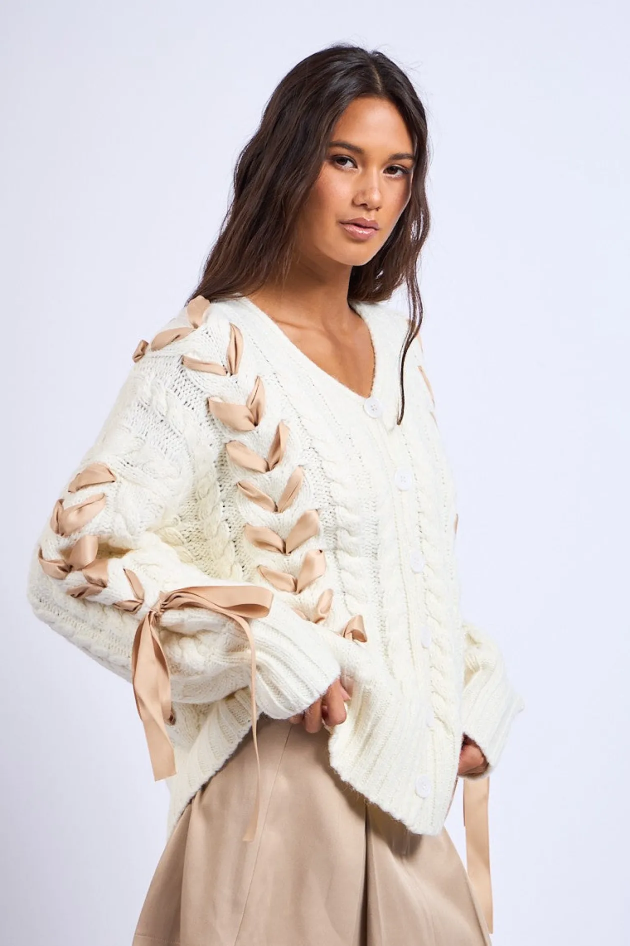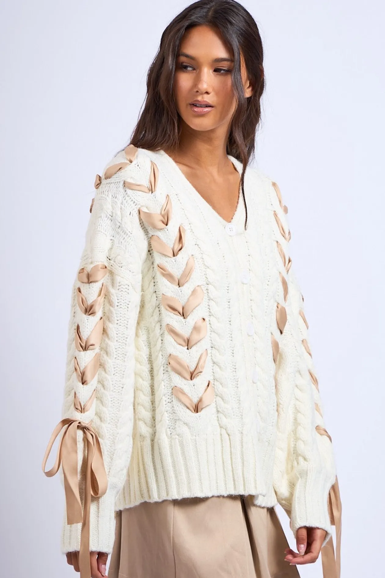 This ultra-cozy cardigan combines chunky knit warmth with delicate charm. Ribbon laces weave through the open front, adding a touch of femininity for a playfully stylish look.