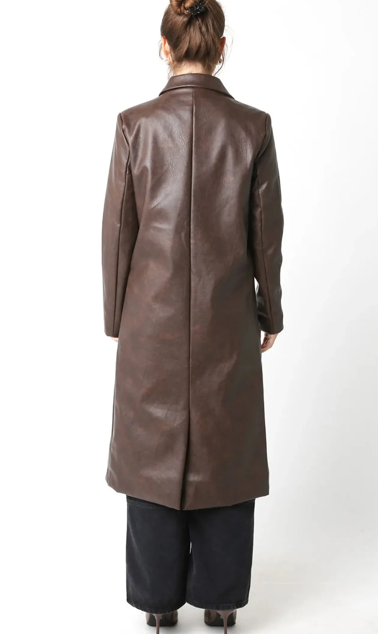 Our Drew Faux Leather Coat features long sleeves and a button closure in a dark brown.