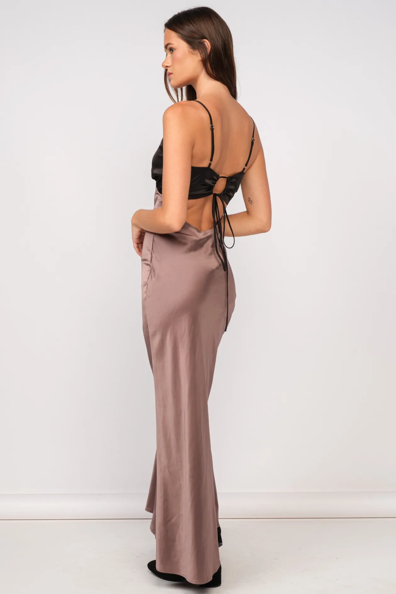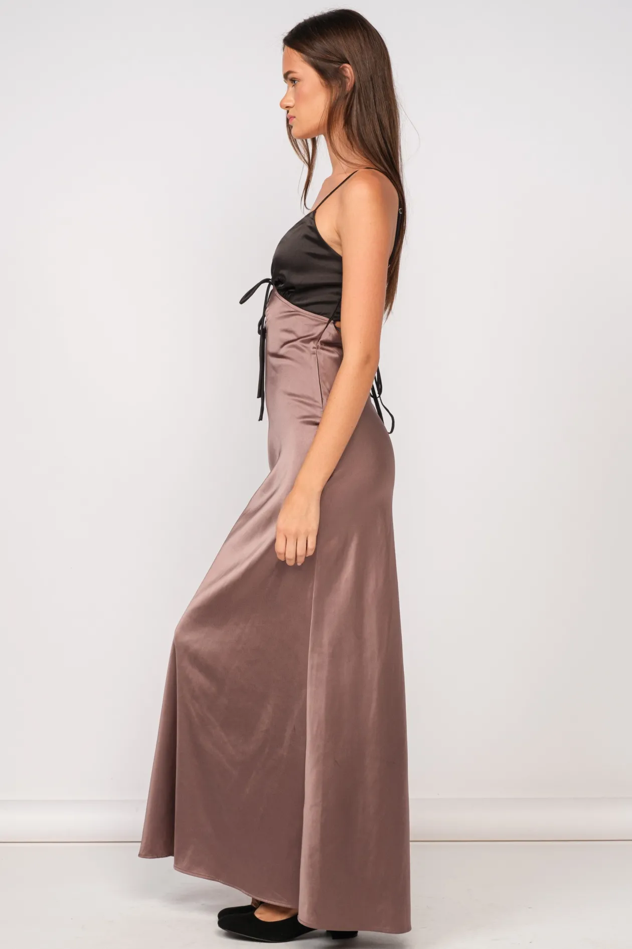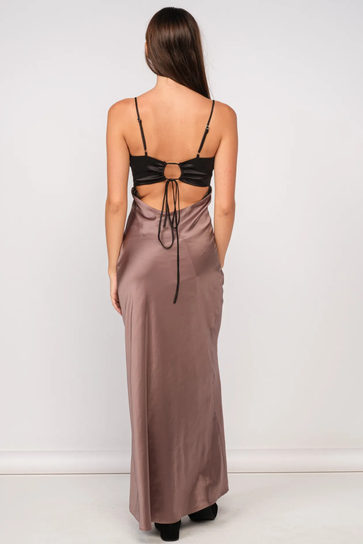 Our Elegant Colorblock Maxi Dress features satin contrast fabric, front tie with a cut out and tie in the back.