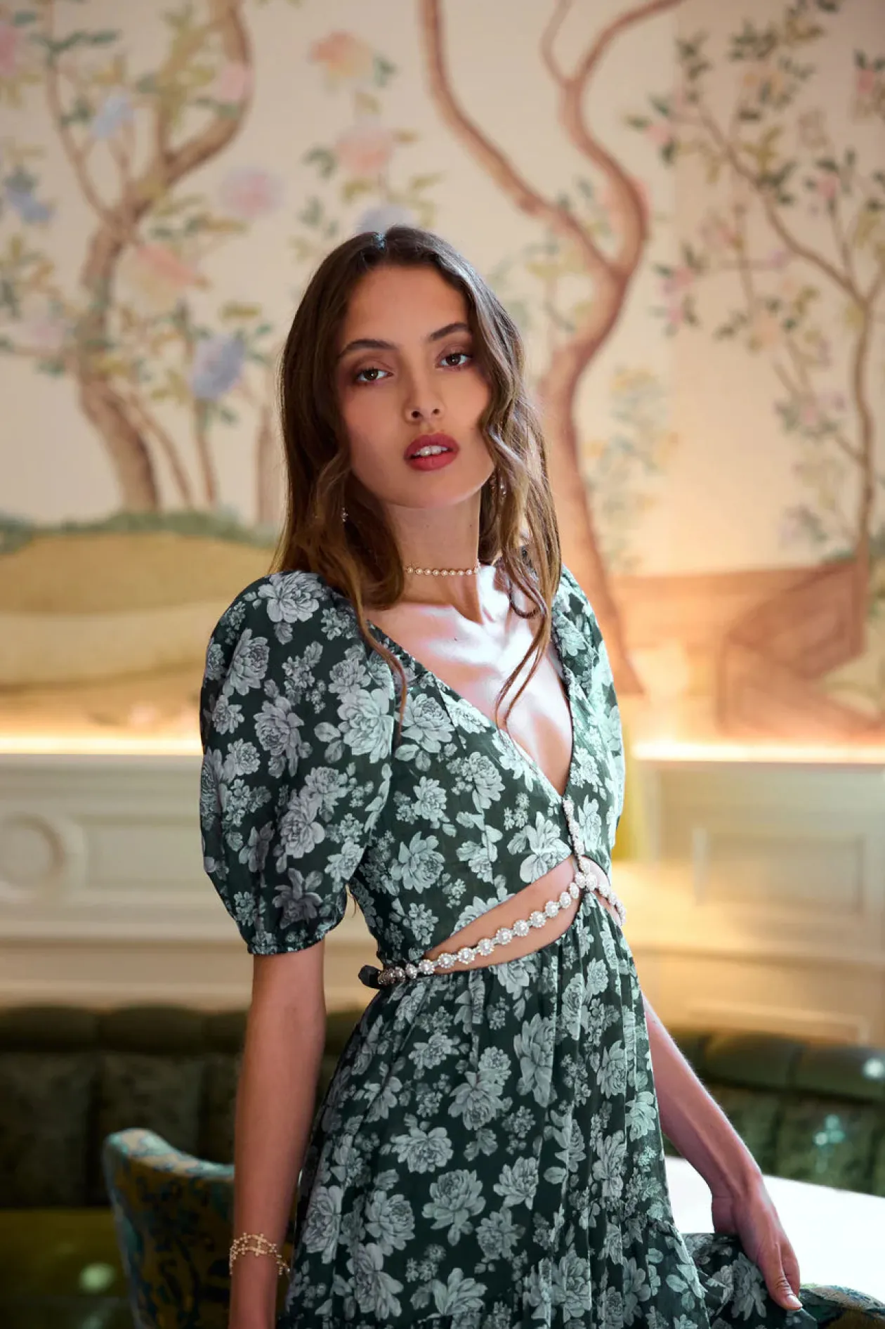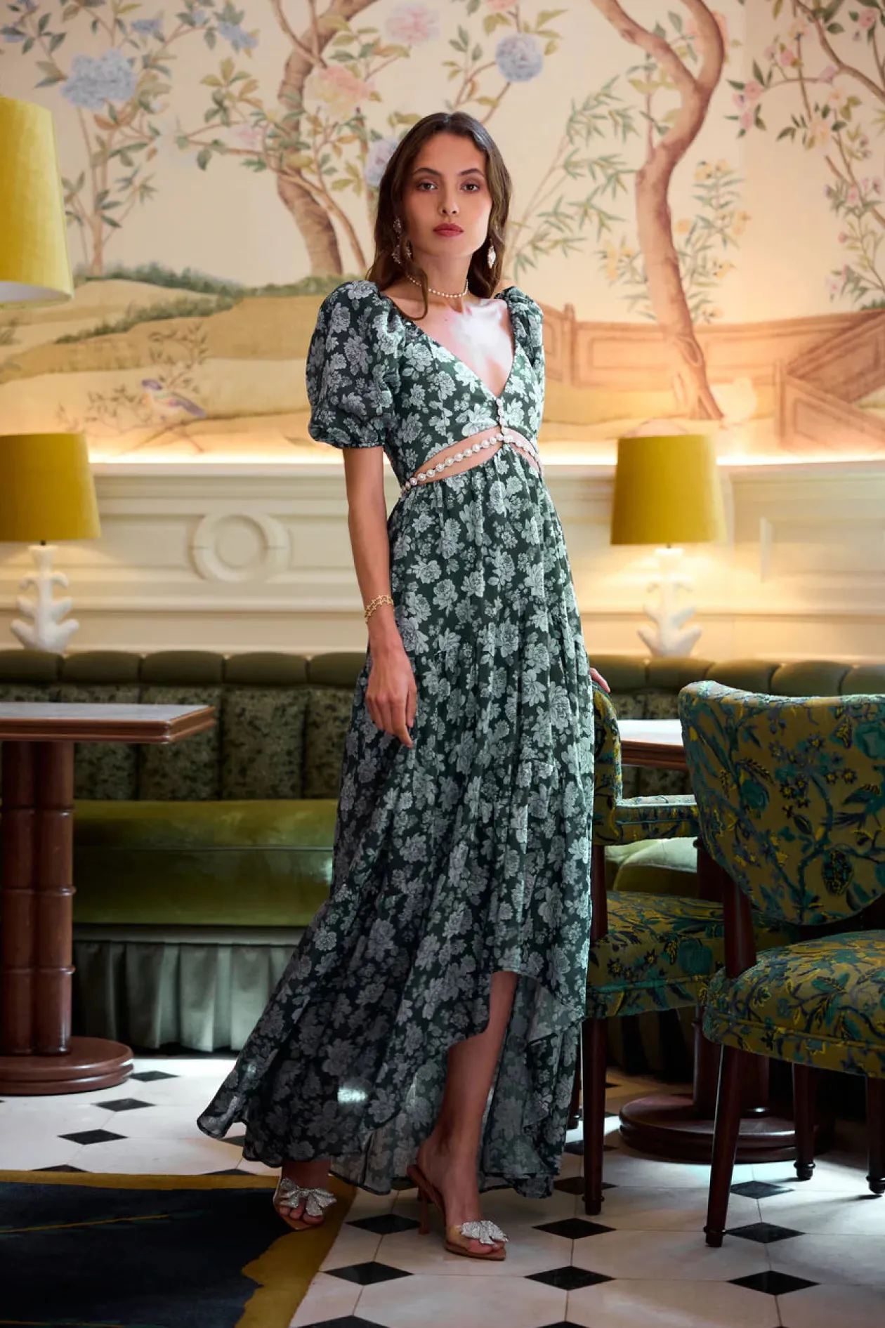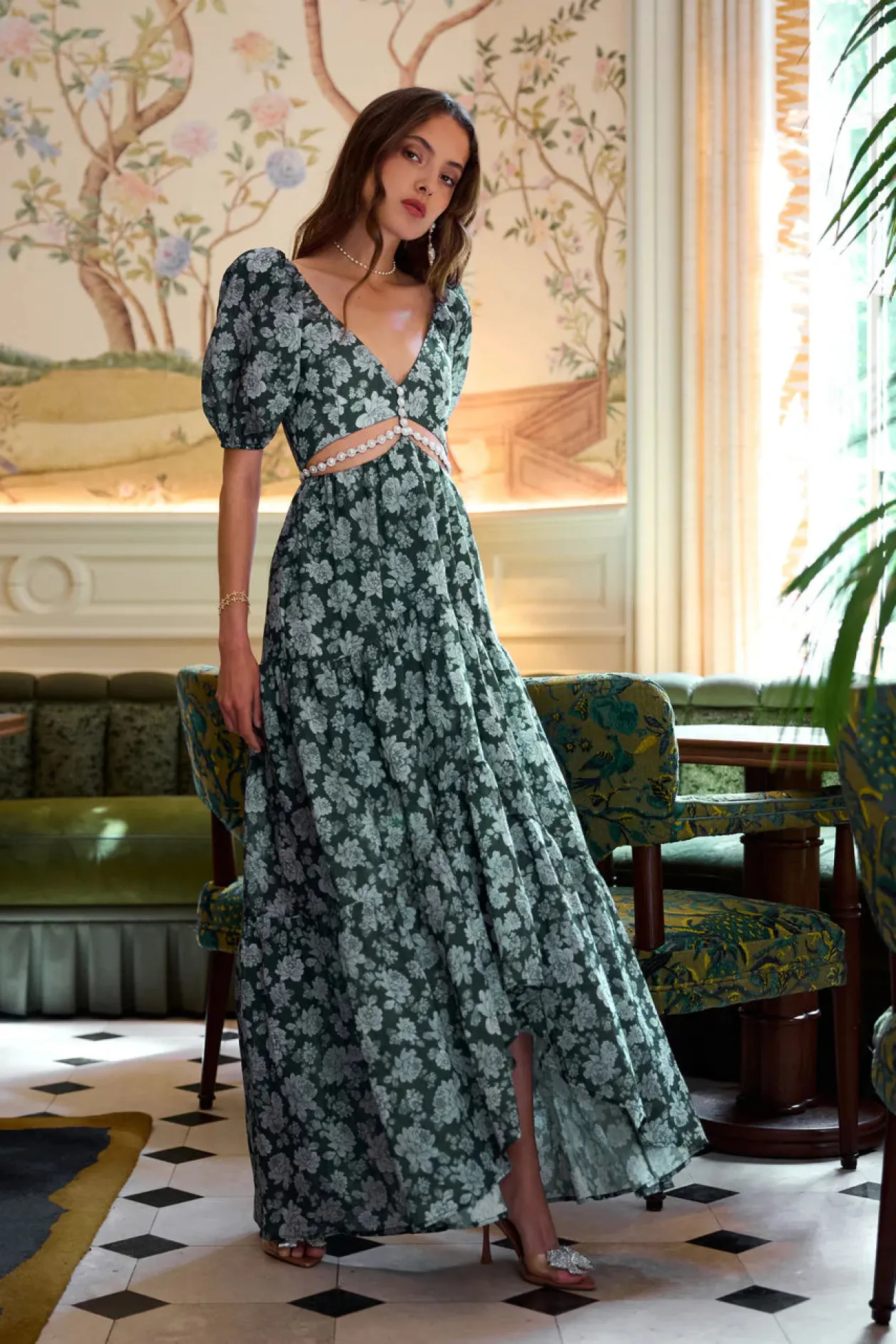 Meet Emma! She’s a full-length gown featuring a stunning cutout bodice, high-low hem, and embellished with ornate pearl and crystal beaded trim. Fall in love with sweet poof sleeves, side pockets, ruched back panel and zipper closure, and gorgeously gathered tiers. Made from our beautiful Emerald Peony Print linen, which features grey and green florals on a emerald green background, she’s truly a dream.