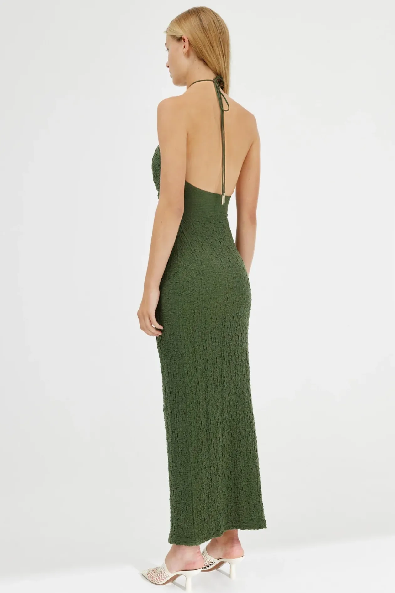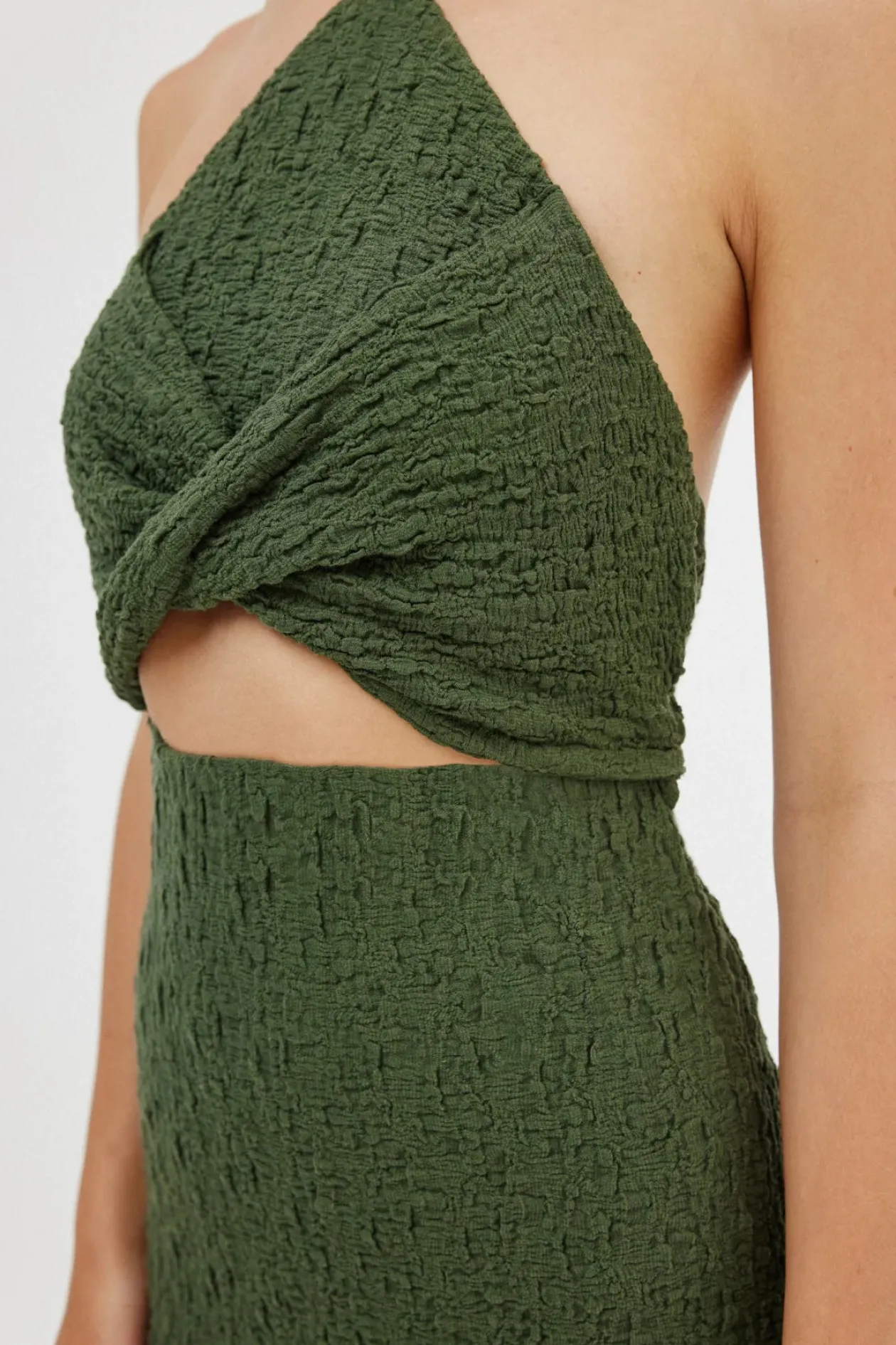 Understated elegance ~ the Esma Halter in Forest is crafted from a fresh crinkle inspired fabrication this season. Perfect for your events ~ this piece features a halter neckline, front bodice cut out and twisted detail through the bodice. Pair with a simple heel for a complete look.