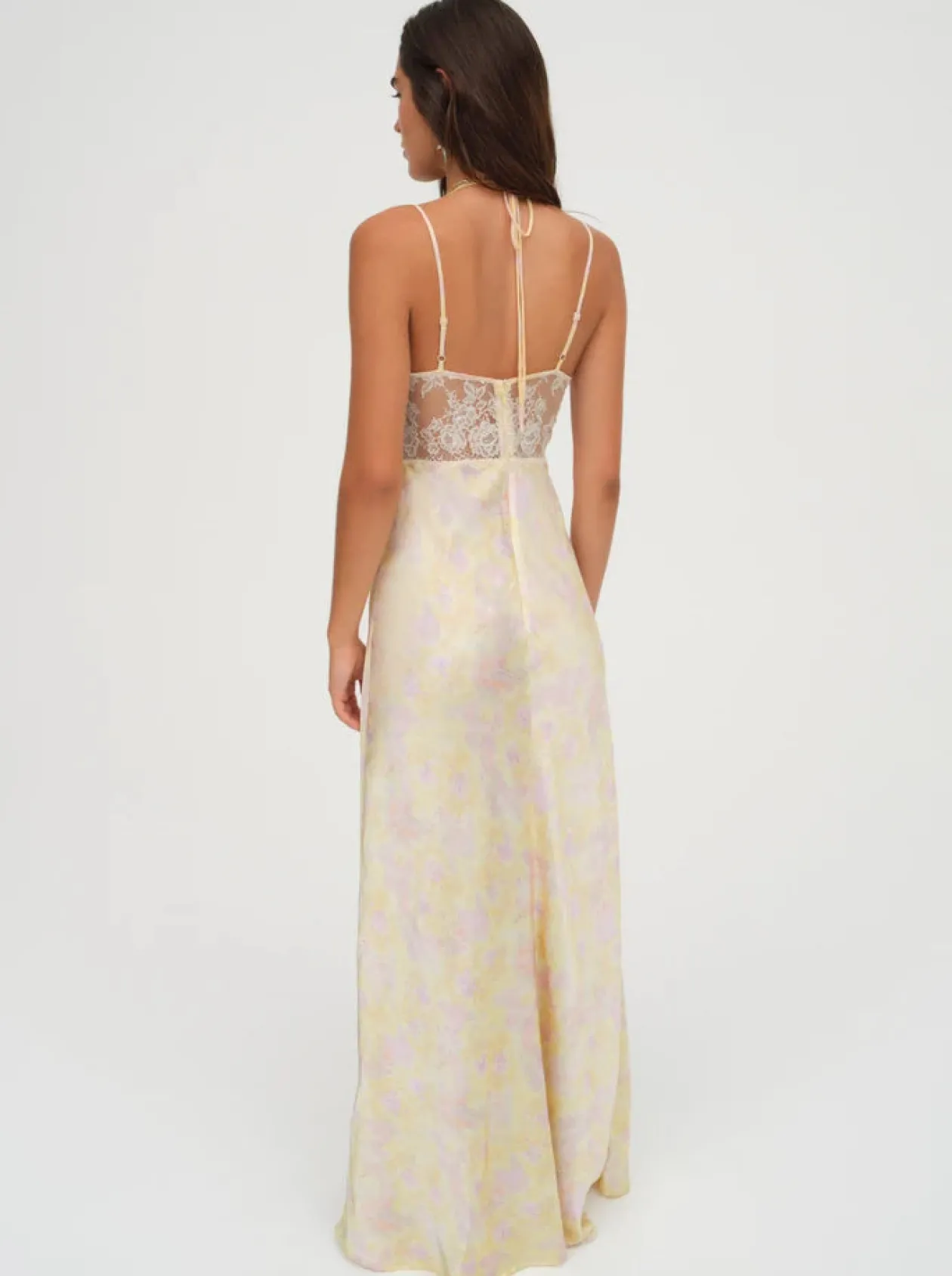 Live the ultimate fairytale in the Amora yellow maxi dress—the perfect long spring dress featuring a romantic smudged rose print and a sheer lace bodice.