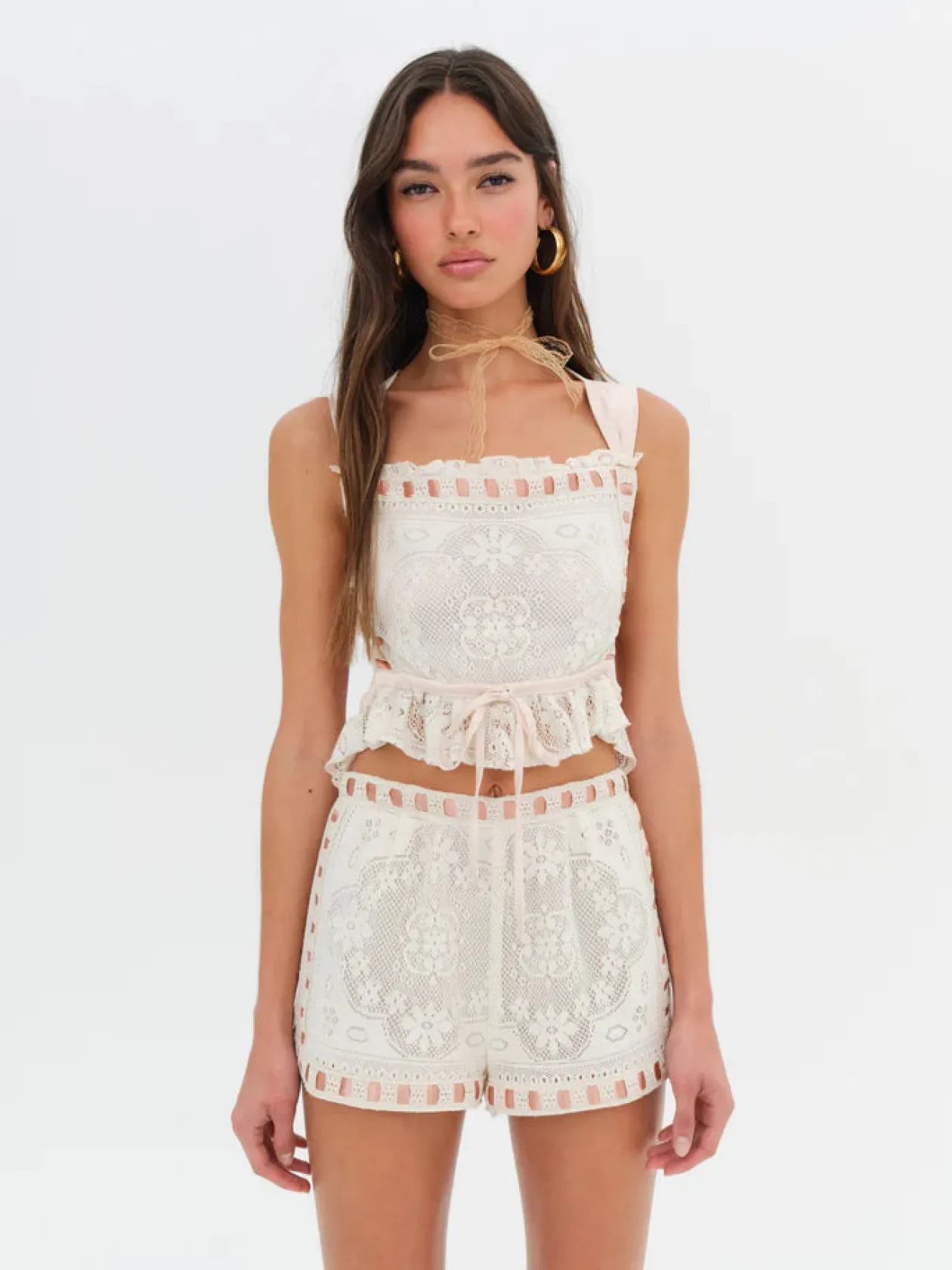 Inspired by vintage linens that dry underneath the Italian sun—the Charlotte cream lace shorts are crafted in intricate Sicilian lace with blush-hued ribbons woven throughout. These micro shorts have a cheeky fit and match to the Charlotte Lace Top.