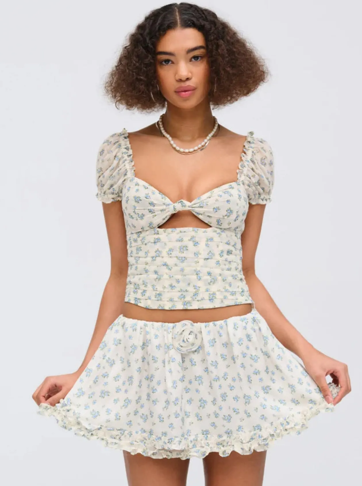Crafted in sultry chiffon, the Chateau blue top is designed for the modern muse who lives inside a world of her own. Featuring a tiny blue flower print, this floral top showcases elasticized puff sleeves that ruffle at the edges and a ruched bodice with twisted knot at the bust. Pair it with the Chateau Mini Skirt for a co-ord skirt set.