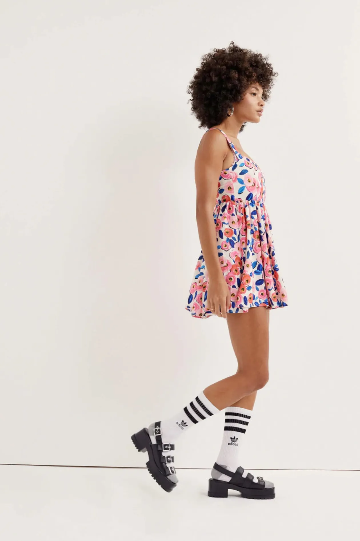 Vibrant mini dress featuring a rose drop print and a built-in underwire bra. Sweetheart neckline, low open back. Hidden zipper, hook-and-eye closure at back. Partially lined.