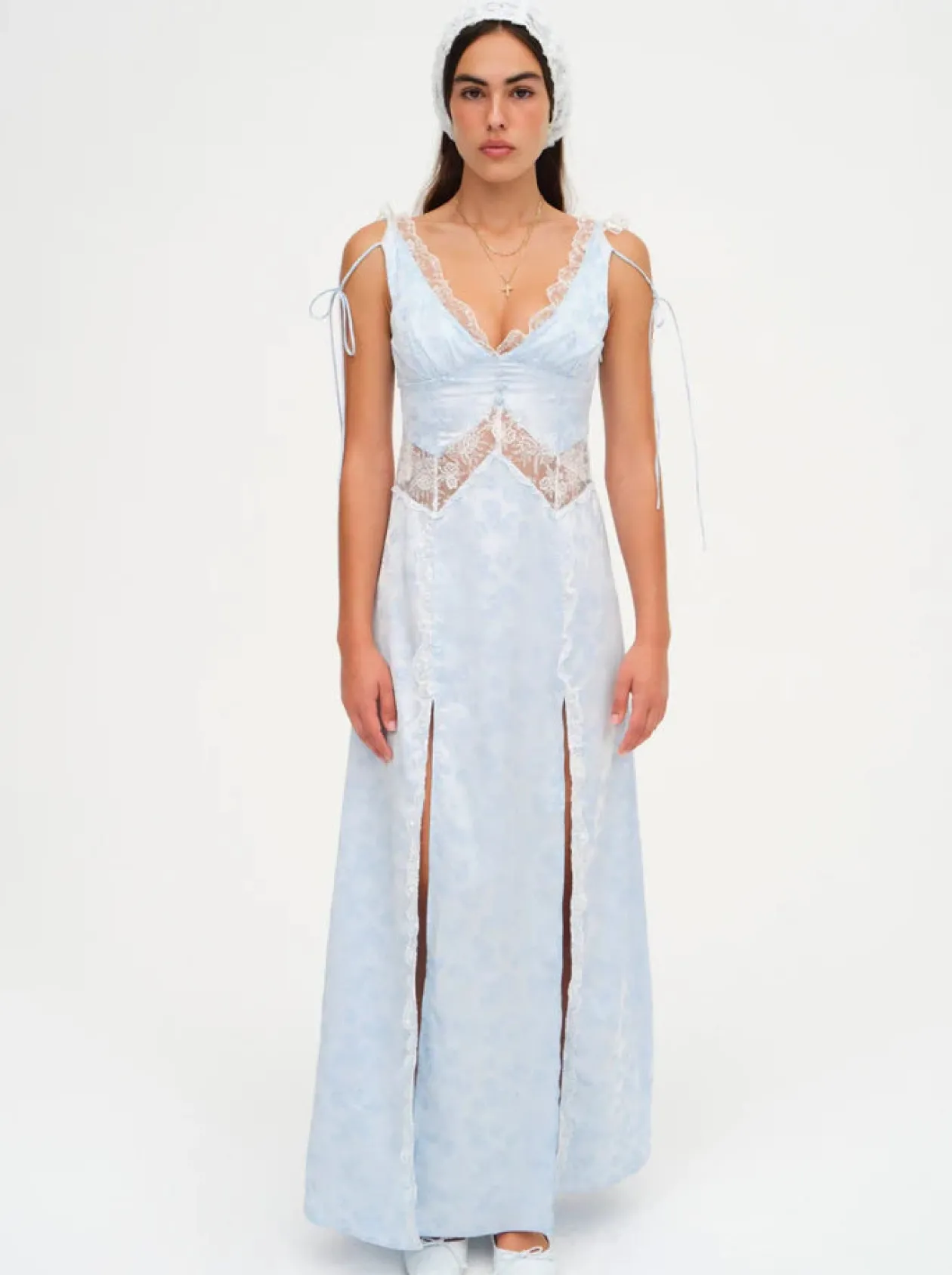 Run barefoot in the wildflowers in the romantic Hattie blue maxi dress—a striking jacquard dress with a whimsical French toile swan print and inset lace trims at the waist and skirt.