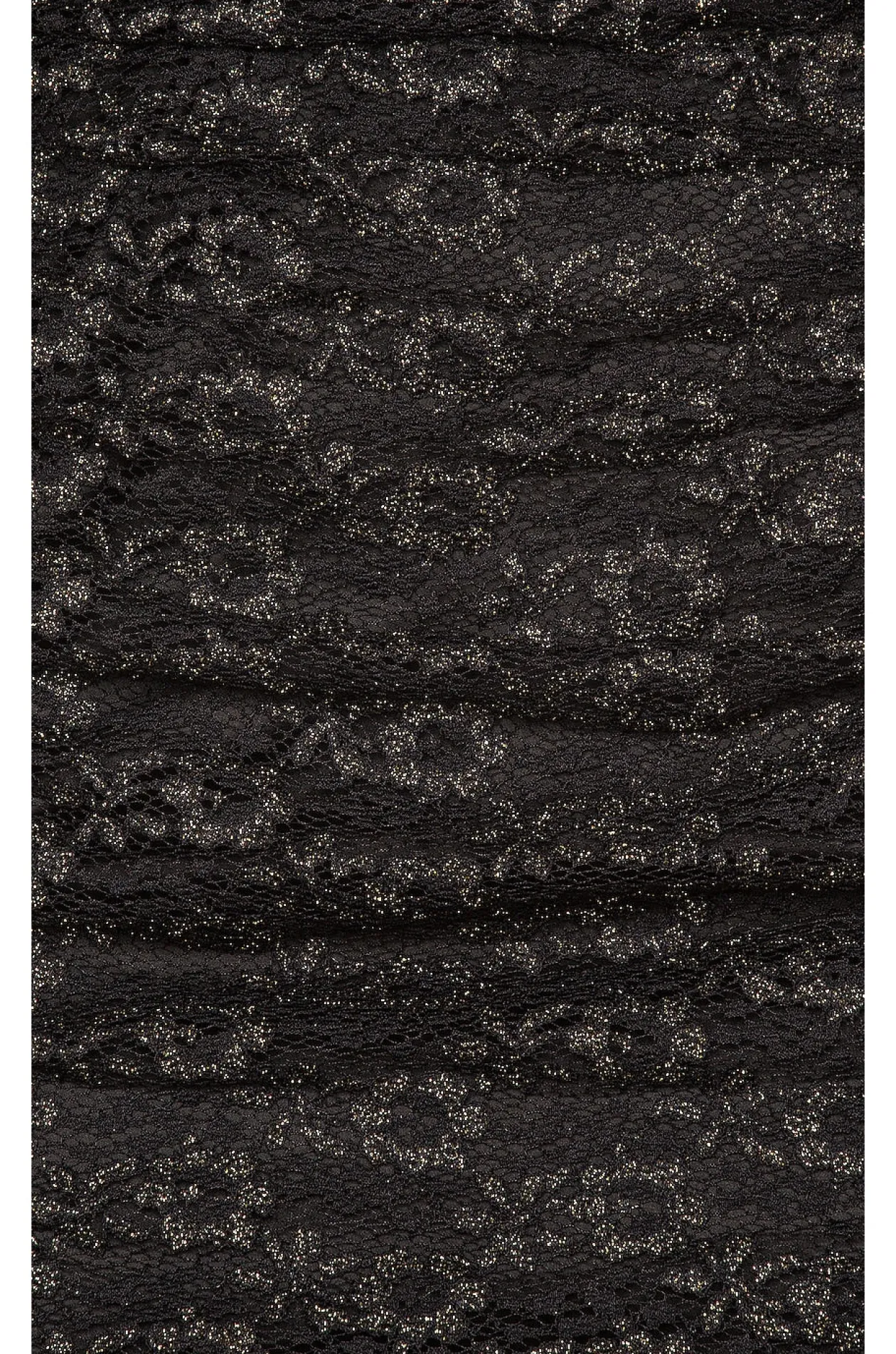Fully lined. Hidden back zipper closure and adjustable ruched sides. V-wired front and lightly padded cups. Lace fabric with lurex detail.