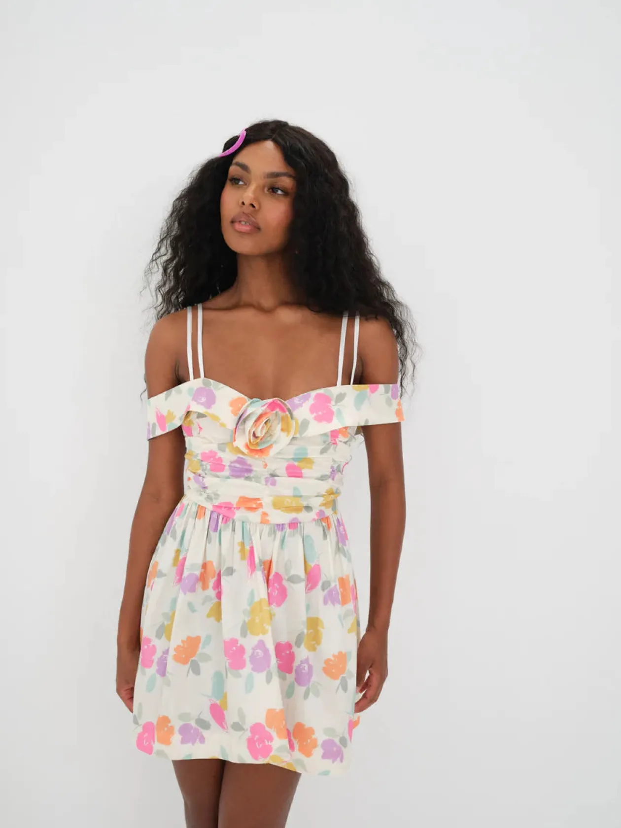Florals worth crushin’ over. Tossed floral taffeta mini dress with a gathered bodice, full skirt, and off the shoulder neckline.