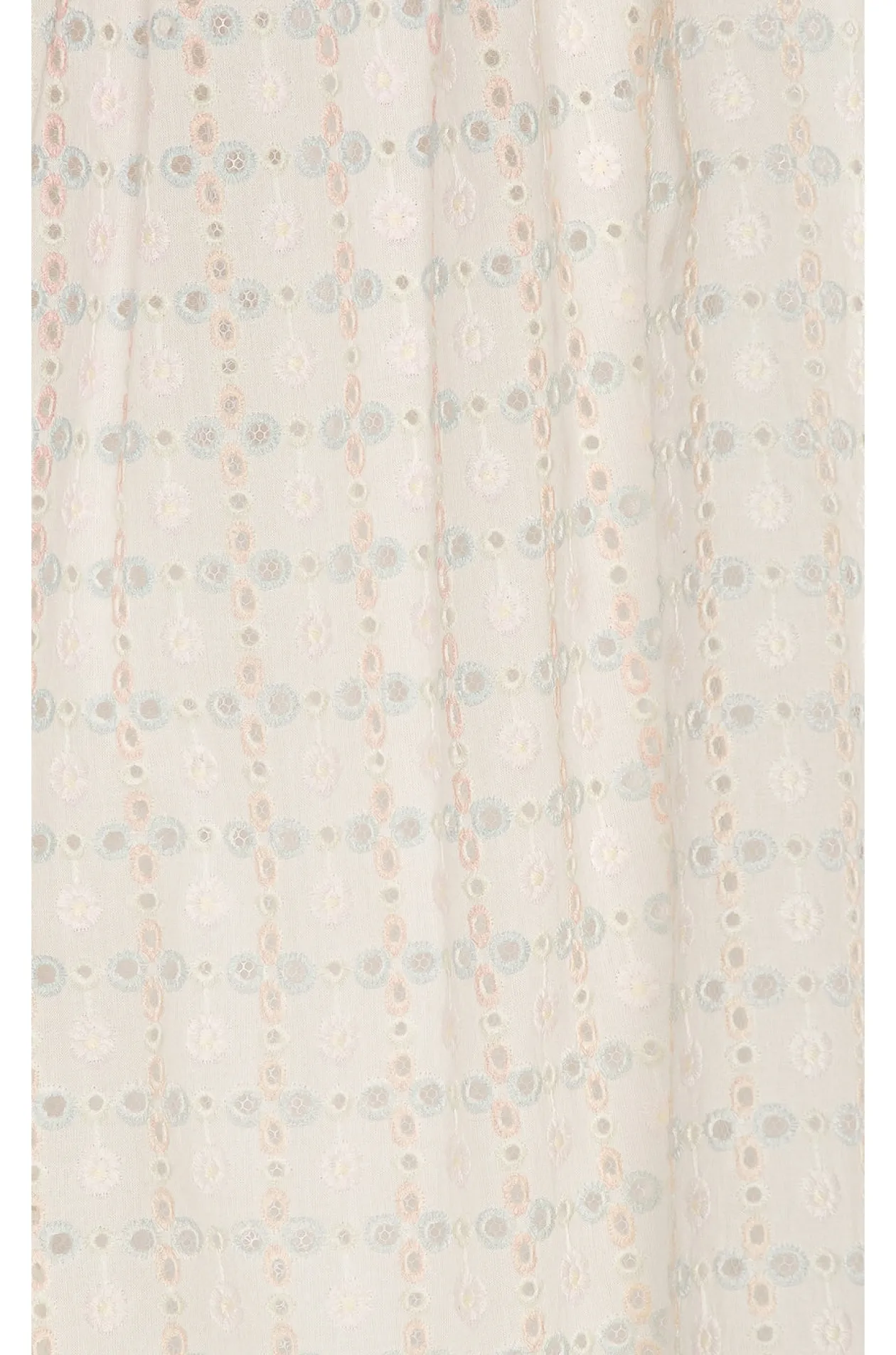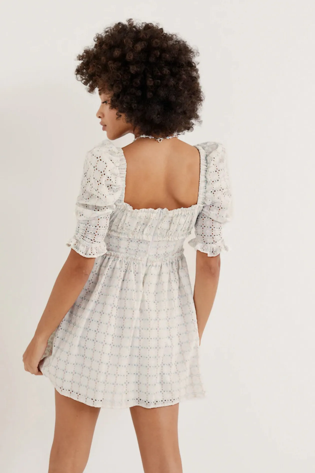 Libby is an airy mini dress featuring daisy eyelet embroidery, shirred detailing at the bust, short gathered sleeves and full skirt with a delicate ruffle at the waist. Fabric is an embroidered eyelet non stretch woven made from tencel.