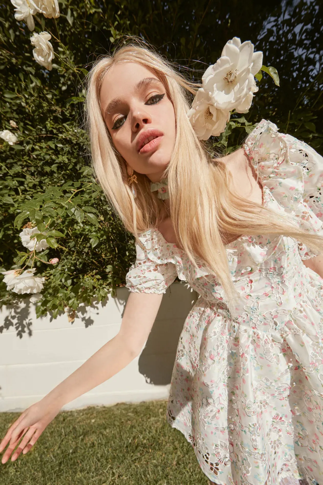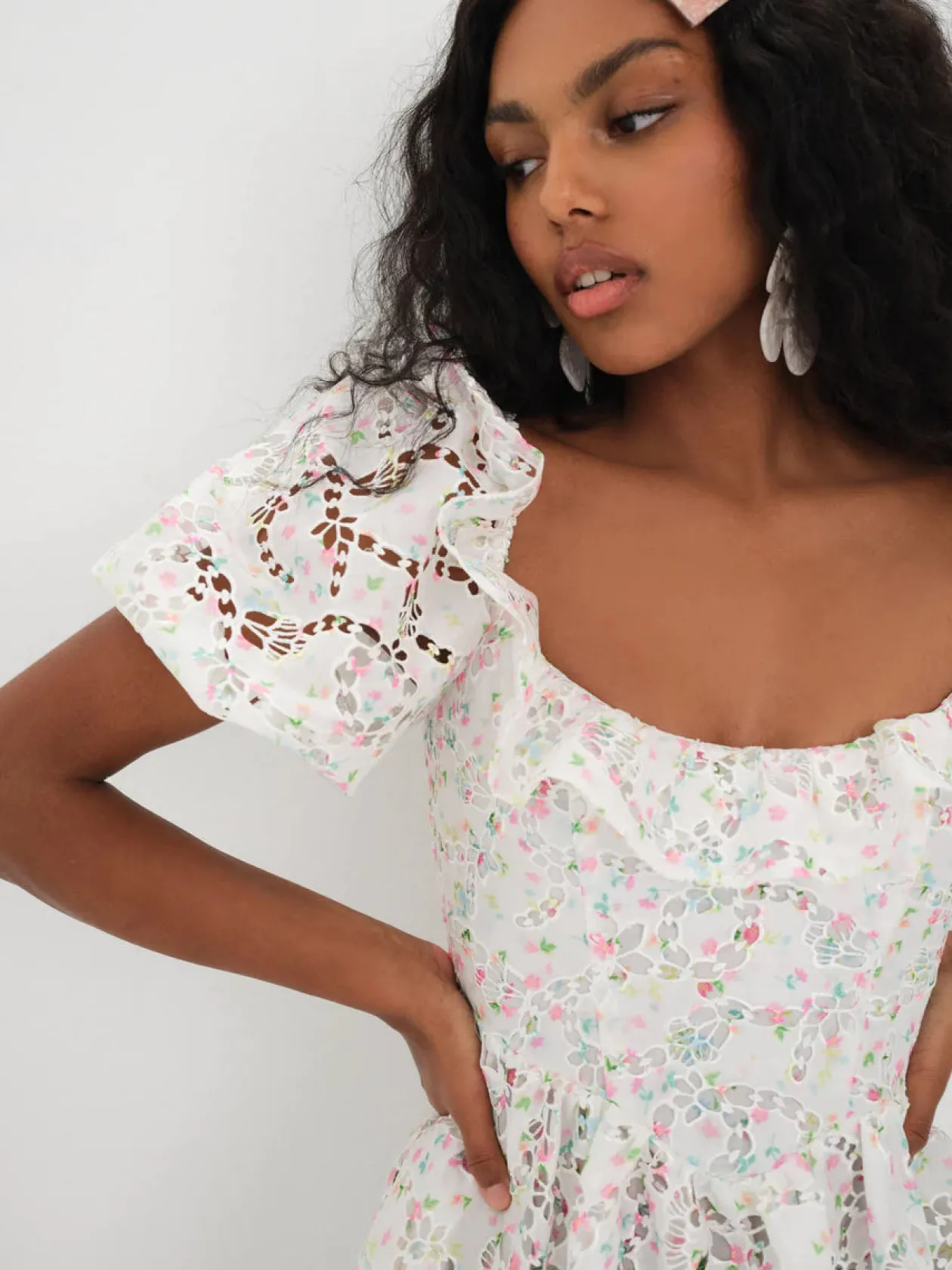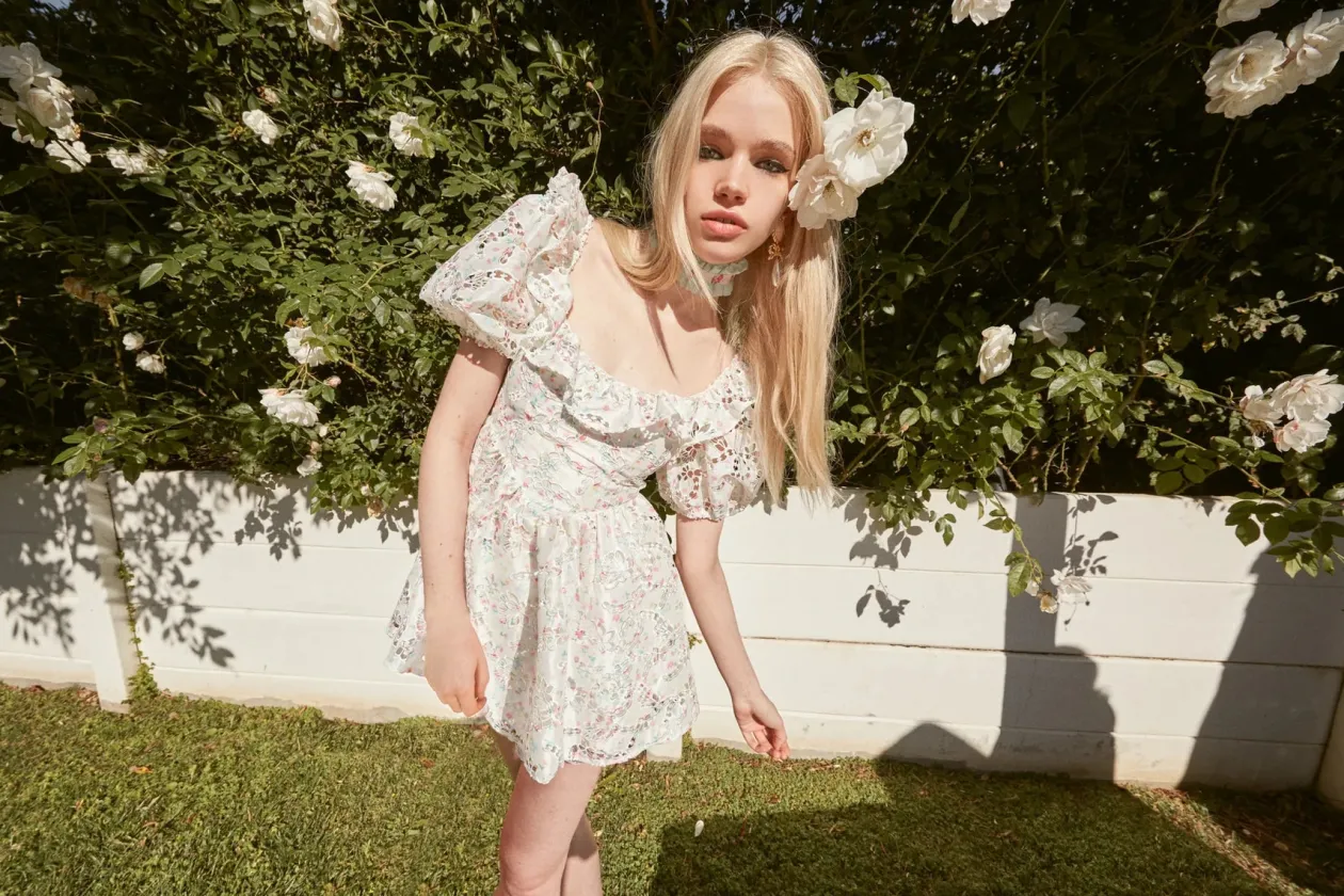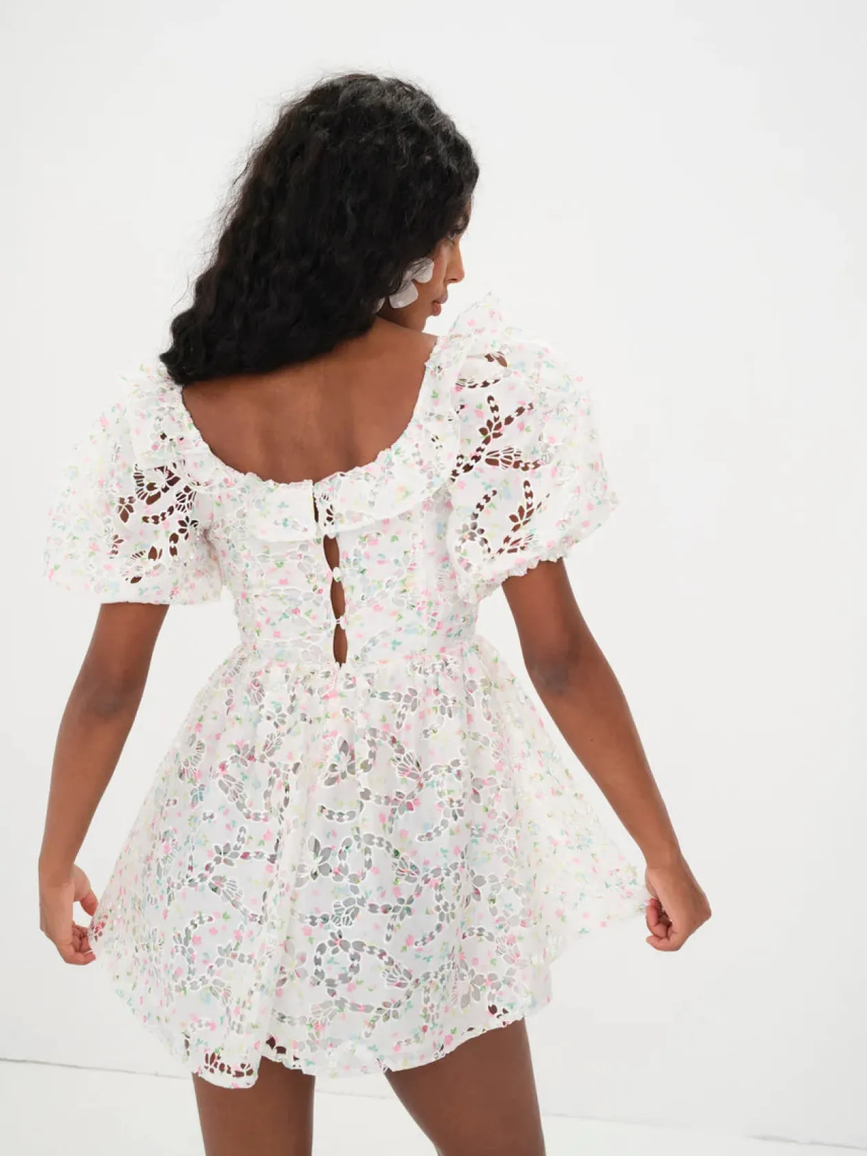 Laser-cut, printed taffeta has a unique, lacy look on this mini style. Complete with a wide scoop neckline with ruffle, puff sleeves, and a full, gathered skirt.